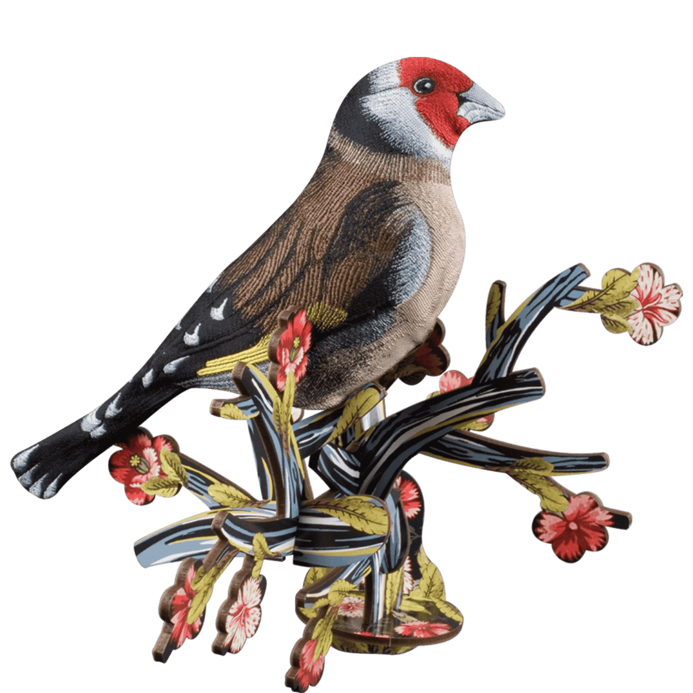 Uccellino in tessuto “Red Baron”, stile cardellino. Confezionato piatto, facile da montare. Ideale per librerie, pareti o regali eco e stilosi. Made in Italy.