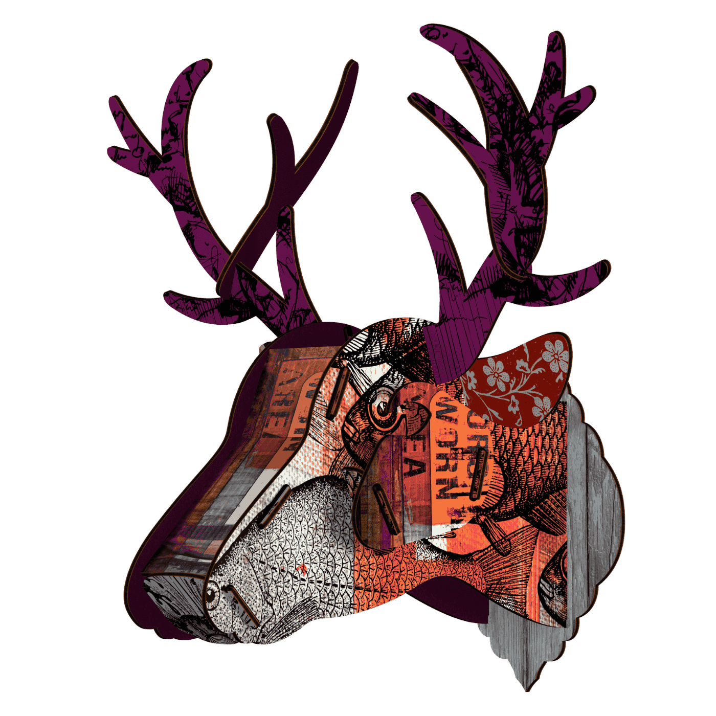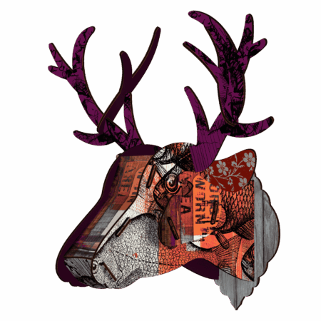 Cervo decorativo medio da parete “Purple Branch” in cartone ecologico. Un pezzo dal forte impatto visivo che unisce design e rispetto ambientale. Facile da montare, adatto ad ambienti urban e ironici.