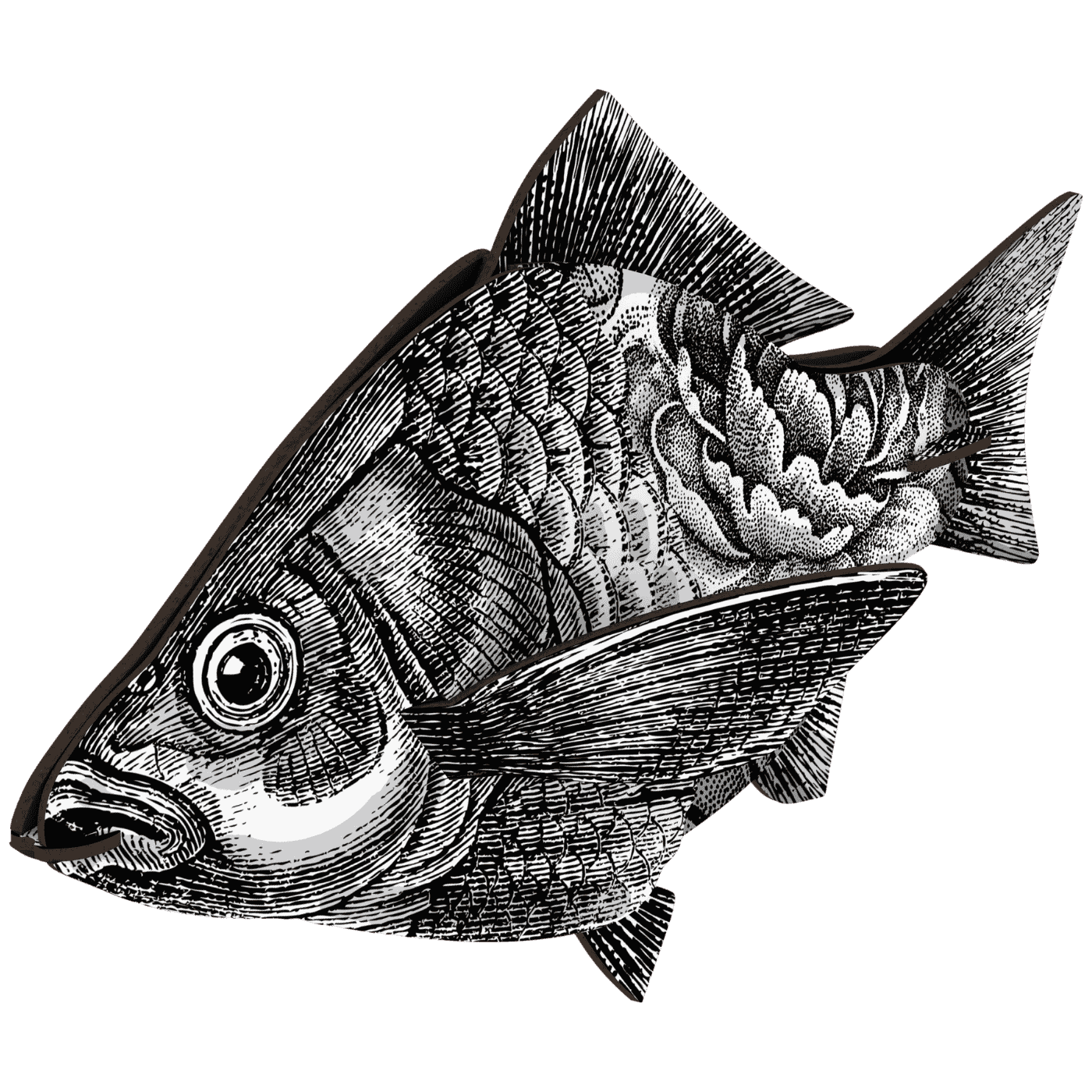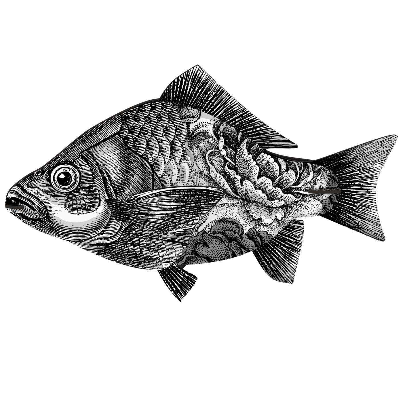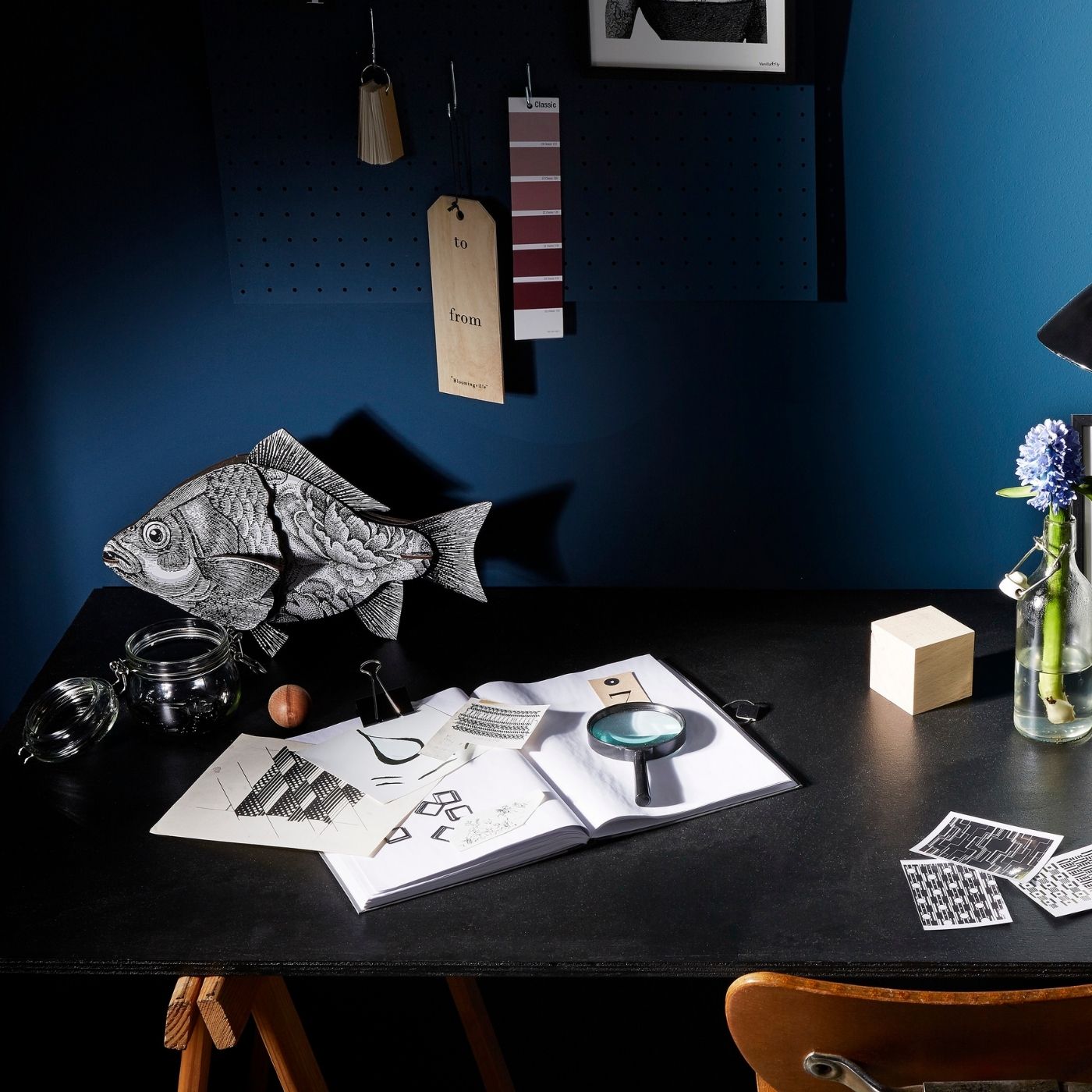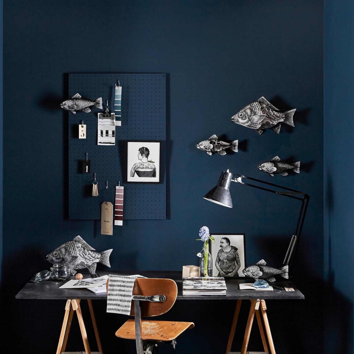 Pesce décor “The Entrepreneur” in versione large. Linee moderne e spirito ironico. Realizzato in legno riciclato e vernici atossiche. Per pareti creative e dinamiche.