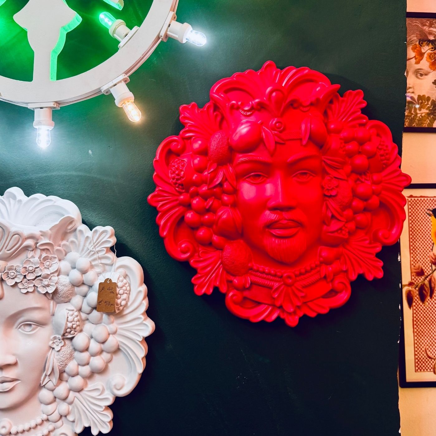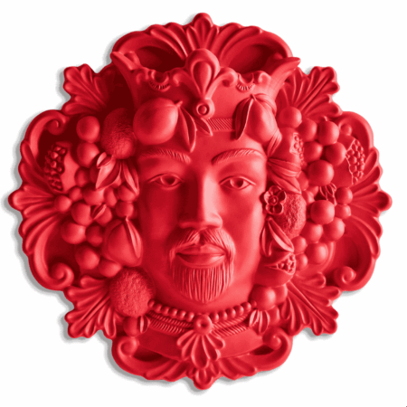 Re testa di moro in resina color rosso, formato grande (40 cm) in bassorilievo da parete. Un oggetto d’arredo ricco di simbolismo e stile siciliano. Dona calore, forza e unicità agli ambienti moderni o eclettici.