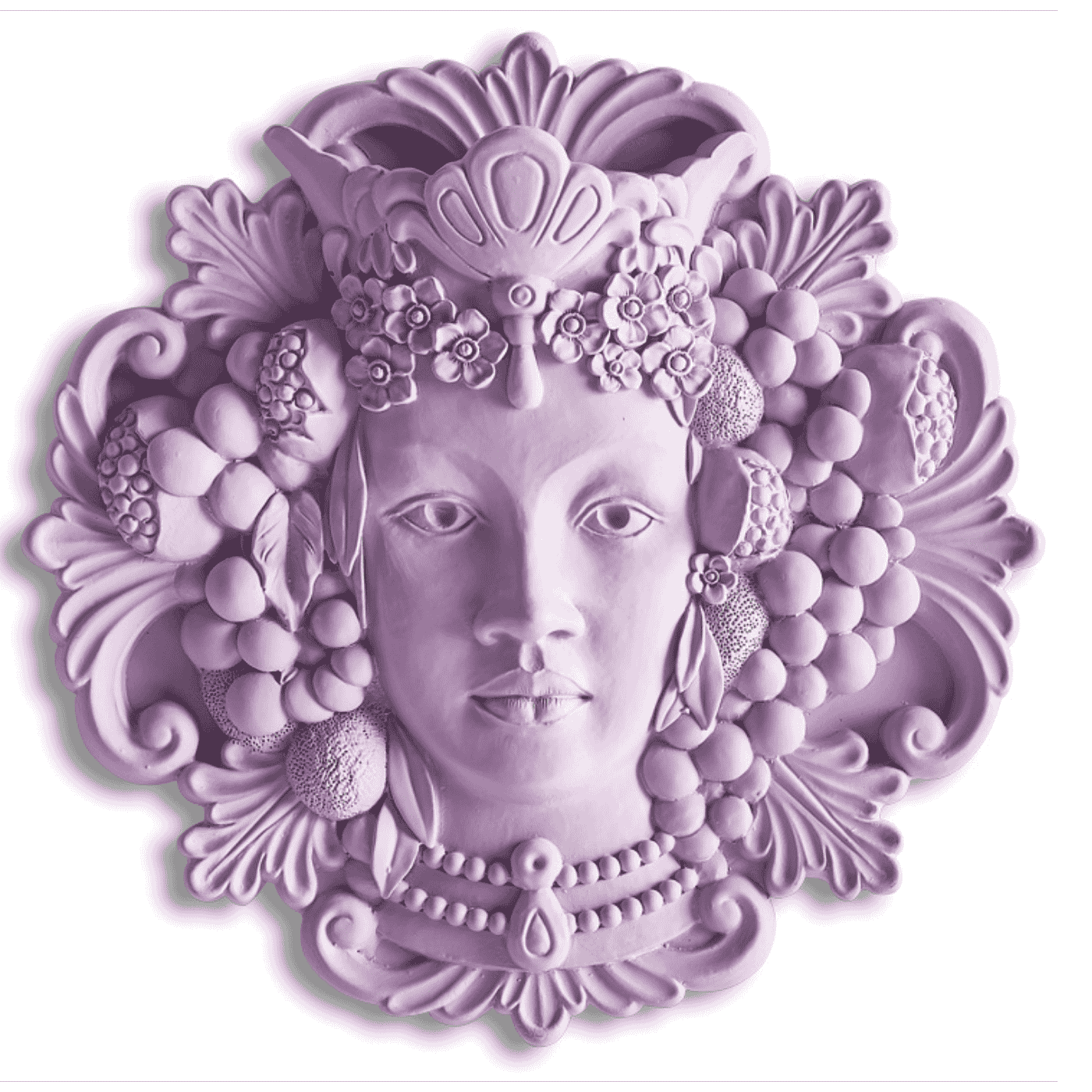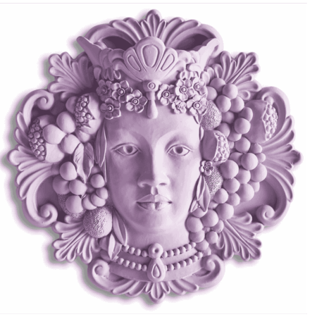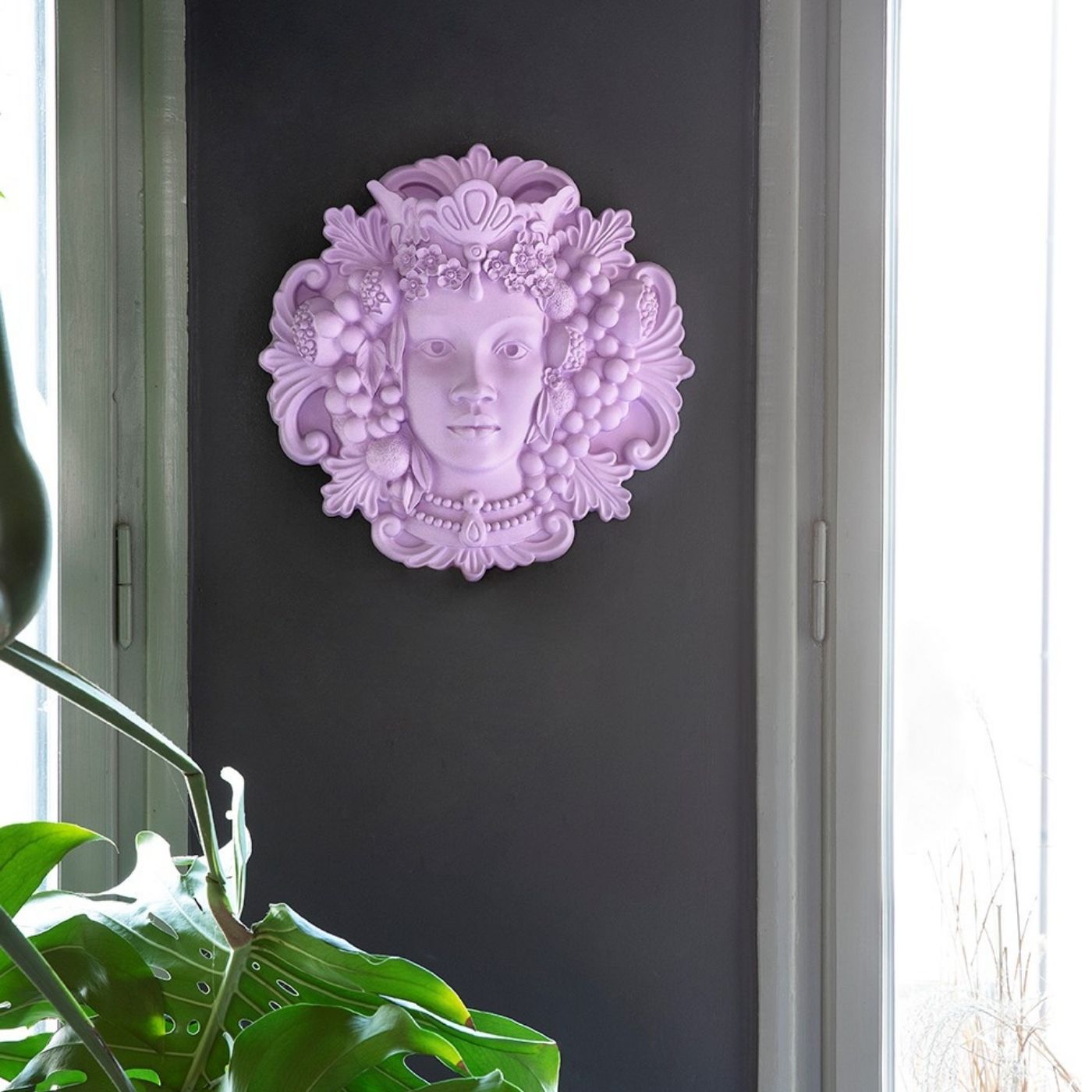 Regina testa di moro lilla in bassorilievo, realizzata in resina. Design delicato e femminile con finitura satinata, ideale per ambienti soft e contemporanei. Perfetta come decorazione murale artistica ed evocativa.