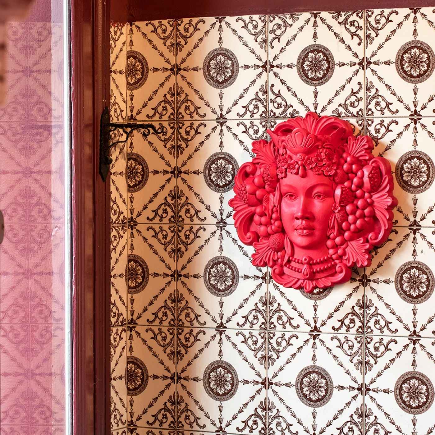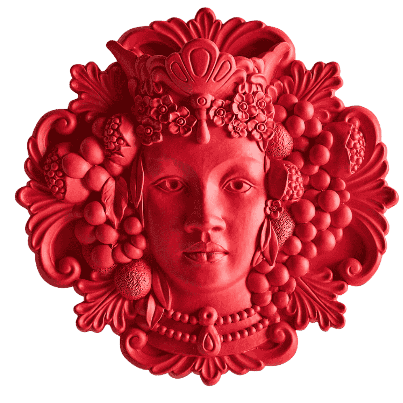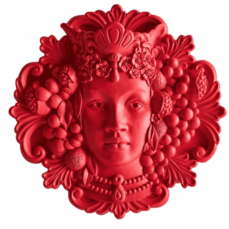 Regina testa di moro rossa in bassorilievo da parete. Un richiamo alle radici culturali del Sud Italia, reinterpretato in chiave moderna. In resina, finitura opaca, ideale per ambienti colorati, etnici o contemporanei.