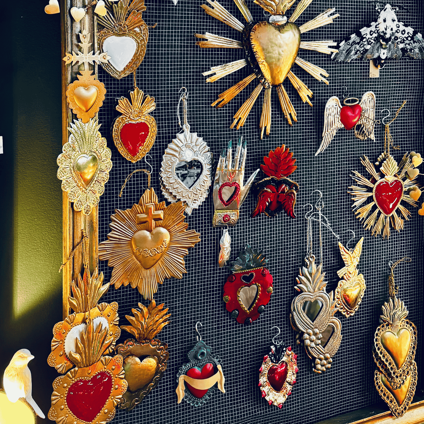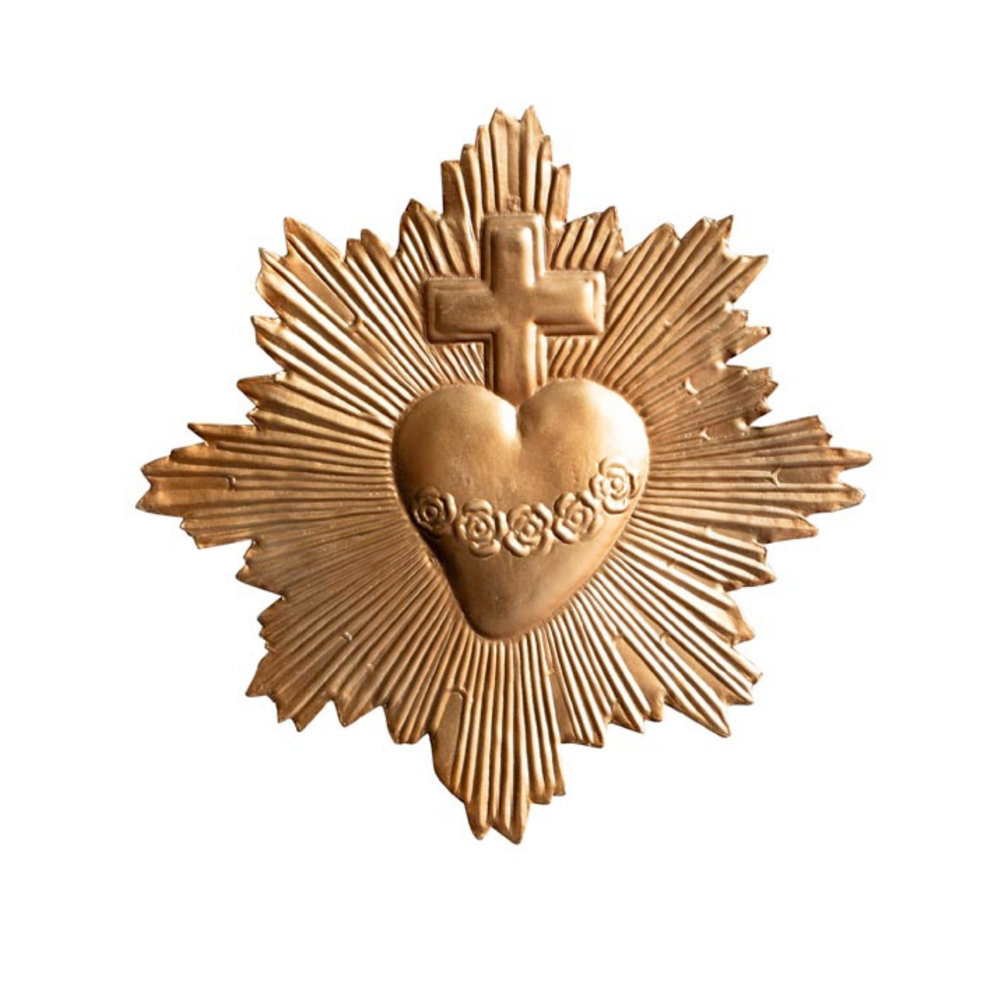 Cuore Ex-voto dorato con croce e raggiera, realizzato in ferro. Una decorazione sospesa dal forte valore simbolico, perfetta per pareti evocative e per chi ama oggetti dal sapore spirituale e retrò.