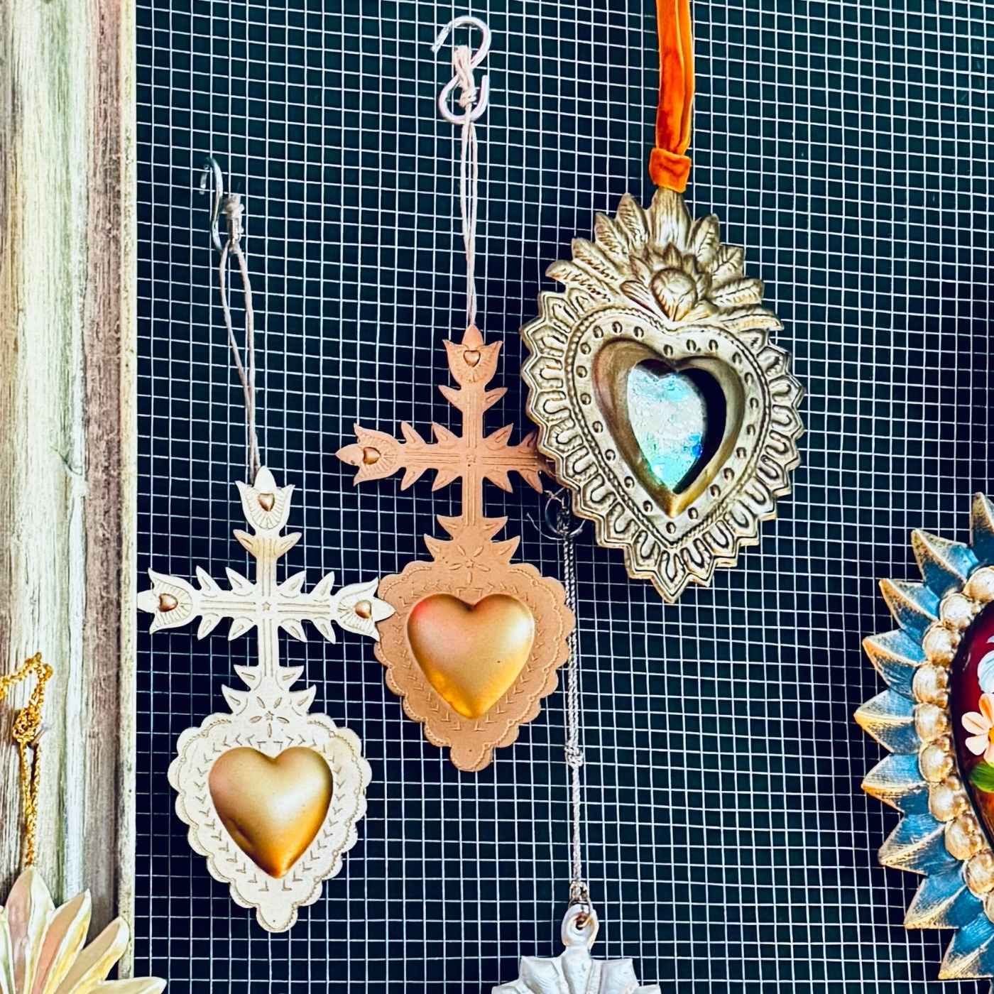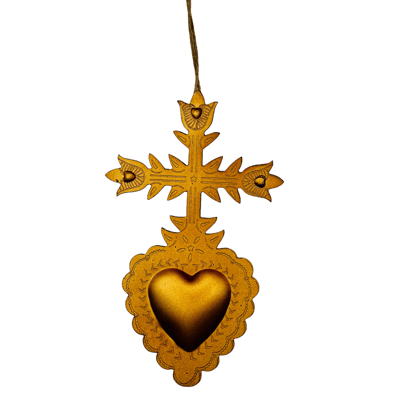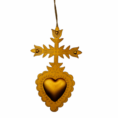 Ex-voto da parete con croce dorata. Oggetto simbolico realizzato in ferro, ideale per composizioni murali ispirate alla spiritualità o all’arte folk.