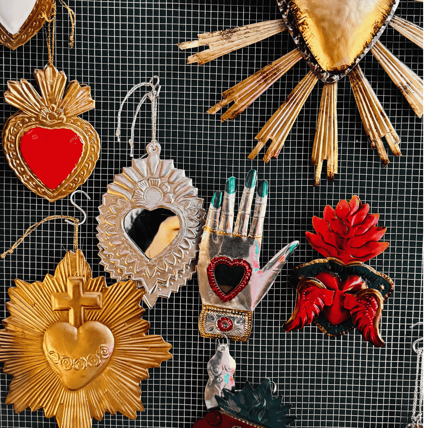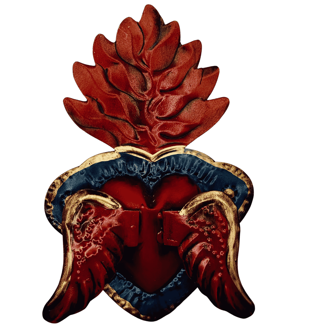 Ex voto messicano in ferro – Cuore alato con fiamma. Fatto e dipinto a mano, rappresenta la passione, la fede ardente e la protezione divina.
