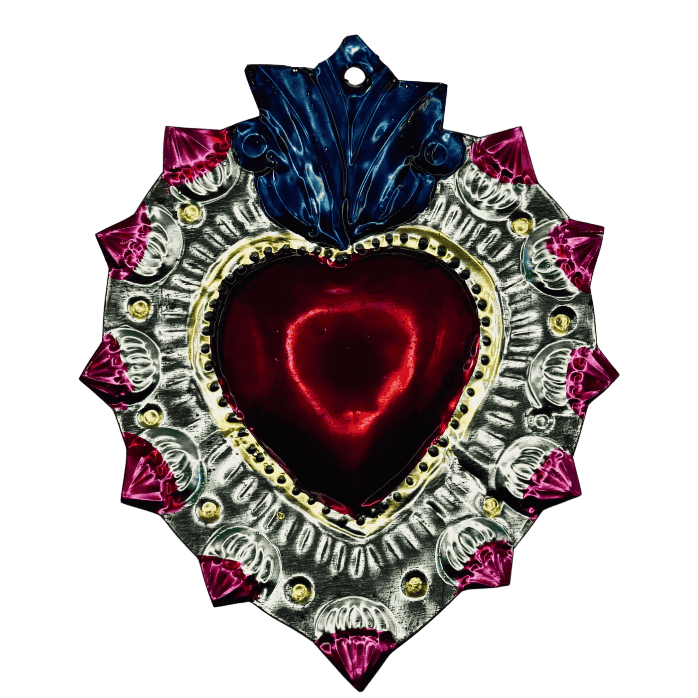 Ex voto messicano in latta con cuore rosso centrale. Realizzato a mano, è un tributo alla devozione e alla tradizione spirituale popolare latinoamericana.