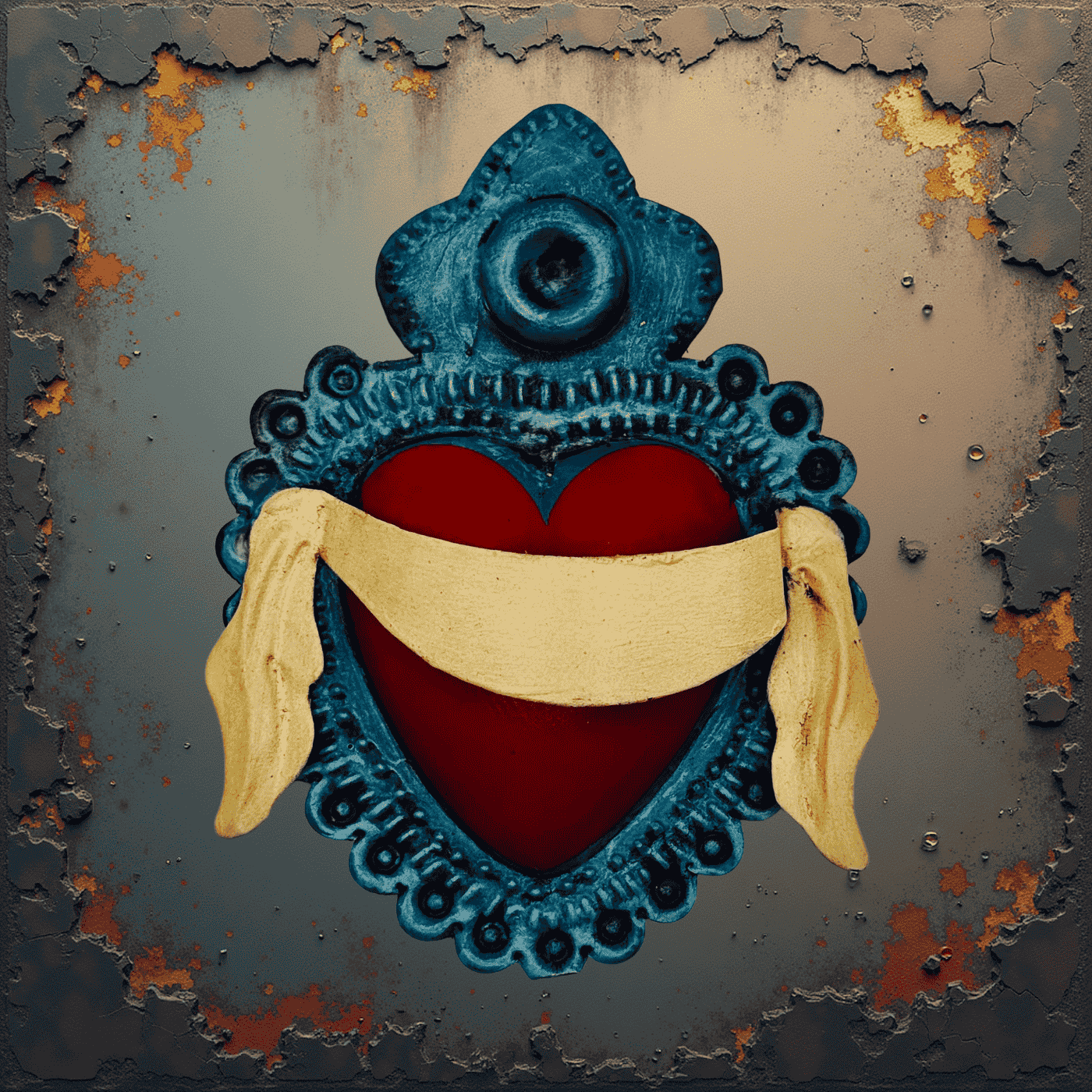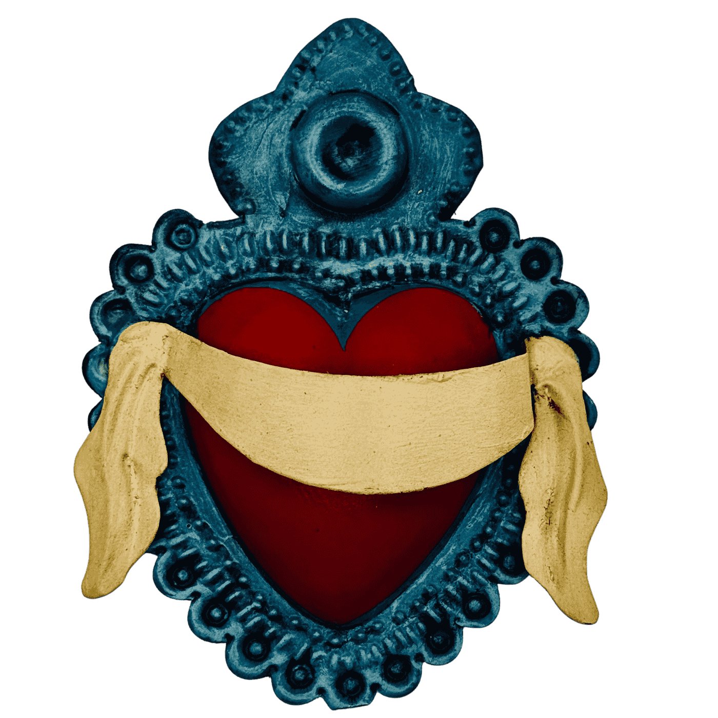 Ex voto messicano in ferro con cuore rosso avvolto da una fascia simbolica. Fatto e dipinto a mano, richiama devozione, amore e passione. Icona potente della tradizione sacra messicana.