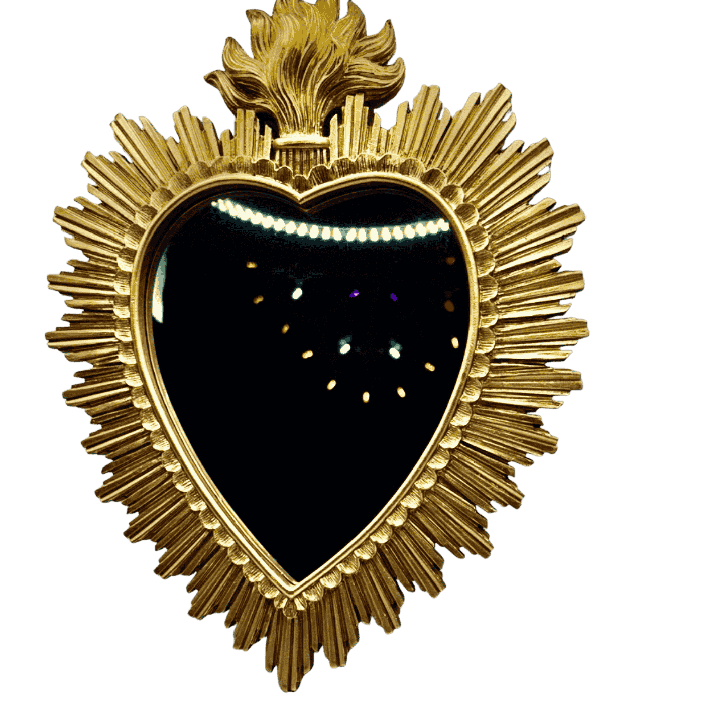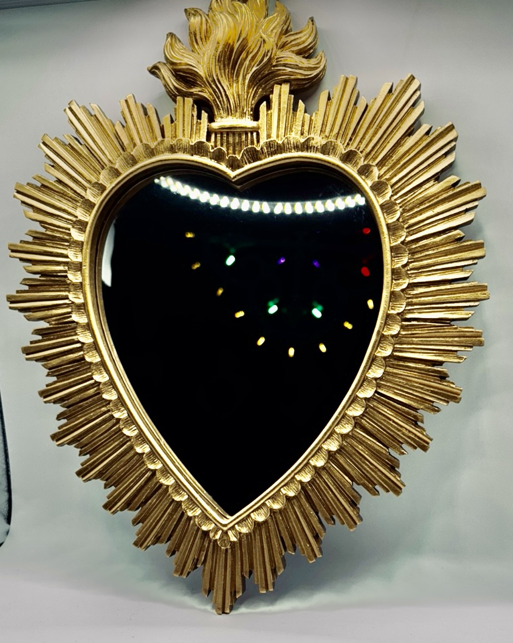 Specchio cuore ex-voto in resina color oro. Un oggetto decorativo elegante e simbolico, perfetto per ambienti glamour o ispirati al design spirituale. Dona luce e carattere a ogni parete.