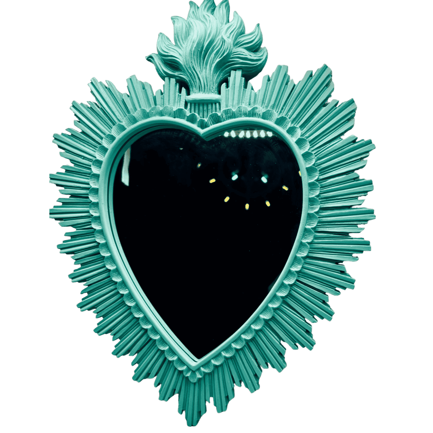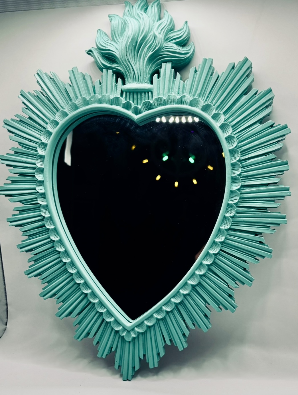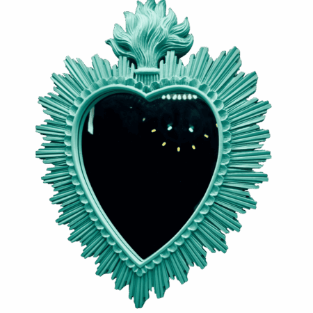 Specchio cuore ex-voto in resina turchese. Una decorazione da parete fuori dal comune, perfetta per chi cerca stile e spiritualità in un solo oggetto. Ideale per case eclettiche o creative.