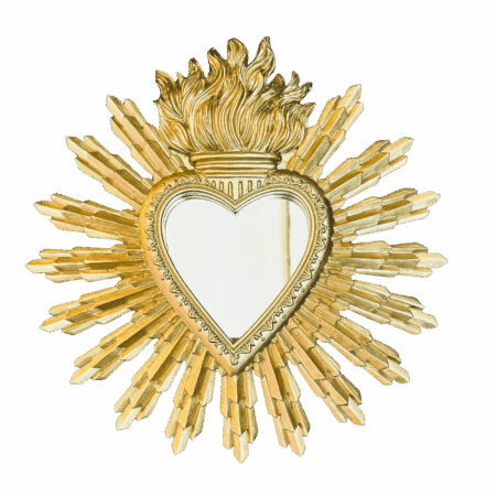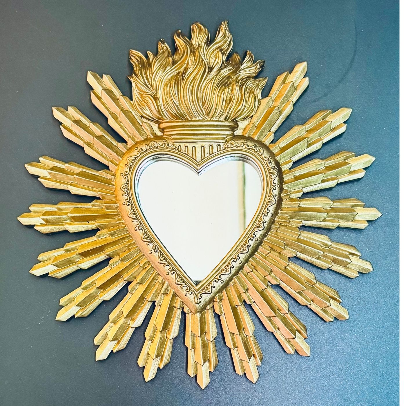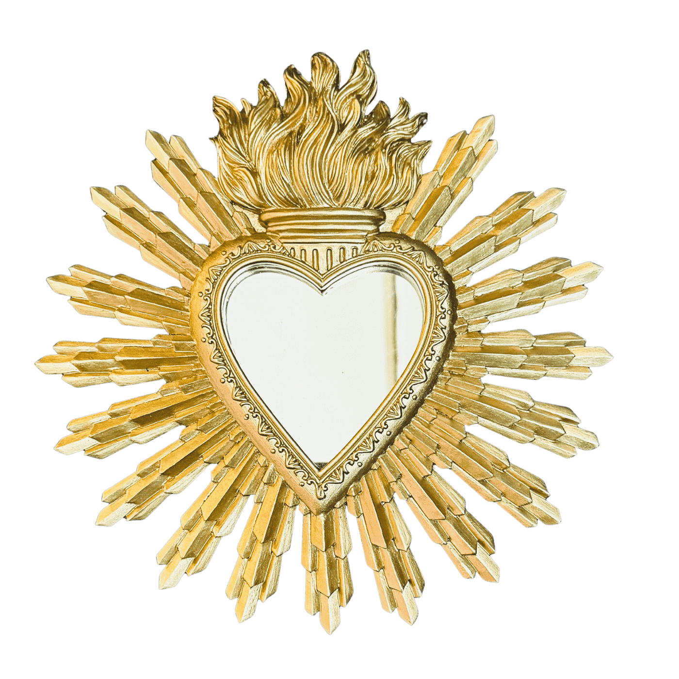 Specchio decorativo a cuore con raggiera in resina dorata. Un tocco barocco e simbolico per pareti d’effetto. Perfetto per creare punti focali ricchi di significato.