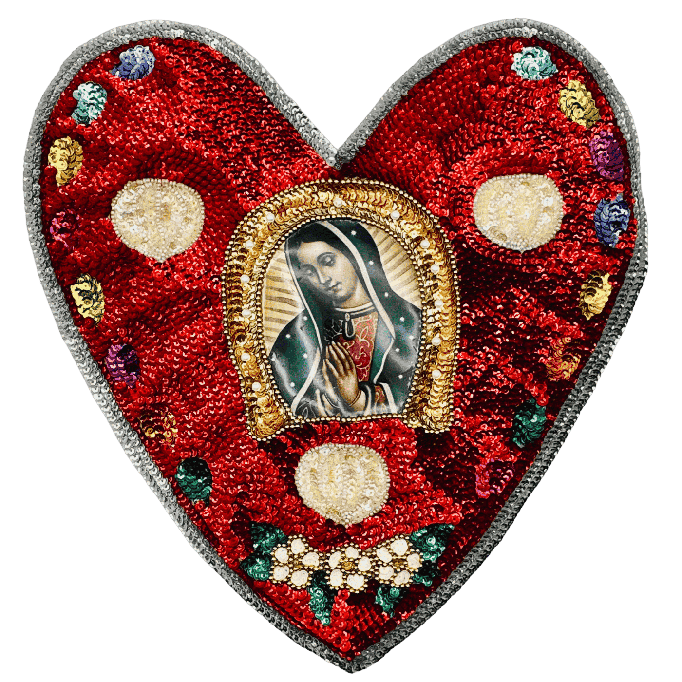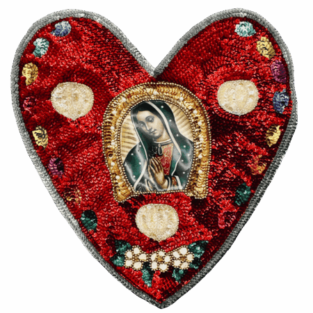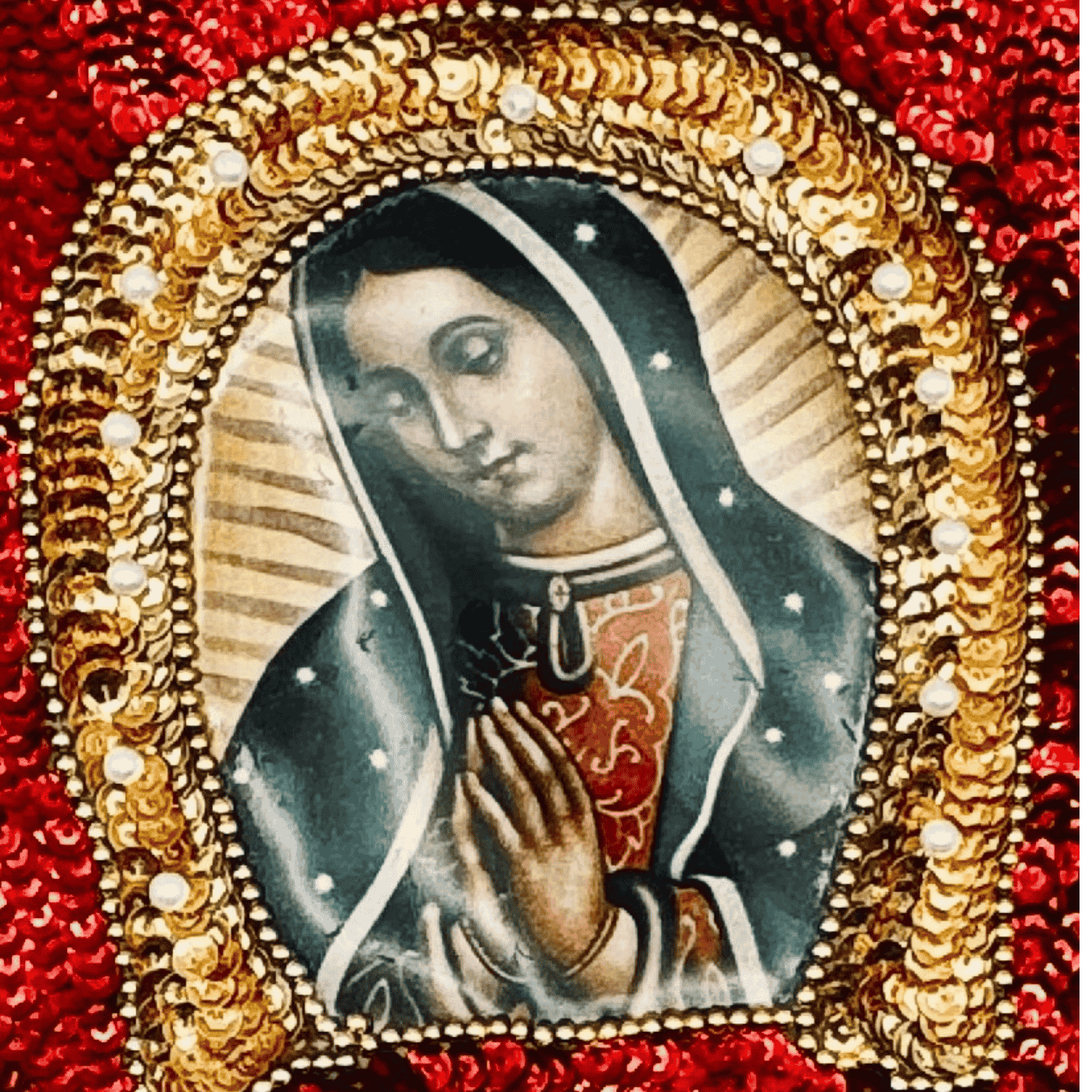 Patch tessuto ricamato a paillettes con Madonna di Guadalupe – Fatto in Messico. Un accessorio spirituale e decorativo, perfetto da applicare su zaini, giacche o altari domestici.