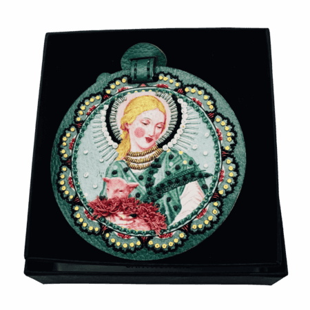 Protettrice delle giovani ragazze e delle coppie di fidanzati. Decora la tua borsa con questo ciondolo finemente ricamato a mano. Adatto a ogni tipo di borsa, include una elegante scatolina regalo. Made in Europe. Un charm spirituale da portare con sé ogni giorno. Santa Agnese protegge l’amore e la dolcezza. Regalo perfetto e decorazione raffinata.