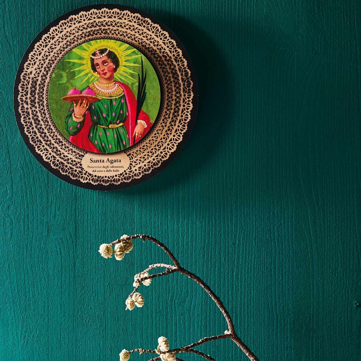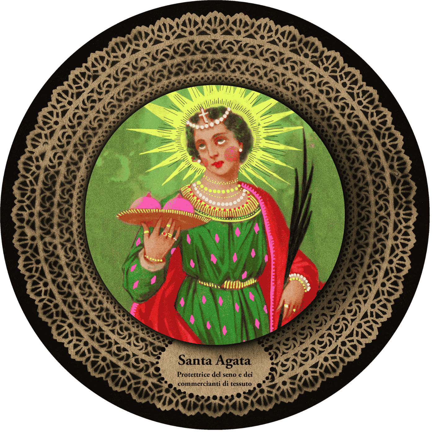 Protettrice del seno, delle balie, degli infermieri e dei commercianti di tessuto. Invocata contro incendi e disastri ambientali. Icona pop facile da appendere a parete con un semplice chiodo o vite. Protezione riportata sul retro in lingua inglese e italiana. Made in Europe. Design pop e protezione tradizionale in una decorazione sacra da parete unica. Santa Agata è un’icona potente per chi cerca forza, guarigione e protezione.