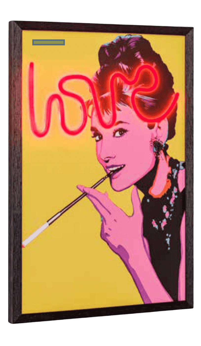 Quadro “Audrey” con luce LED e cavetto USB. Icona di eleganza, reinterpretata in chiave pop e luminosa. Un pezzo d’arredo che unisce stile vintage e modernità. Ideale per ambienti femminili, boutique o angoli raffinati.