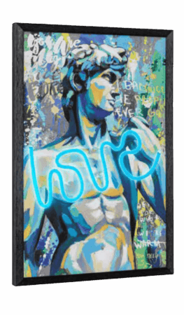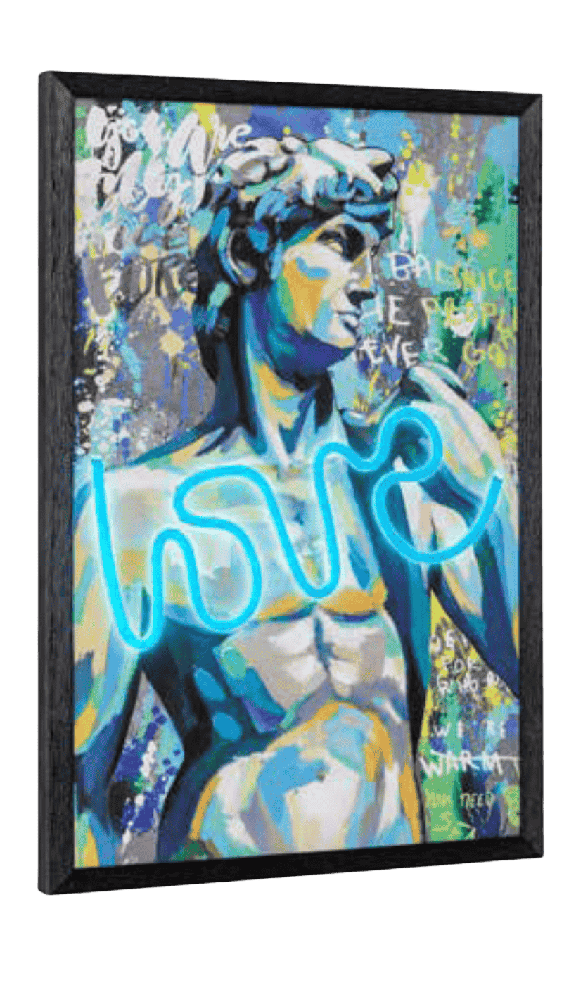 Quadro “David” con luce LED e cavetto USB. Il classico diventa pop: l’arte rinascimentale viene riletta con colori accesi e illuminazione moderna. Perfetto per arredamenti audaci, contemporanei o creativi.