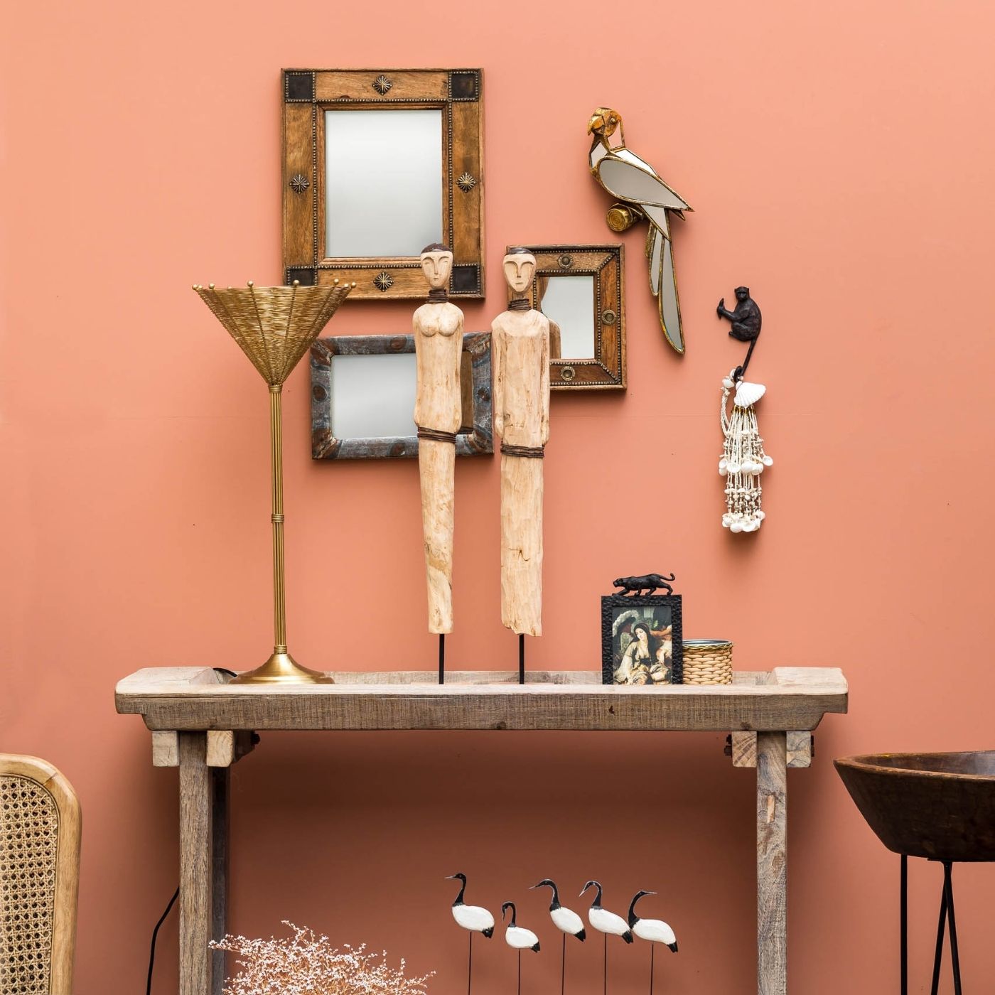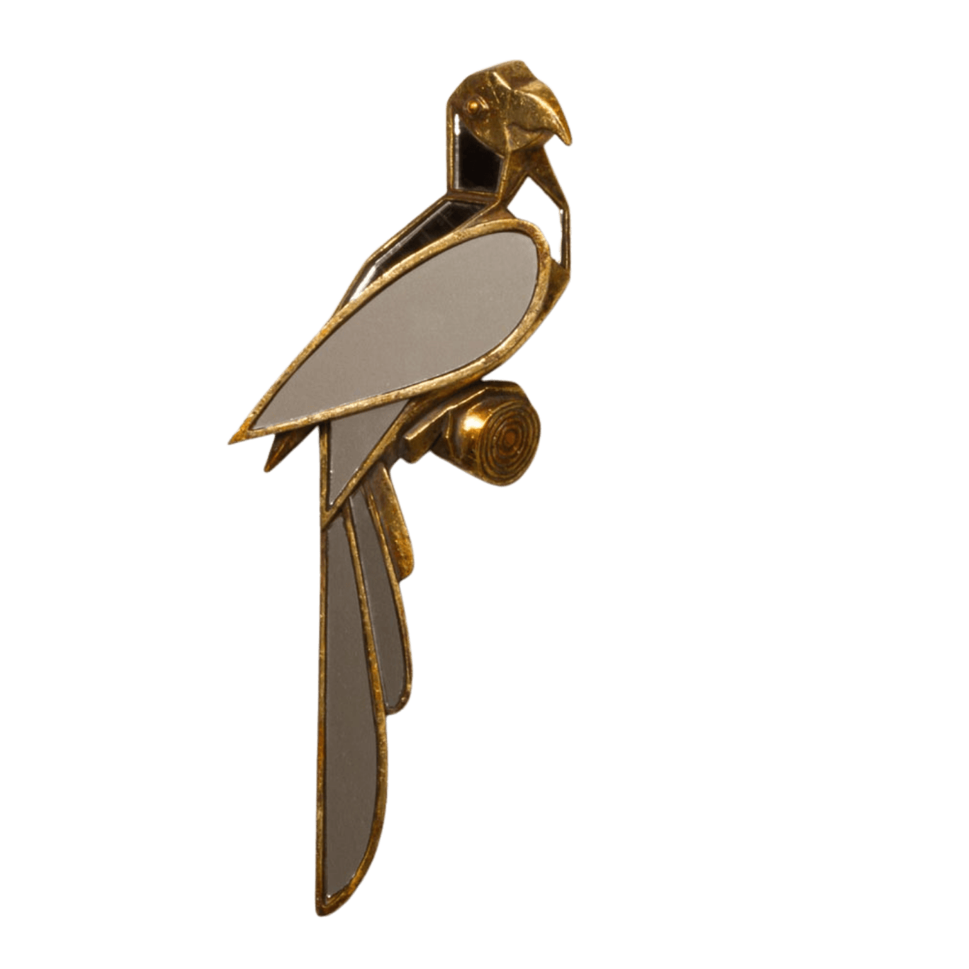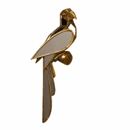 Pappagallo destro a specchio da parete, in resina dorata effetto invecchiato. Un oggetto ornamentale esotico per creare pareti tropicali di forte impatto.