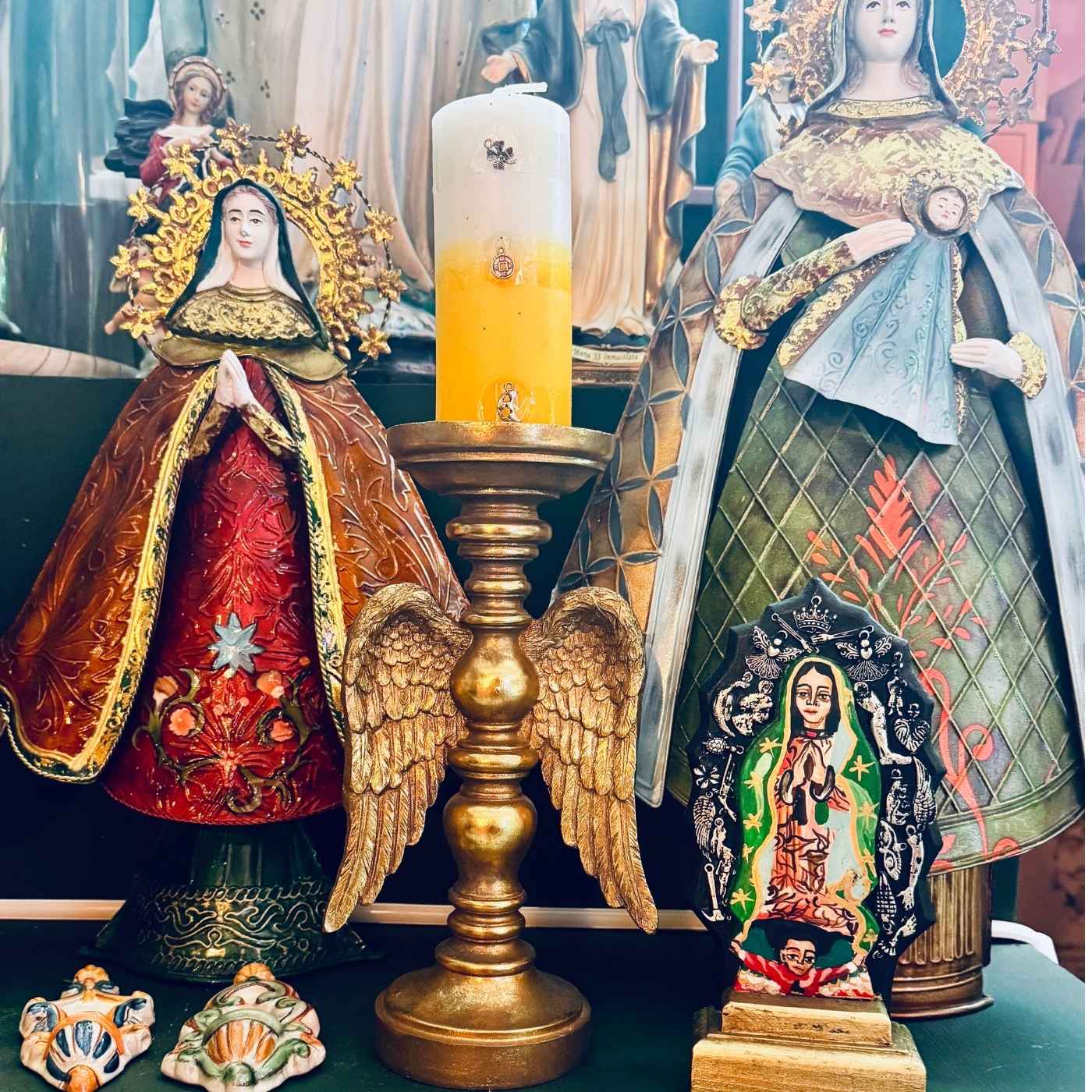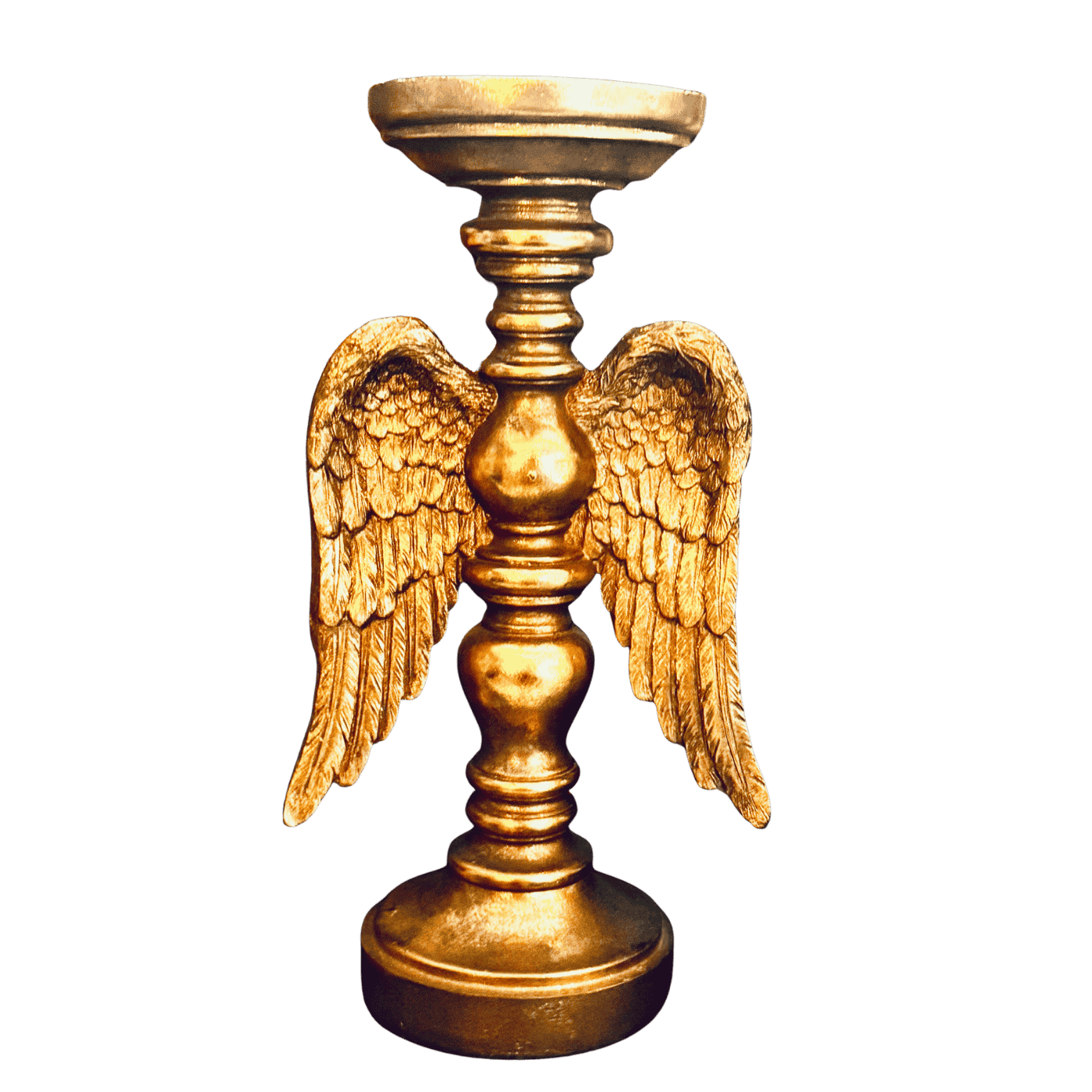 Candelabro decorativo con ali dorate, effetto invecchiato. Realizzato in resina, è perfetto per ambienti sacro-pop o scenografie artistiche.