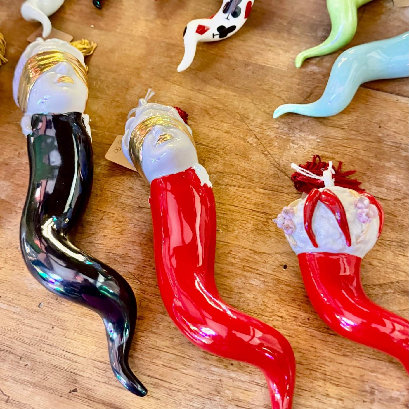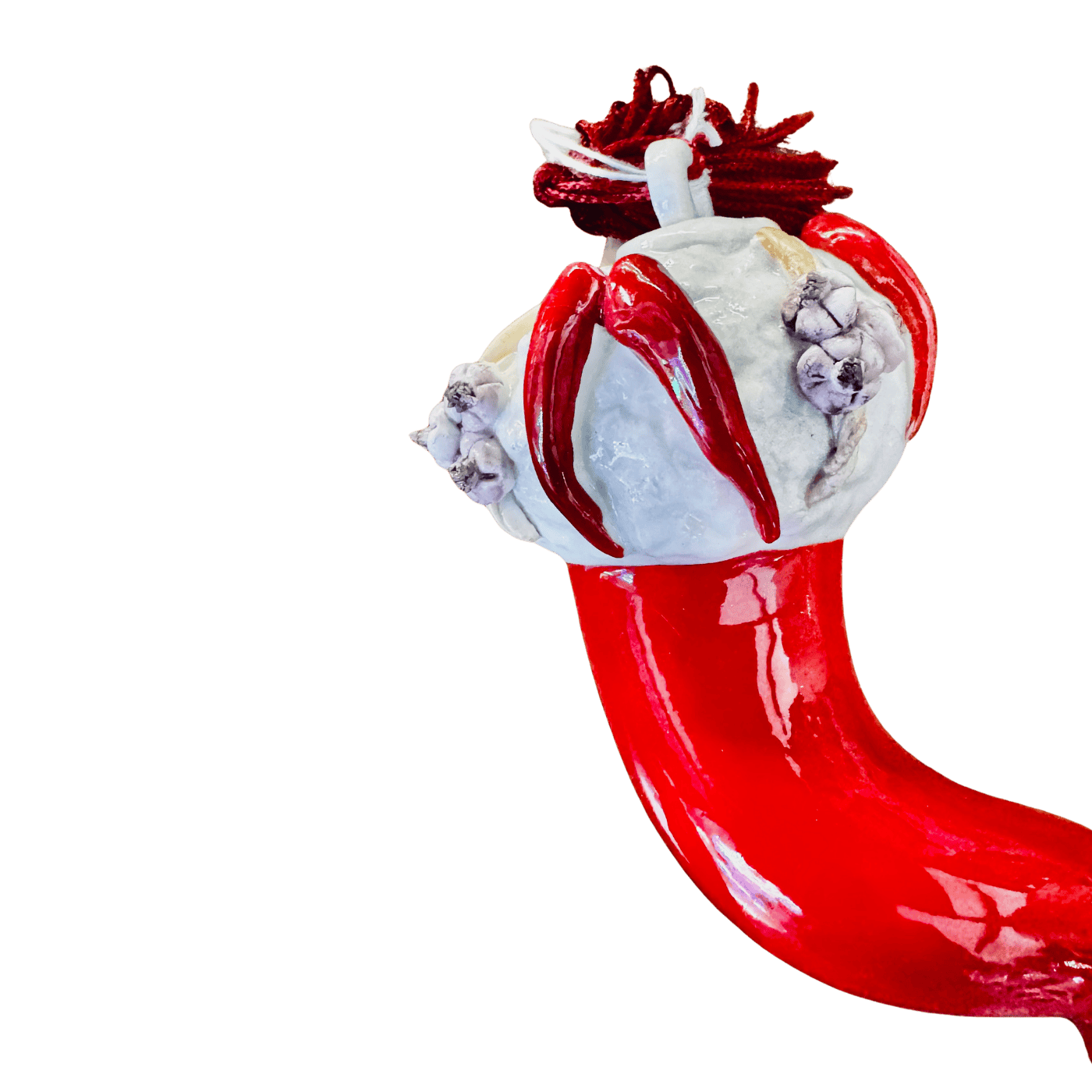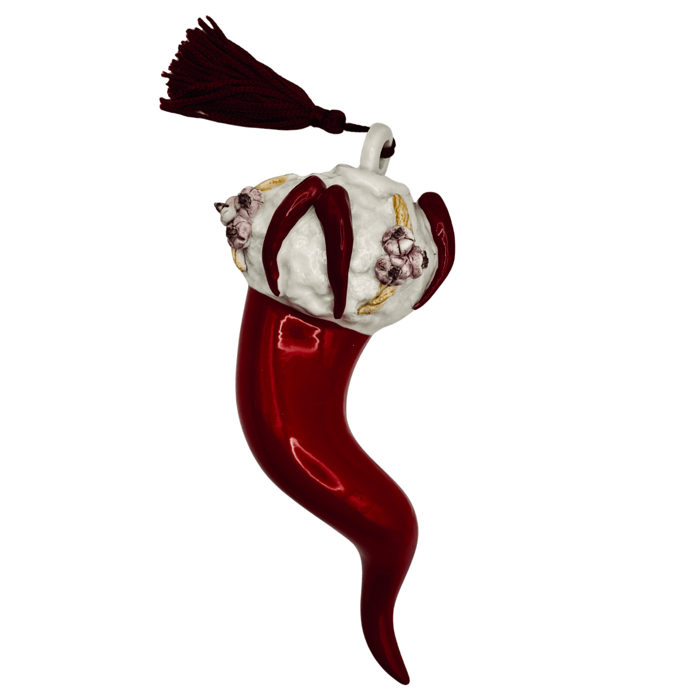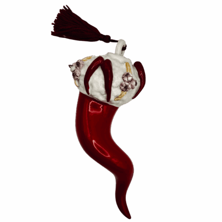 Corno con aglio e peperoncino 15 cm: triplo portafortuna tradizionale in porcellana di Capodimonte. Un mix simbolico per protezione e abbondanza.