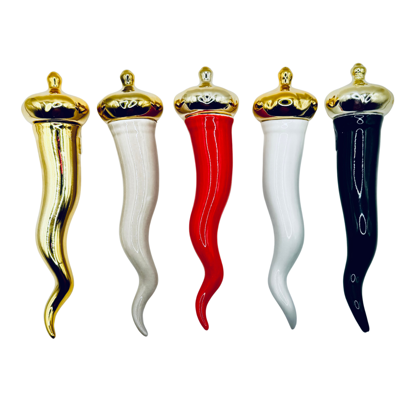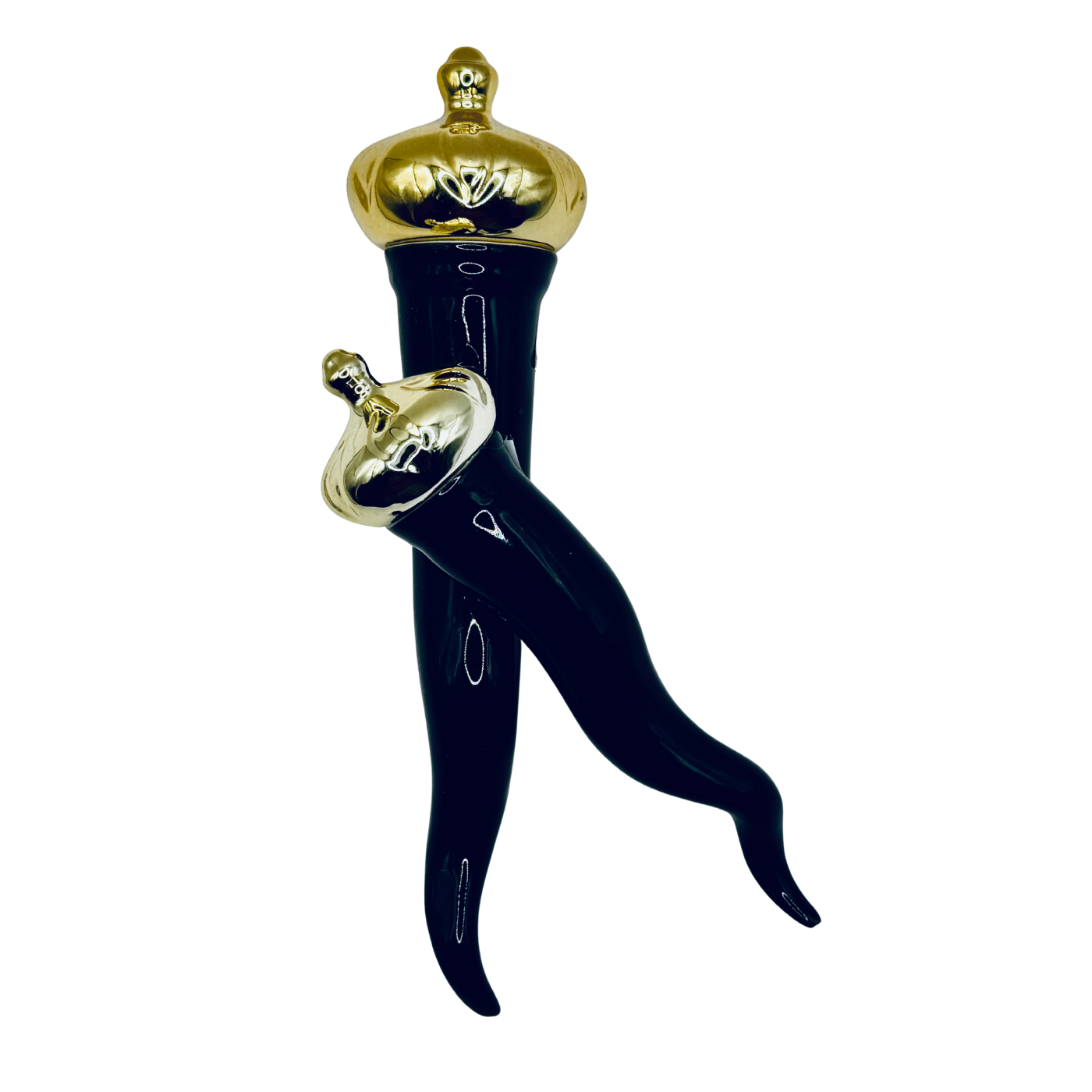 Corno nero con punte oro decorato a mano in porcellana. Versione grande da appoggio, simbolo di fortuna e stile artigianale. Oggetto di forte impatto visivo, ideale per ambienti sofisticati.