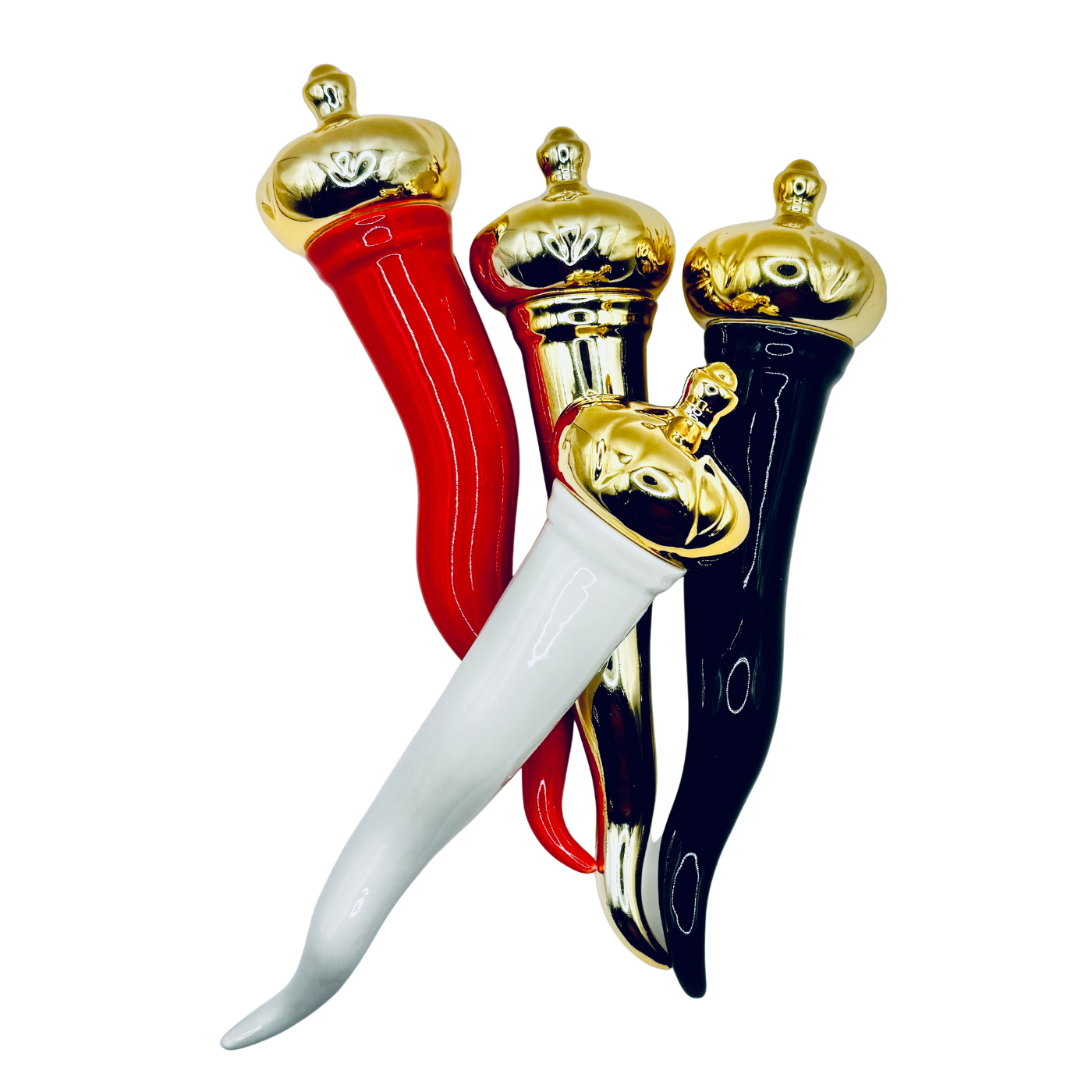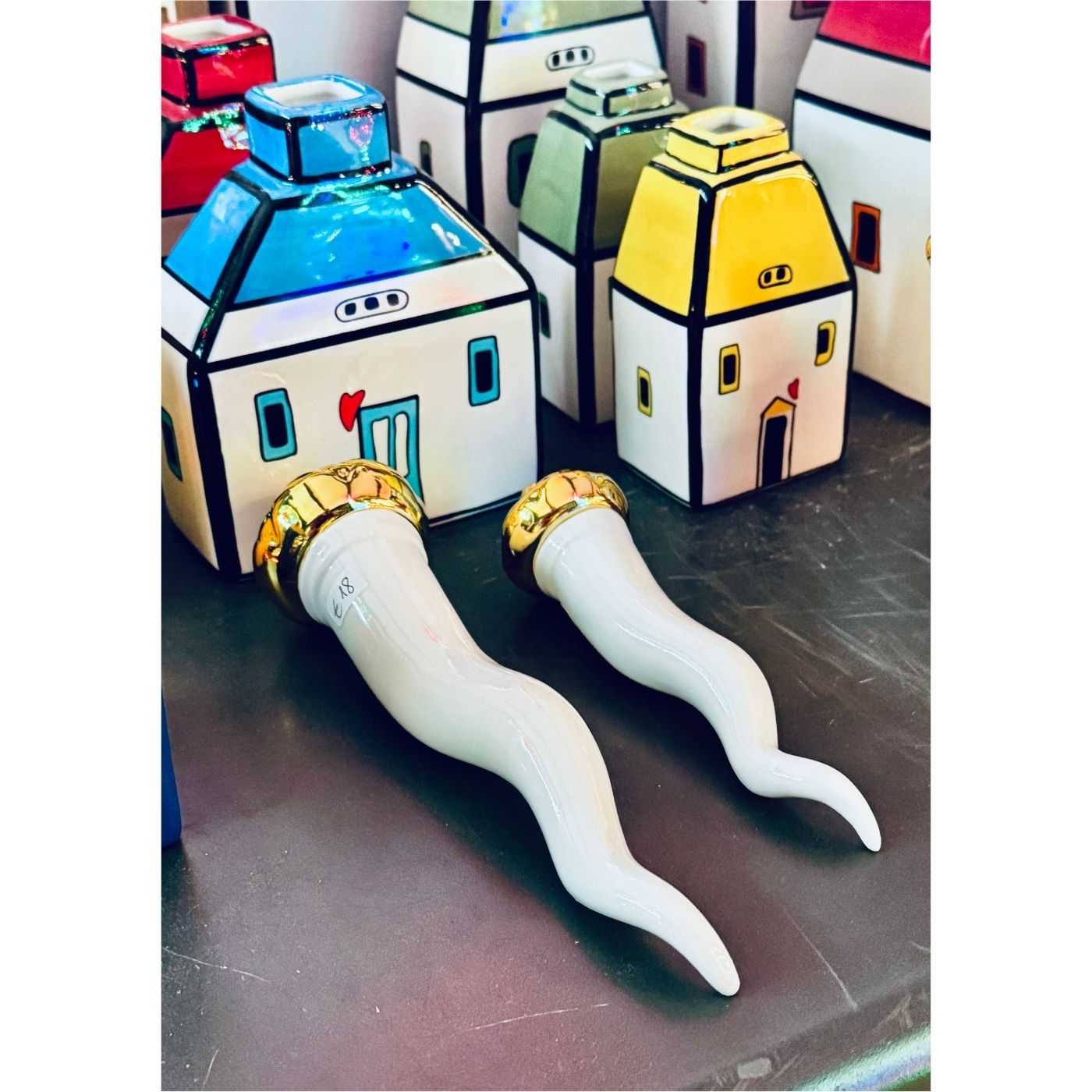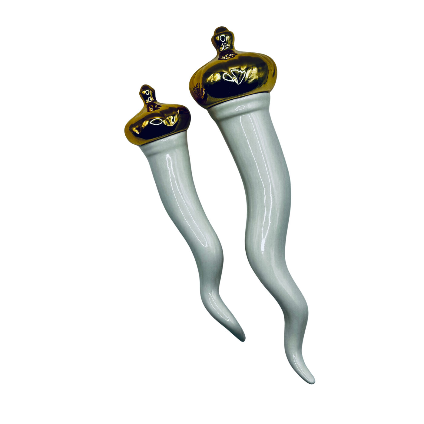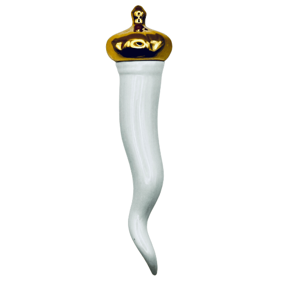 Piccolo corno decorativo in porcellana bianca con punte oro dipinte a mano. Simbolo di protezione e fortuna, elegante e raffinato, ideale per ambienti minimalisti o spazi contemporanei. Una perfetta idea regalo per la casa.