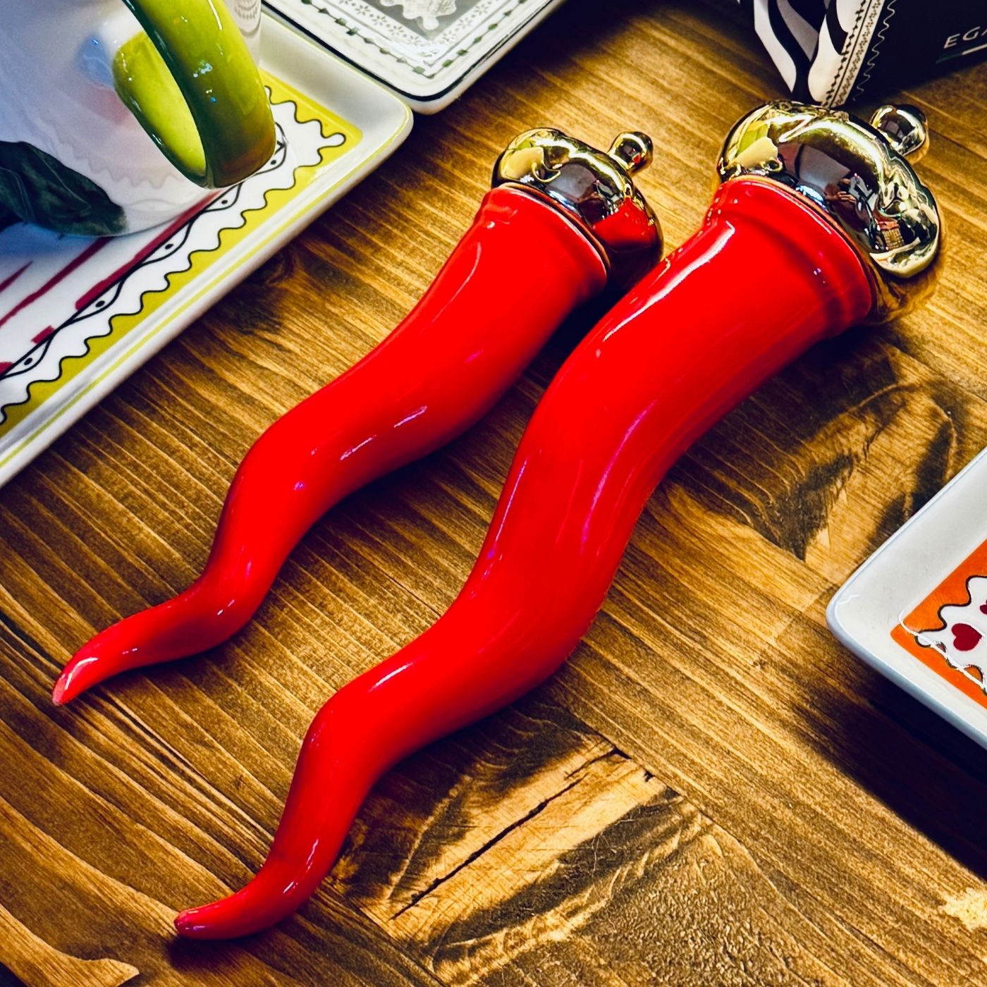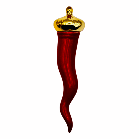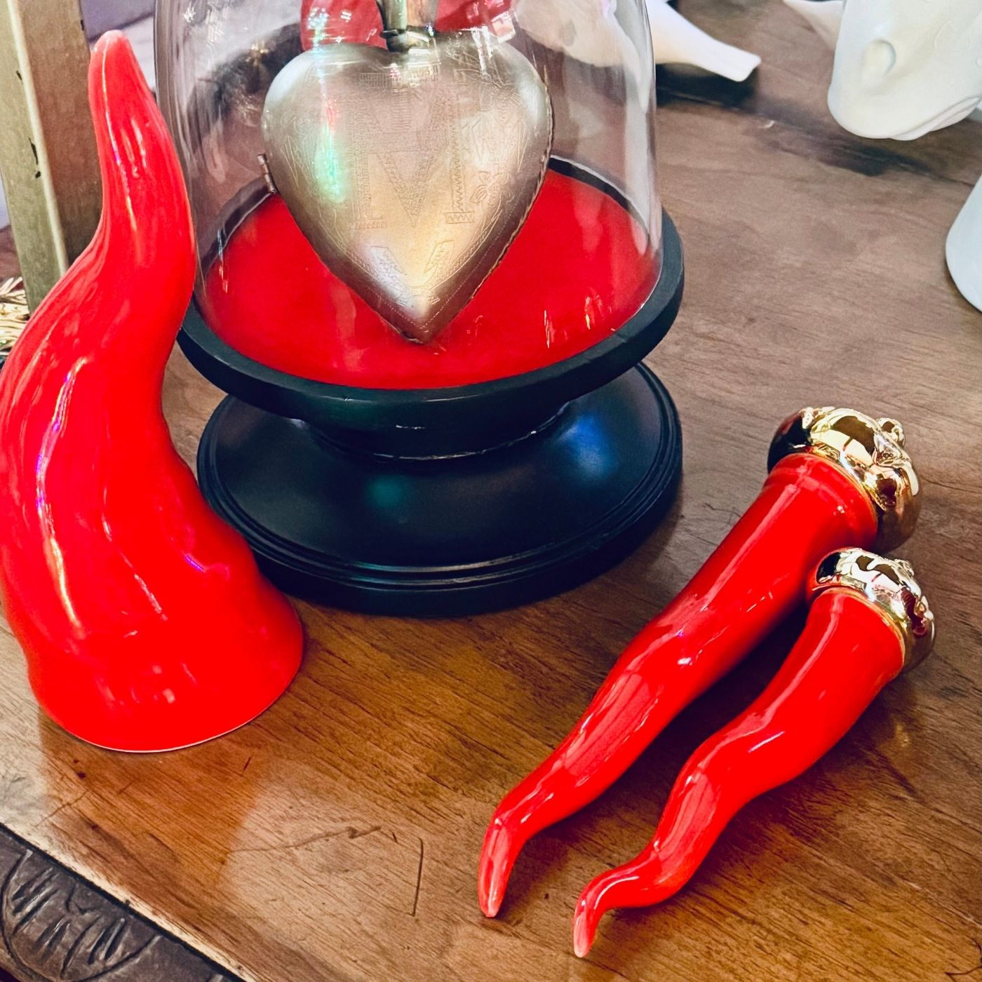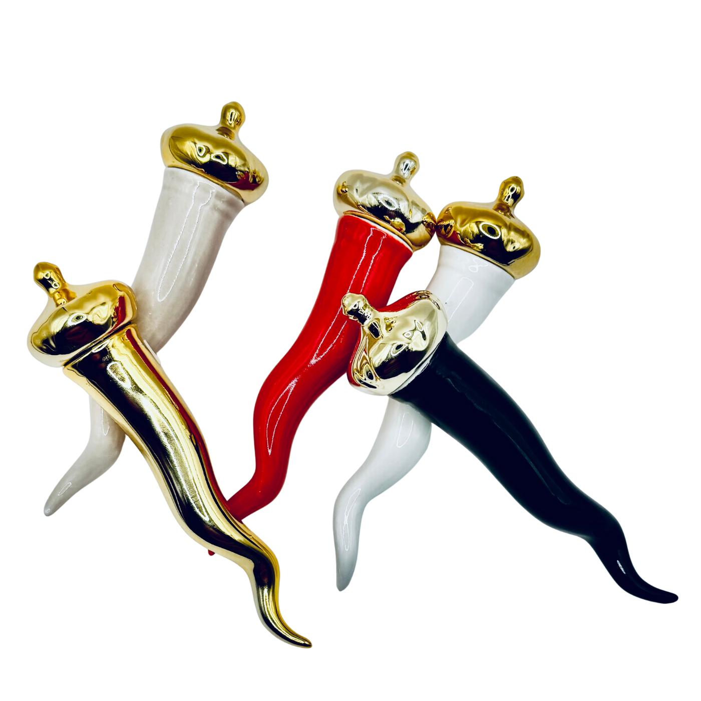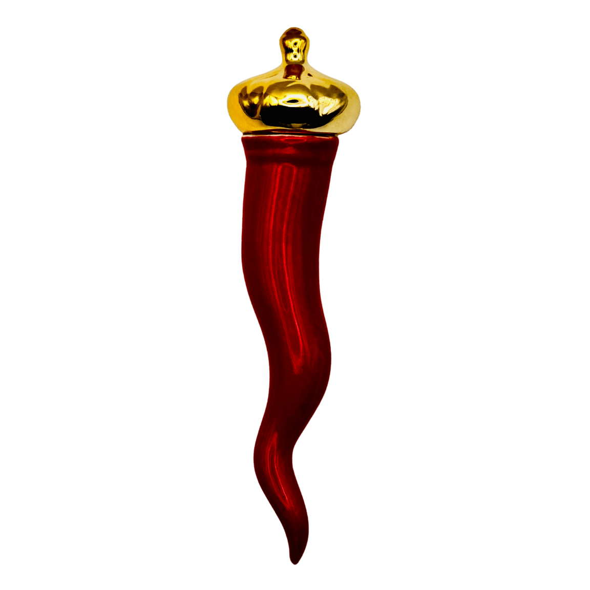 Piccolo corno decorativo in porcellana rossa con punte dorate dipinte a mano. Simbolo classico di protezione e fortuna reinterpretato con gusto moderno e vivace. Ideale per mensole, scrivanie e tavolini come oggetto regalo o portafortuna.