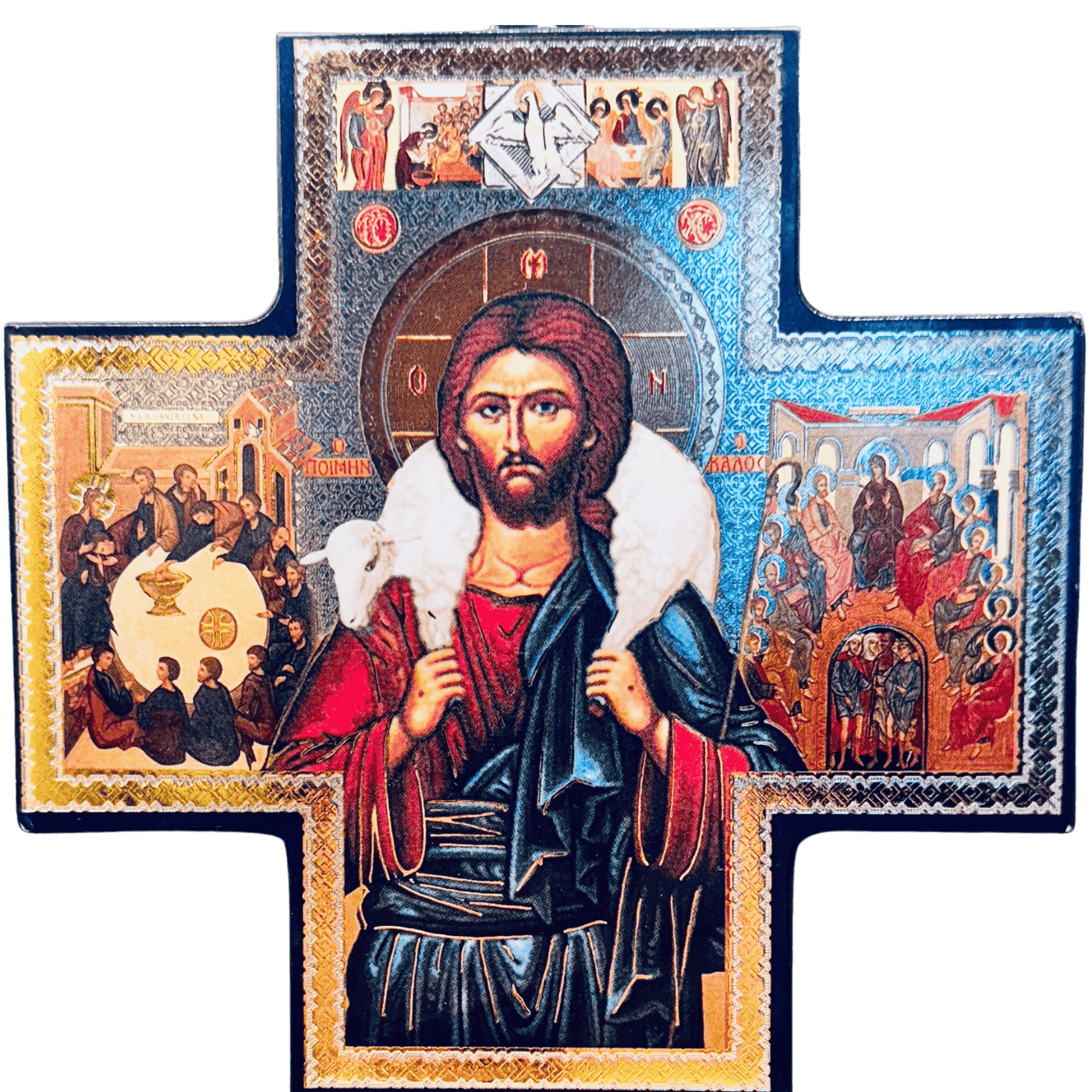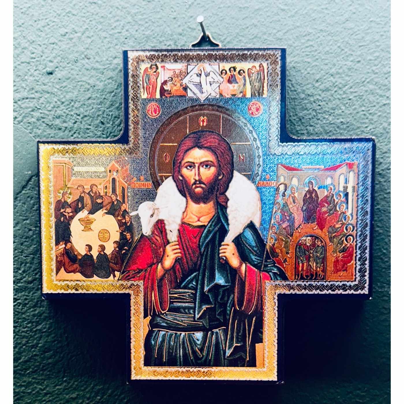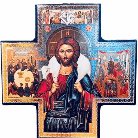 Croce icona bizantina – Raffigura Cristo con l’Agnello. Un forte richiamo alla tradizione ortodossa, ideale per collezionisti o per ambienti di preghiera.