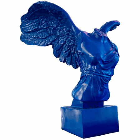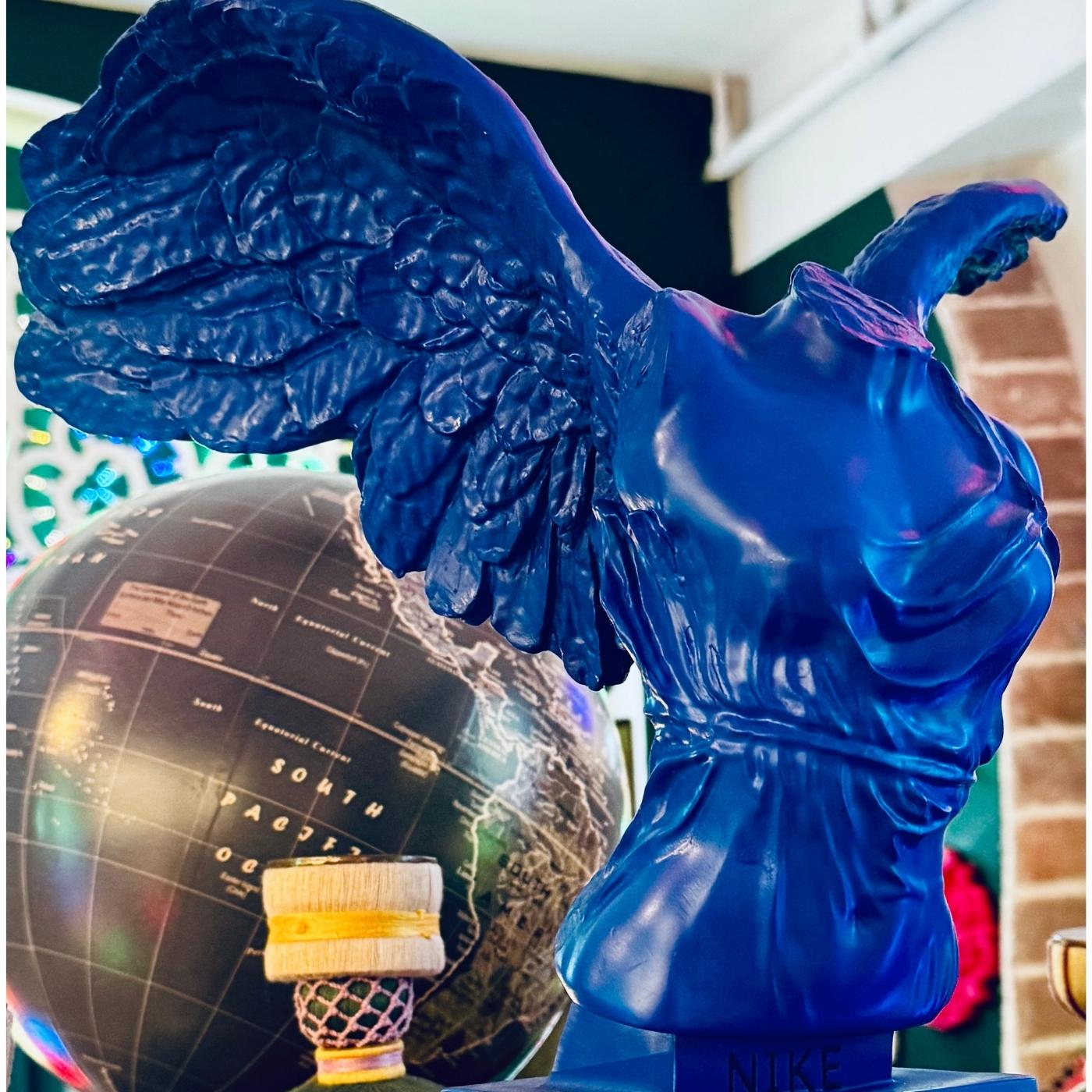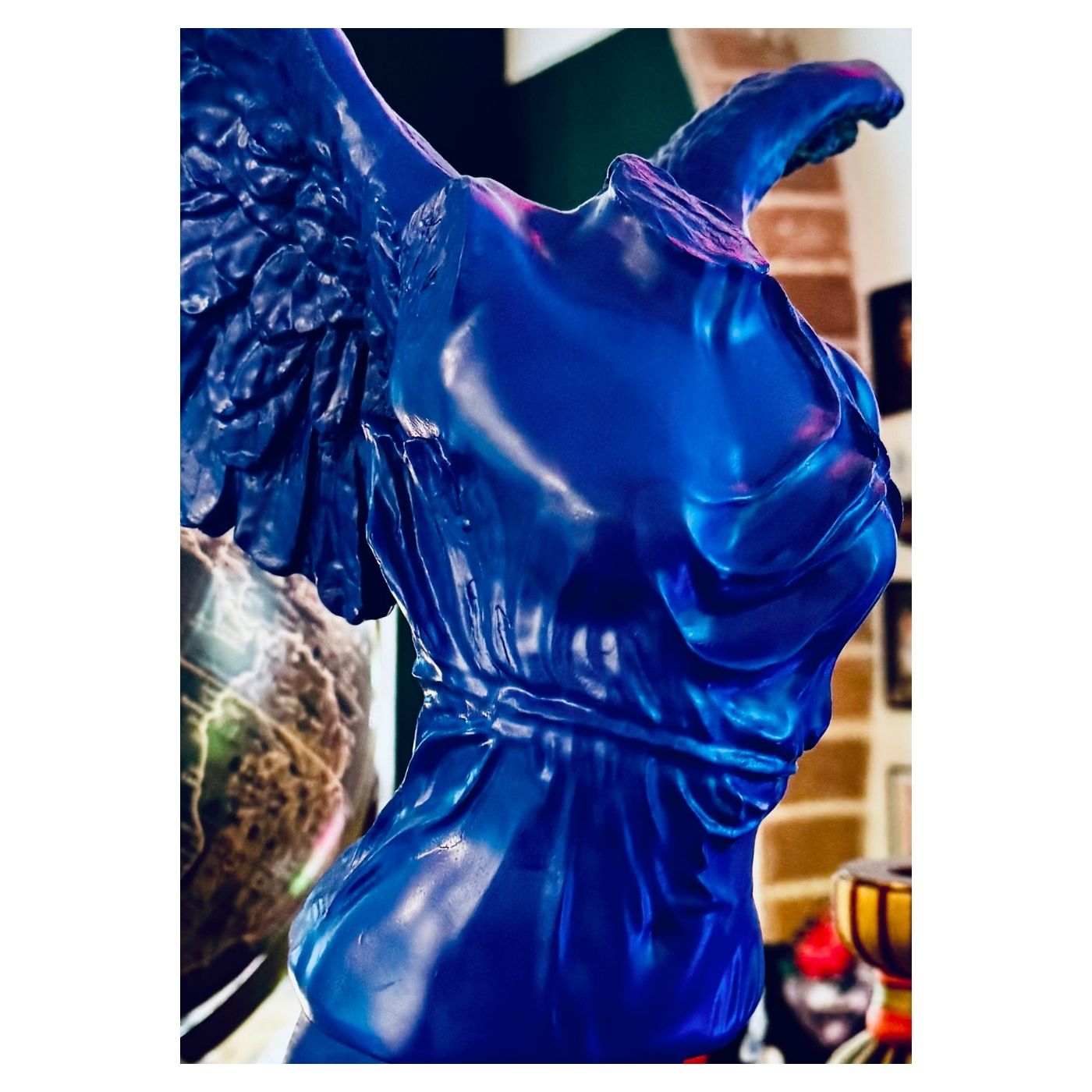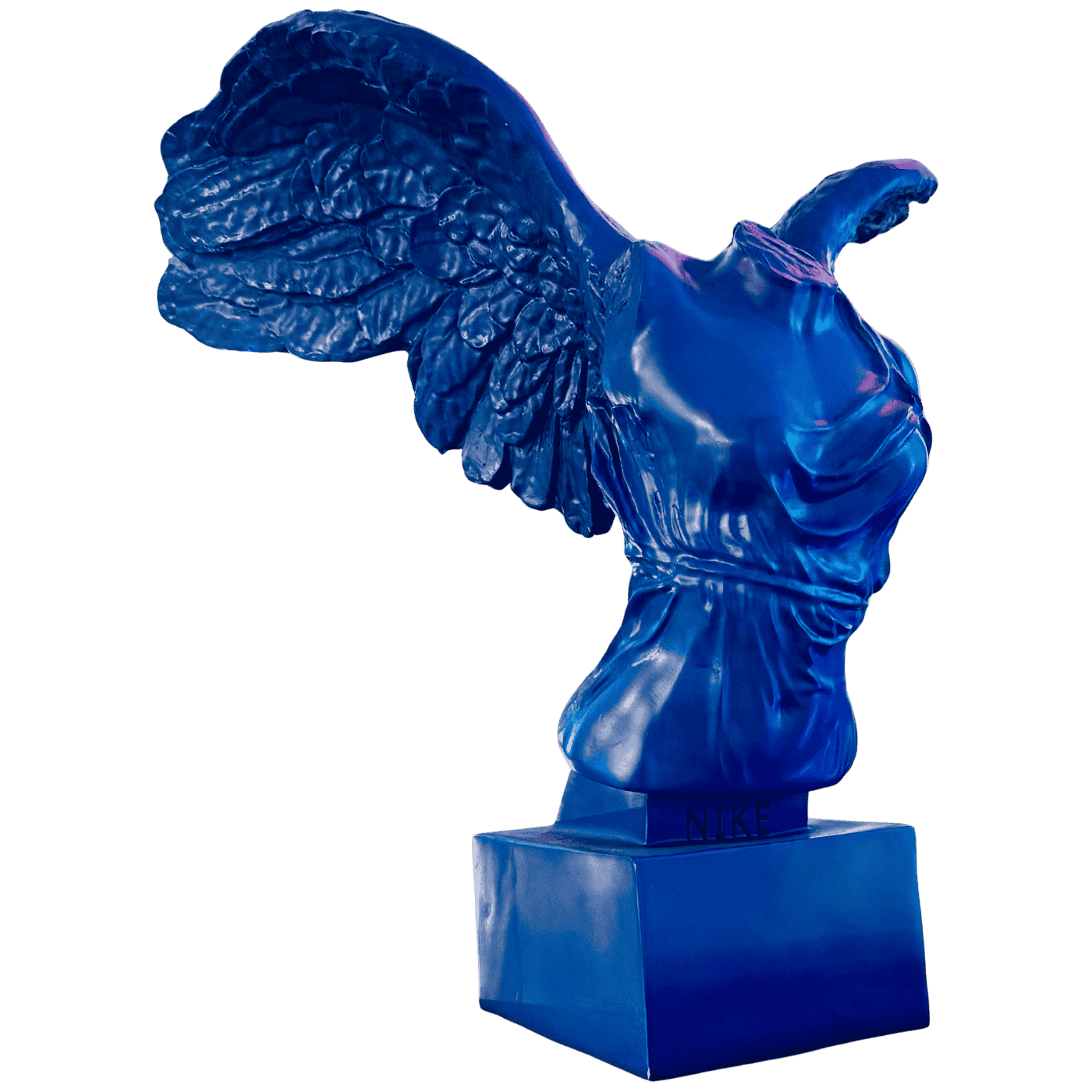 Miniatura della Nike di Samotracia in resina blu Klein. Altezza 18 cm, perfetta come oggetto decorativo su librerie e mensole. Stile mitologico-pop.