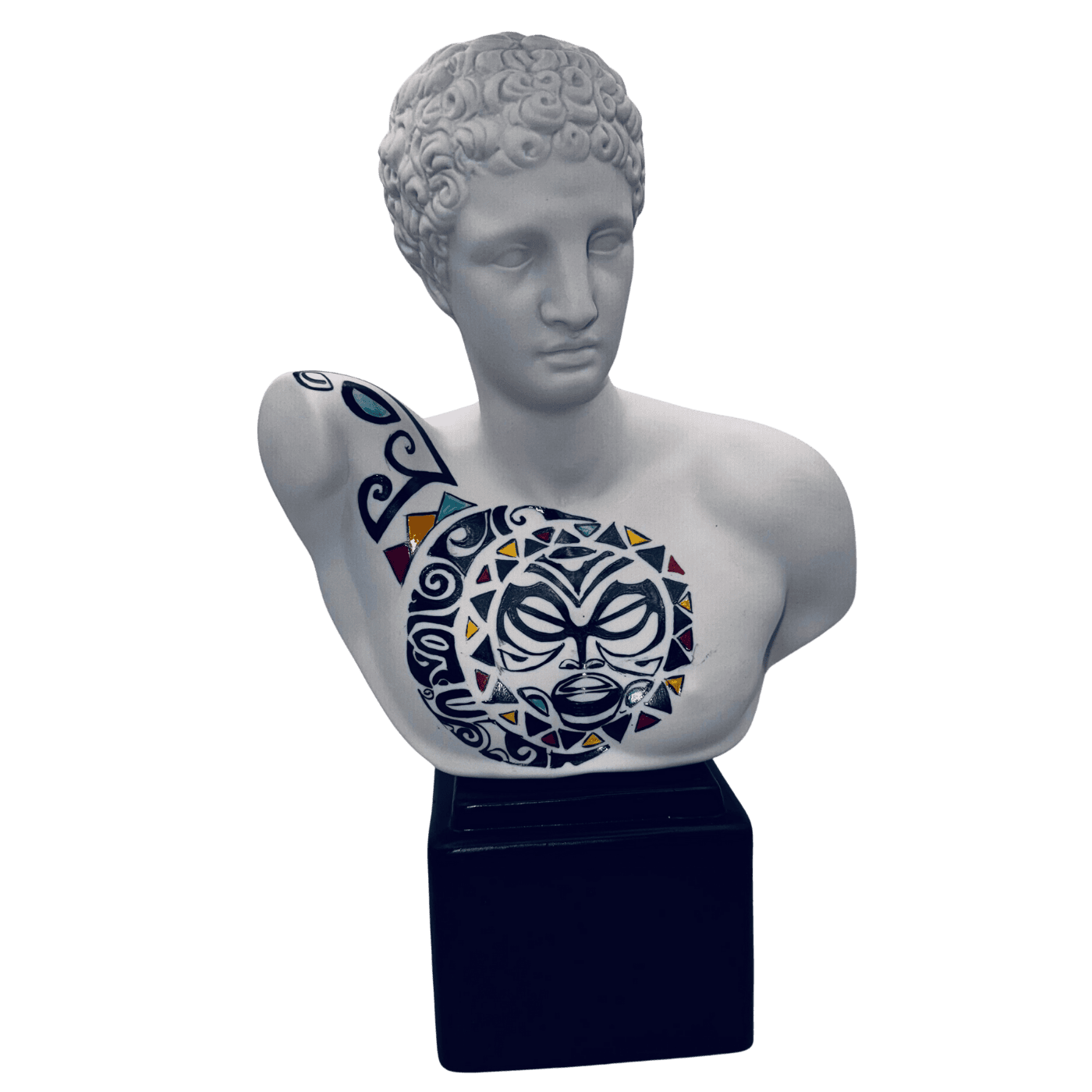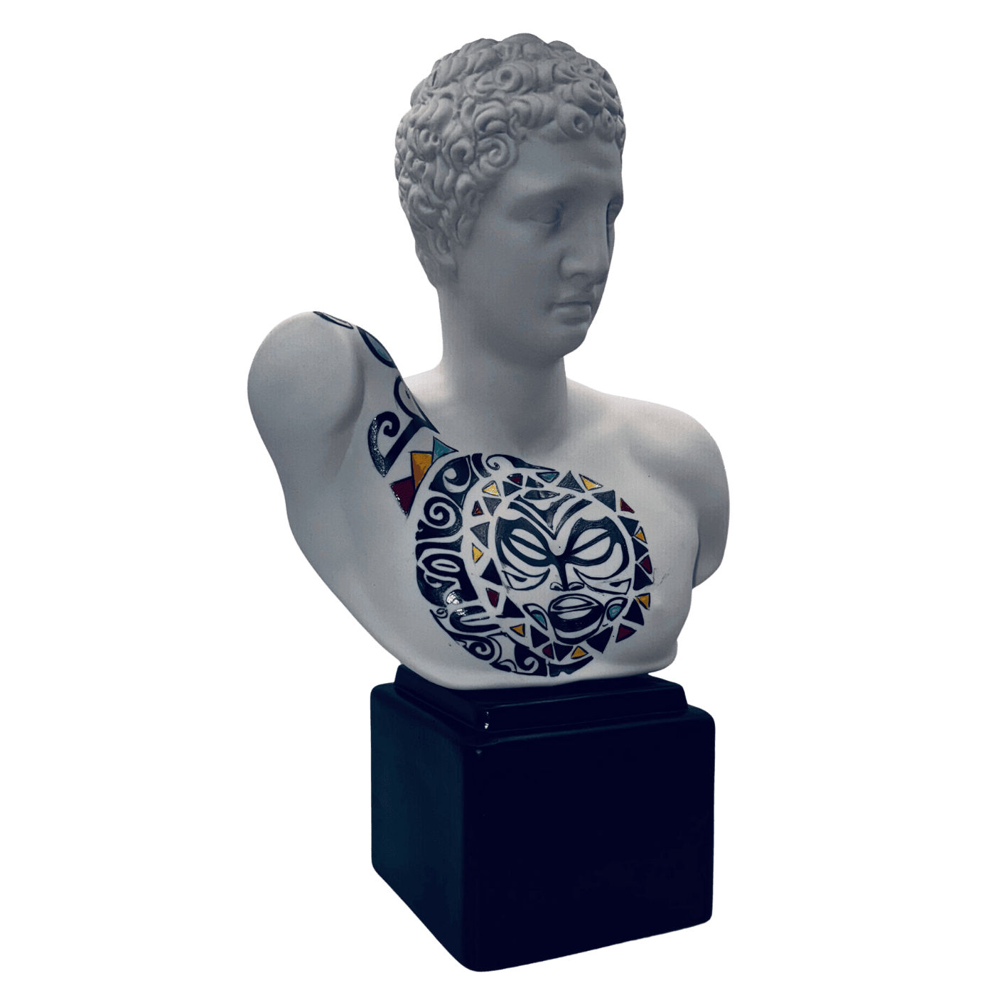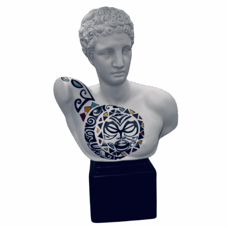 Busto Hermes alto 30 cm Tattoo “Maori”: arte sacra e stile contemporaneo si incontrano in questa versione tatuata del dio Hermes. Ispirazione Maori, porcellana Capodimonte, perfetta come pezzo di design evocativo e interculturale.