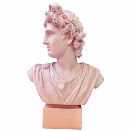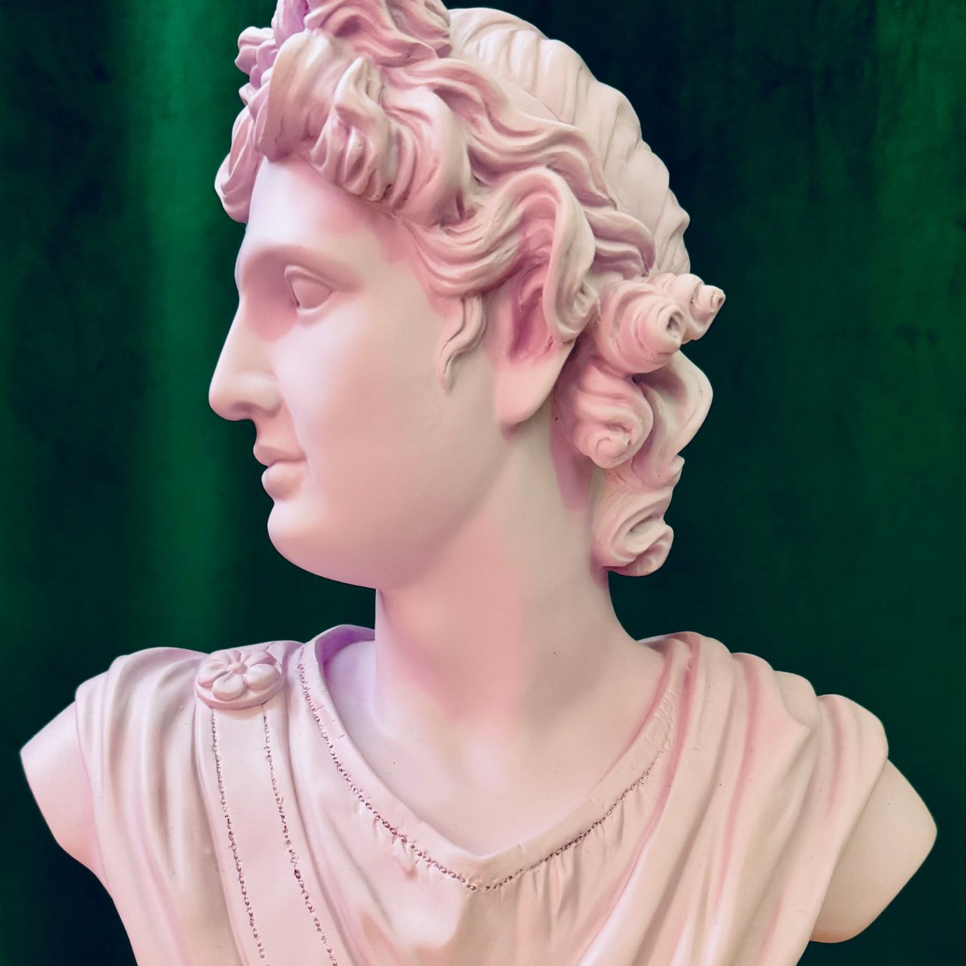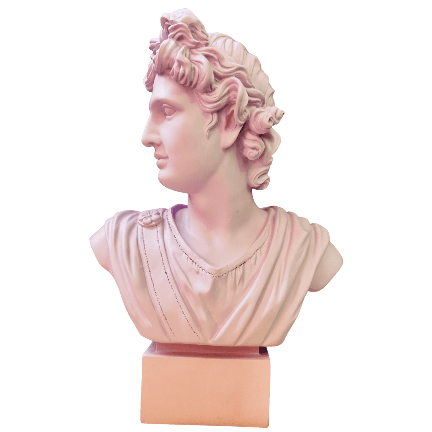 Busto di Apollo in resina viola, 35 cm. Oggetto decorativo dallo stile neoclassico pop, per arredare ambienti sofisticati e originali. Perfetto come punto focale.