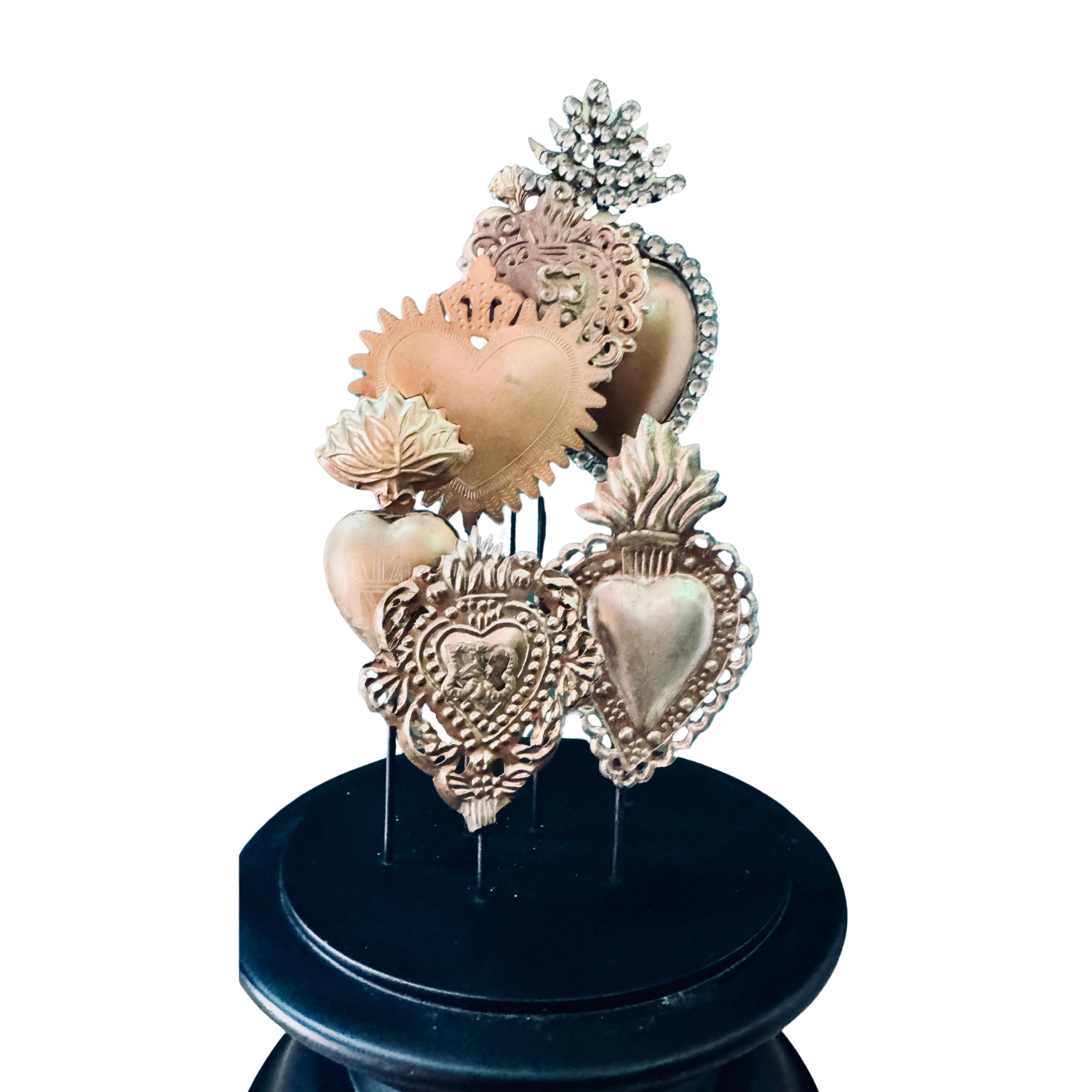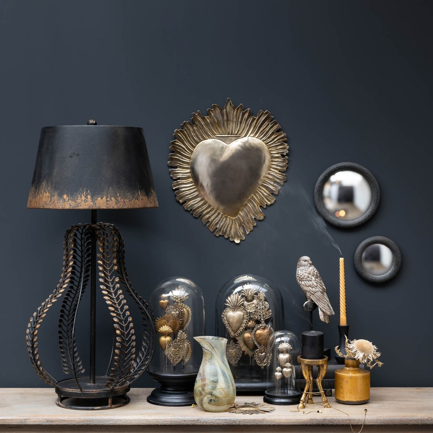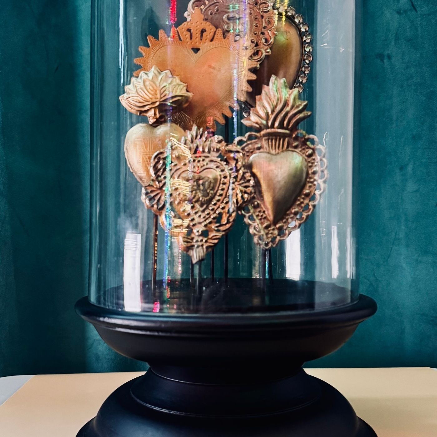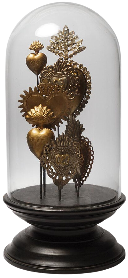 Campana rotonda in vetro con ex-voto ornamentali su base in legno. Un oggetto da esposizione di grande impatto visivo, che unisce religiosità e arte decorativa.