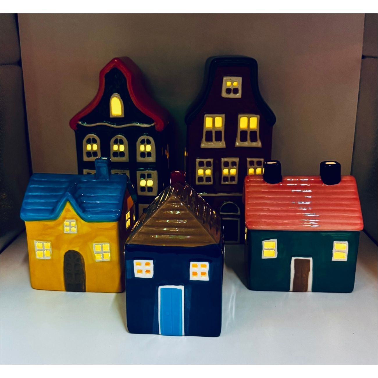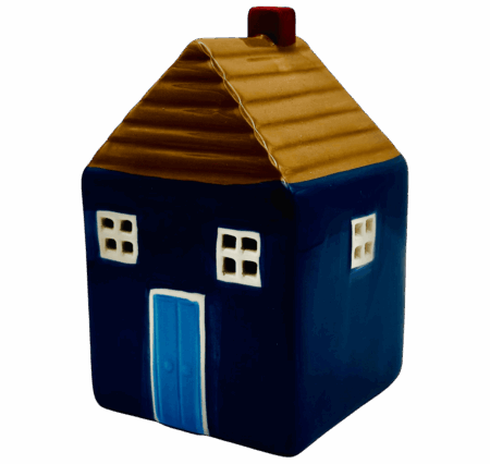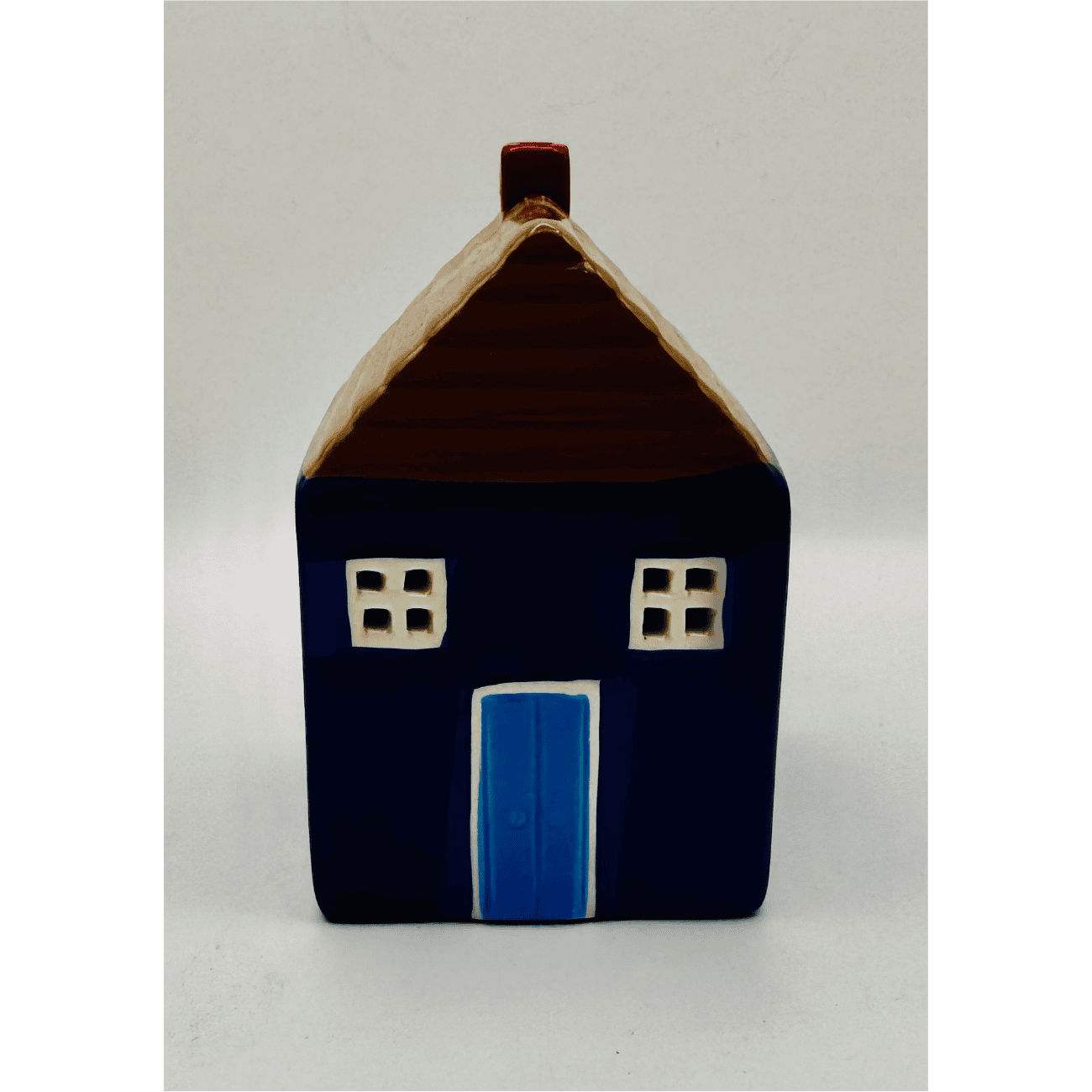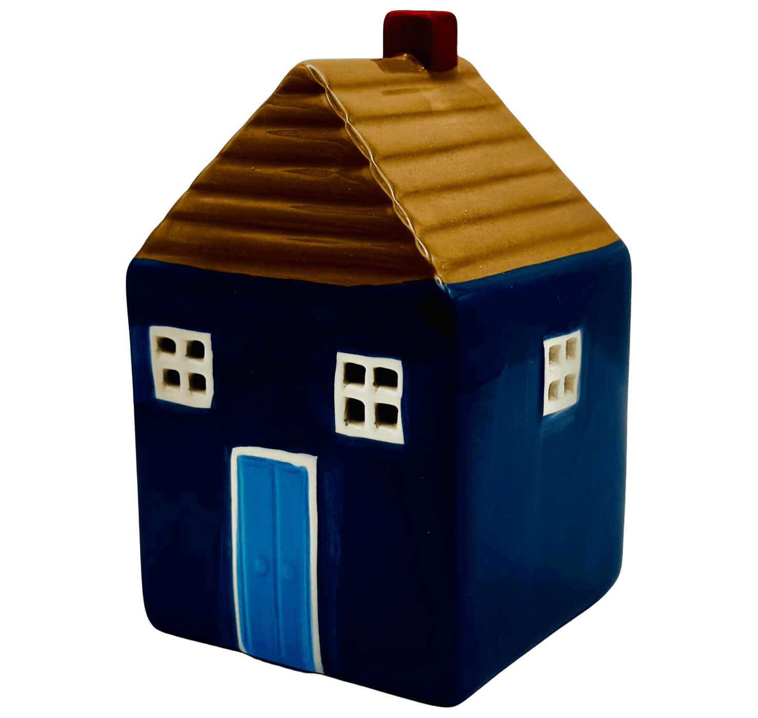 Casetta in ceramica blu con tetto biscotto sagomato e lucine LED. Un oggetto decorativo dal fascino retrò che dona calore e un tocco poetico a ogni ambiente. Ottimo anche come regalo creativo.
