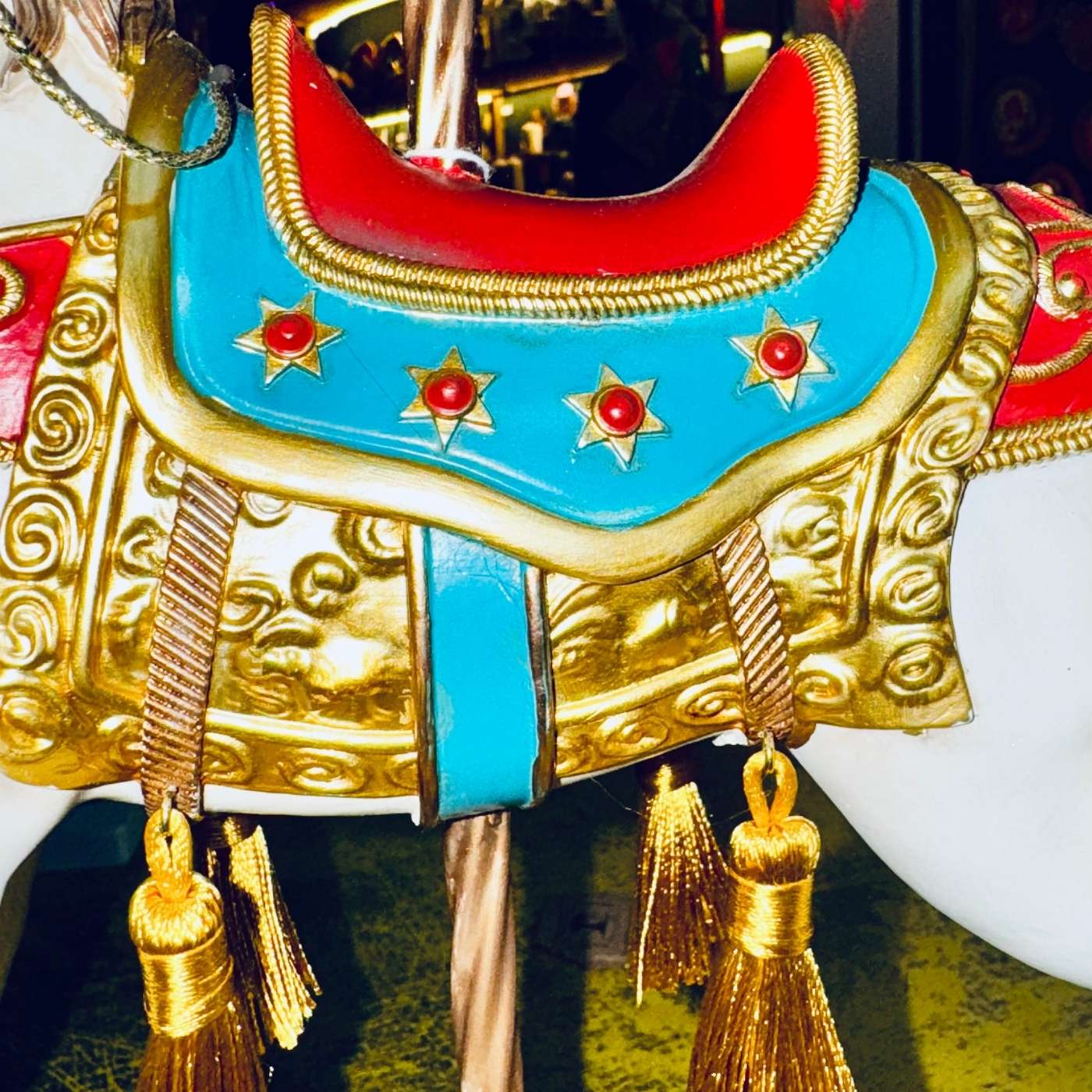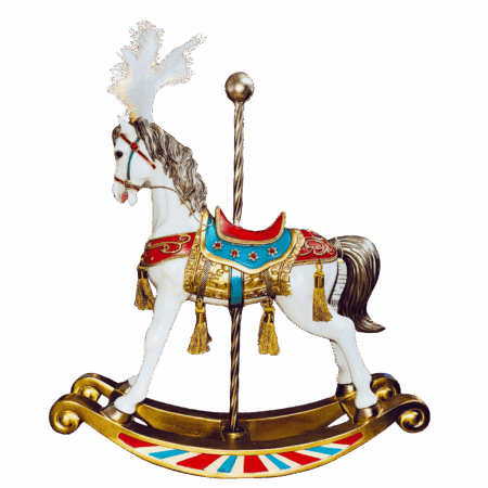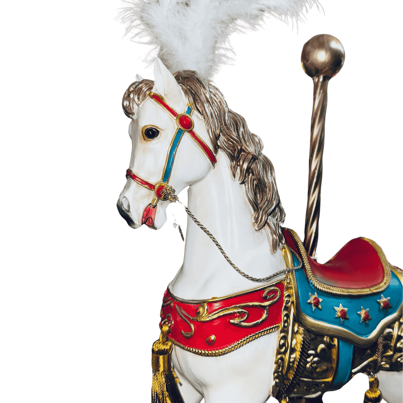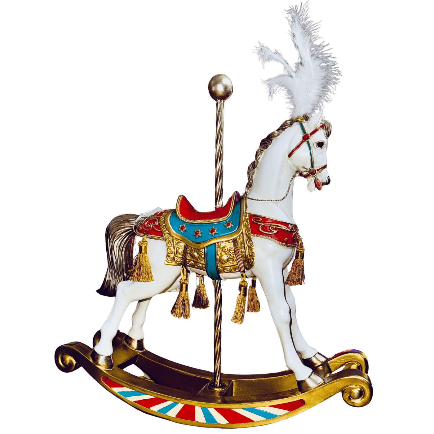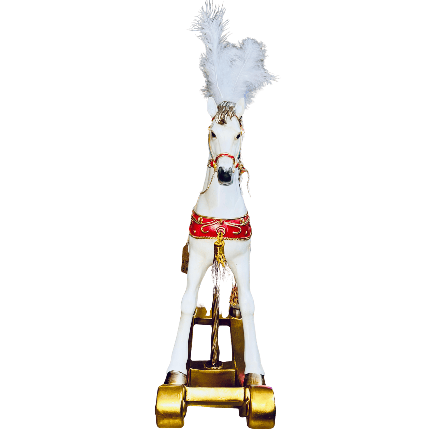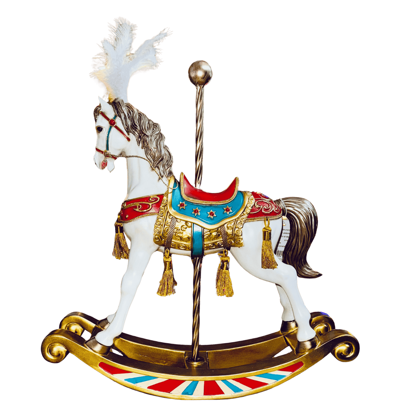 Un cavalluccio a dondolo in resina dallo stile circense, interamente bianco con una finitura lucida che ne mette in risalto le forme eleganti. La sella, riccamente decorata, presenta colori vivaci tipici dell’estetica da circo, come rosso, blu e oro, con motivi ornamentali che ricordano le bardature tradizionali degli spettacoli equestri. Sul capo del cavalluccio spicca un pennacchio bianco soffice e voluminoso, che richiama l’atmosfera festosa del circo. L’insieme trasmette un carattere allegro, decorativo e leggermente rétro, perfetto come elemento scenografico o oggetto da collezione.
