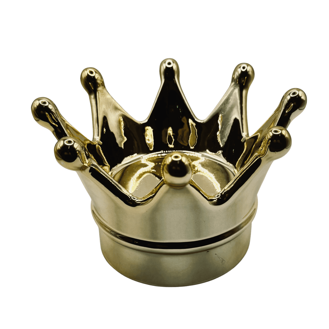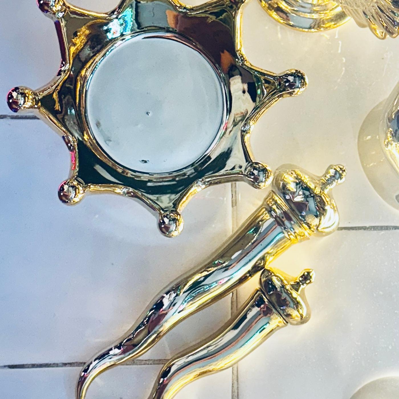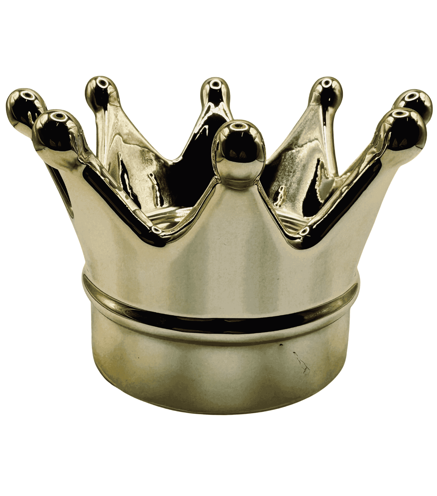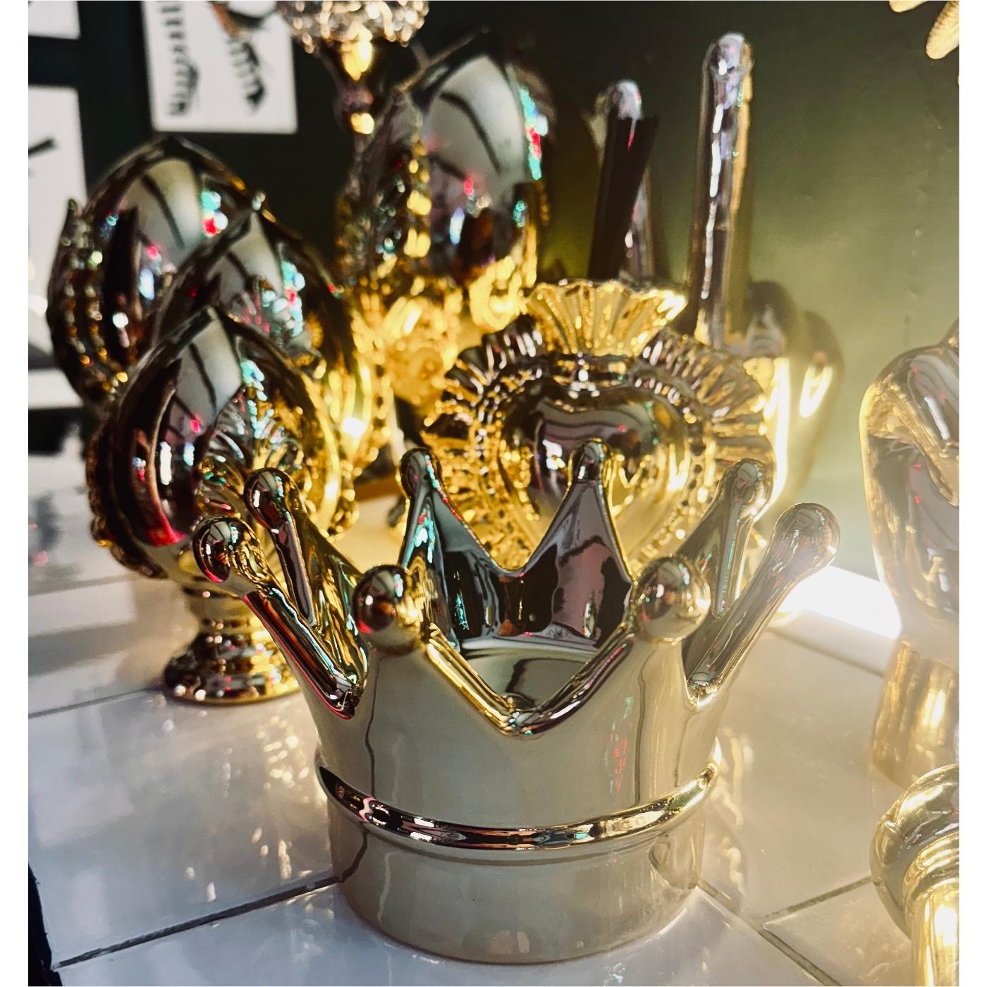 Corona decorativa in porcellana color oro, alta 10 centimetri. Elemento ironico e prezioso, è perfetto come svuotatasche o pezzo da mensola. Dona un tocco pop-luxury a ogni ambiente.