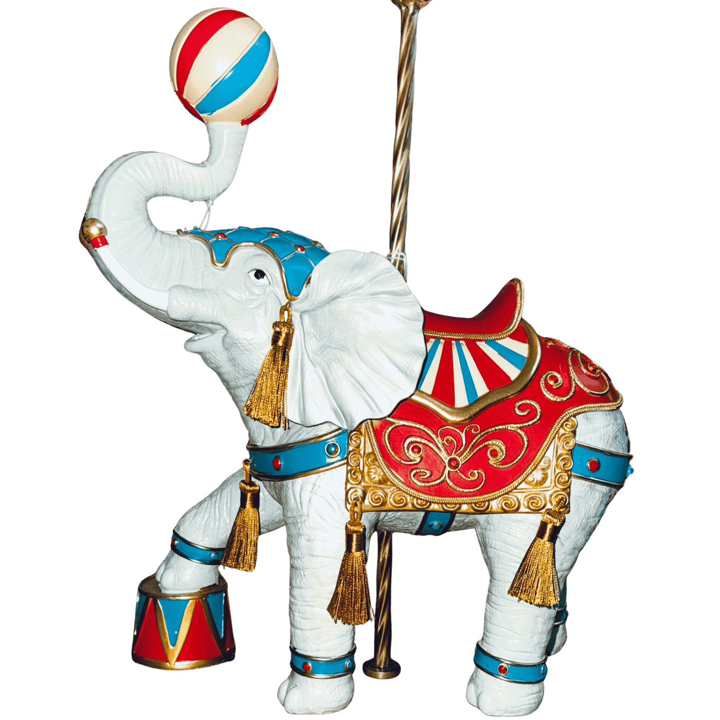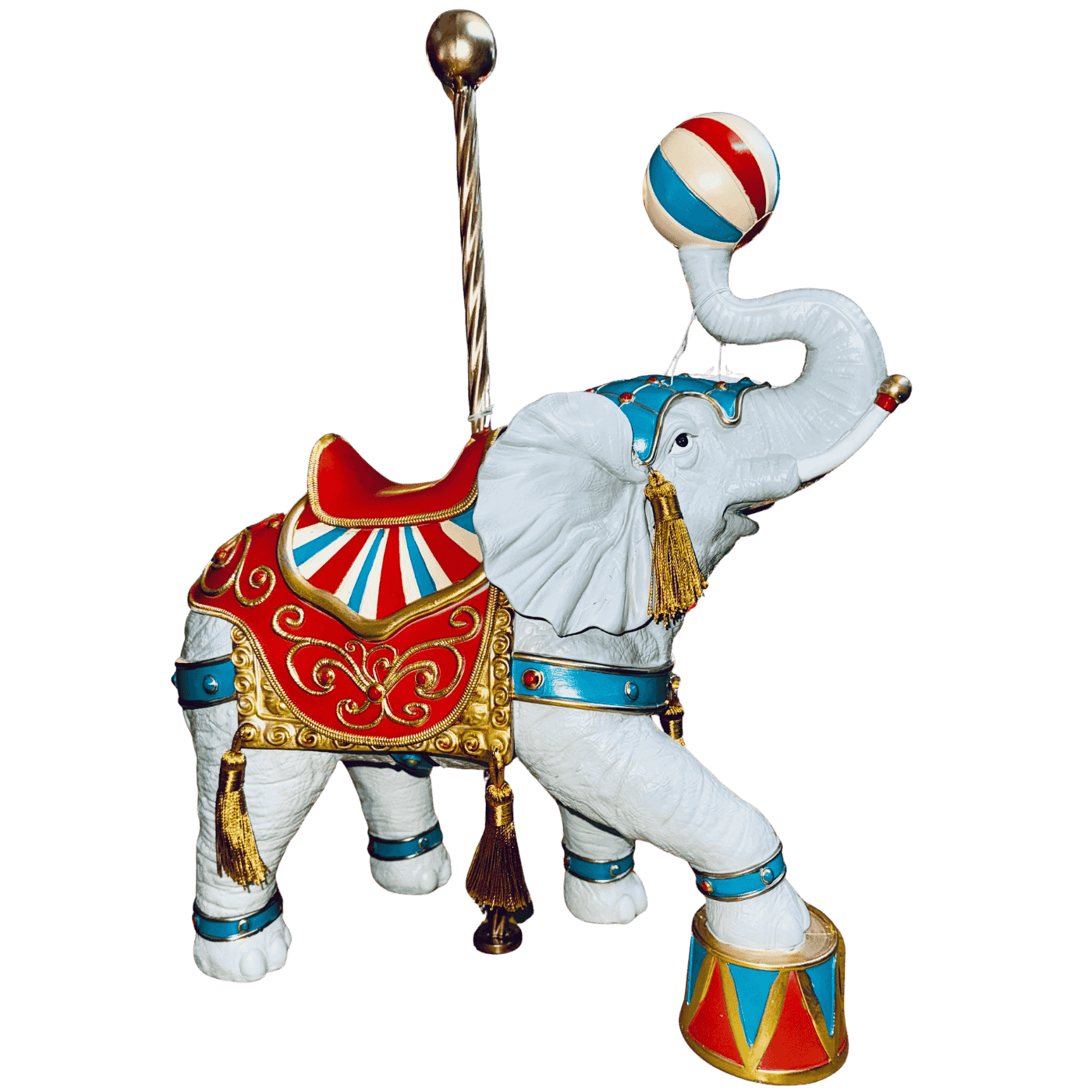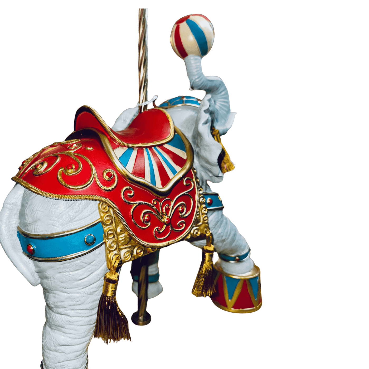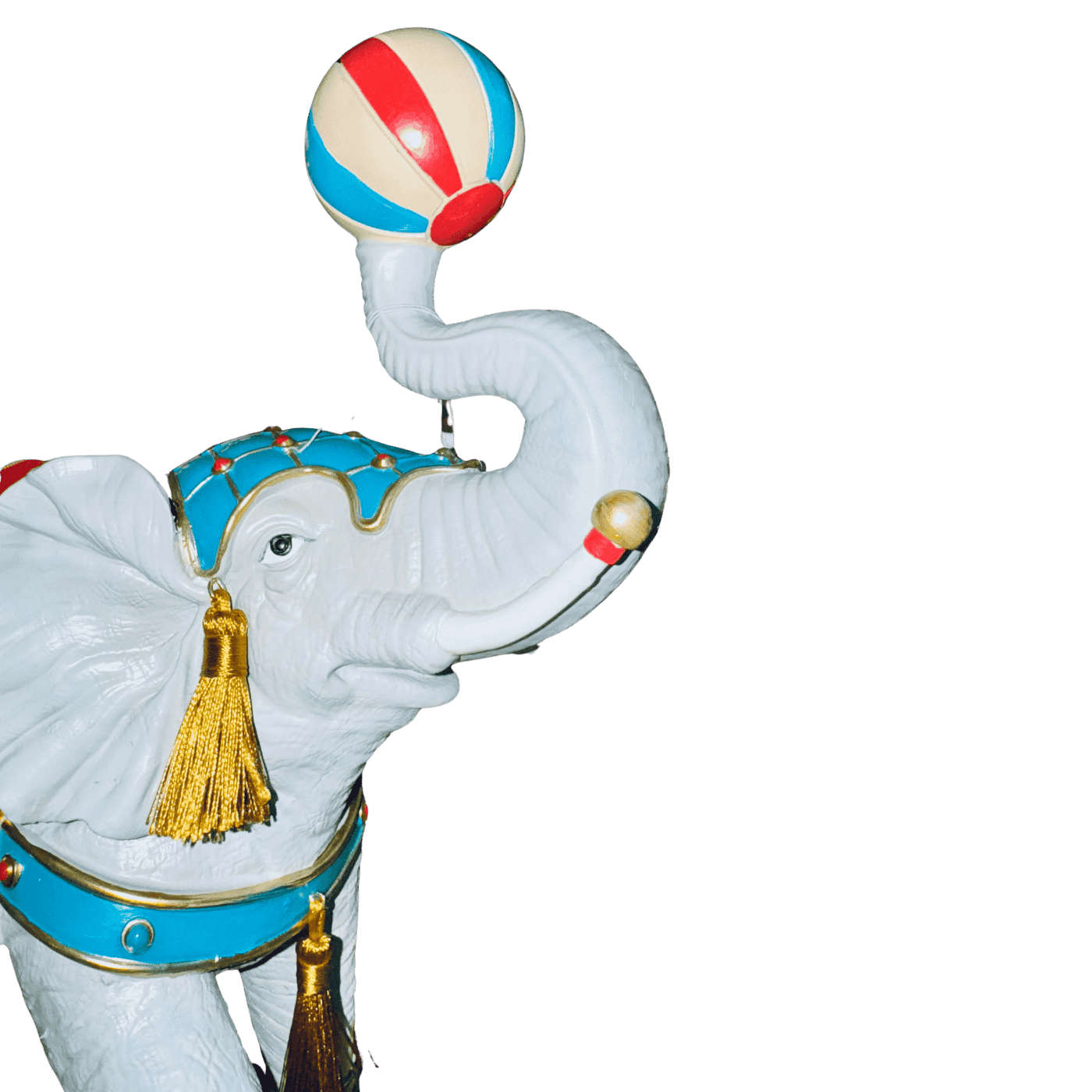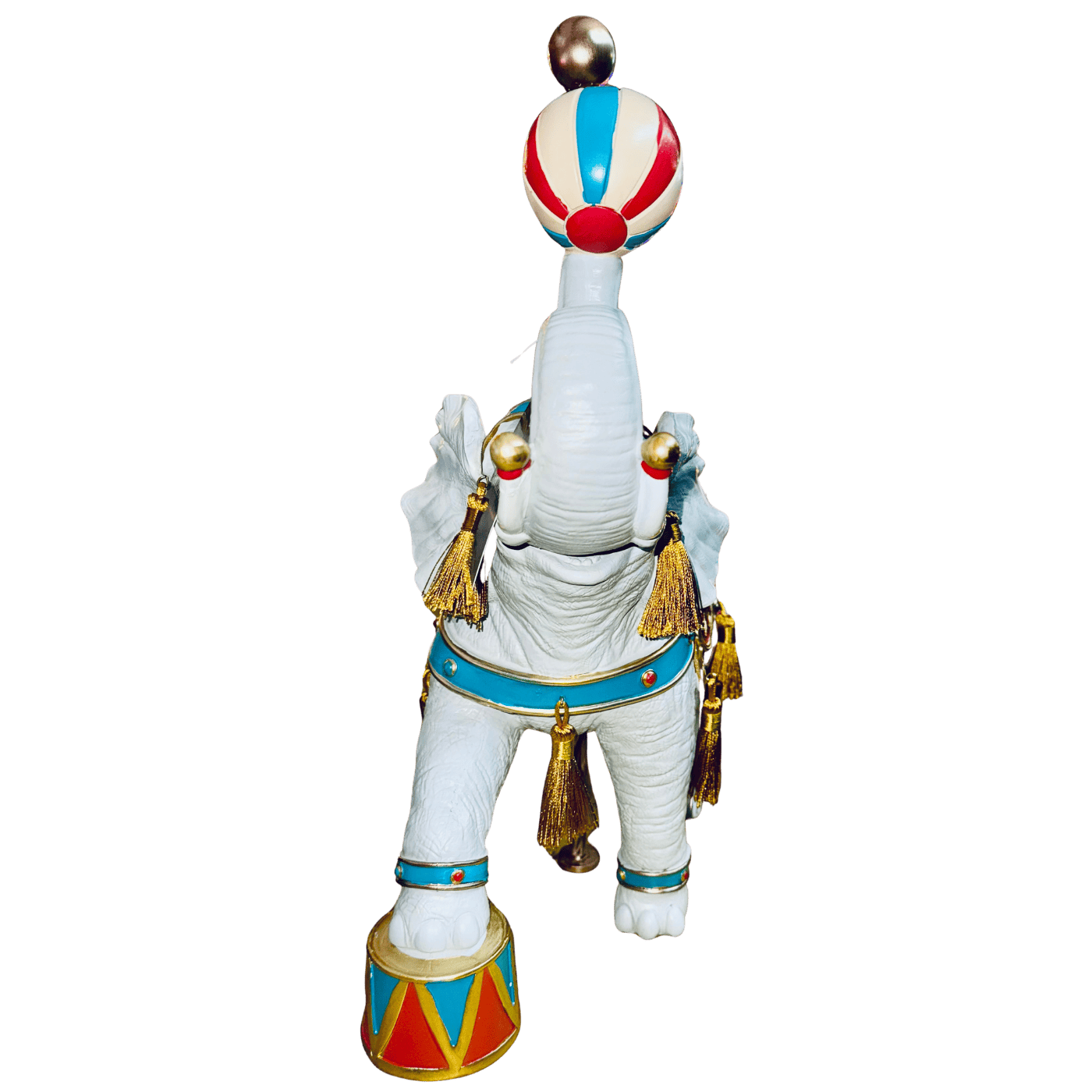 Un elefante in resina dallo stile marcatamente circense, modellato con cura per evidenziare le pieghe della pelle e l’espressività del volto. Sul dorso porta una sella colorata, decorata con motivi geometrici e bordi dorati tipici dell’estetica da circo, nei toni vivaci del rosso, blu e oro. La posa dell’elefante è dinamica: la proboscide è sollevata verso l’alto e regge una palla decorativa, come in un numero di equilibrio classico degli spettacoli circensi. L’insieme trasmette un senso di movimento, gioiosità e artigianalità, rendendo il pezzo ideale come oggetto decorativo o da collezione.