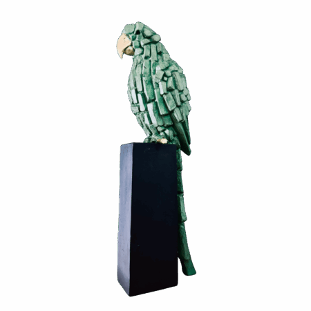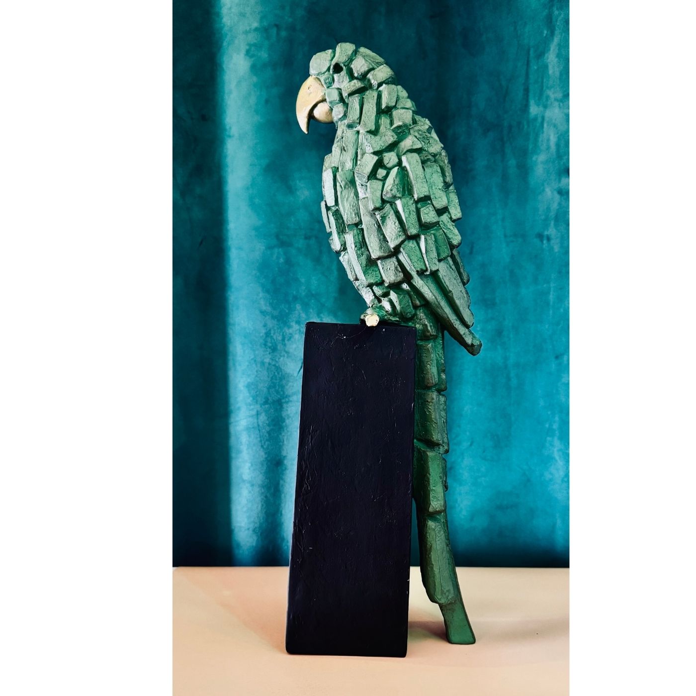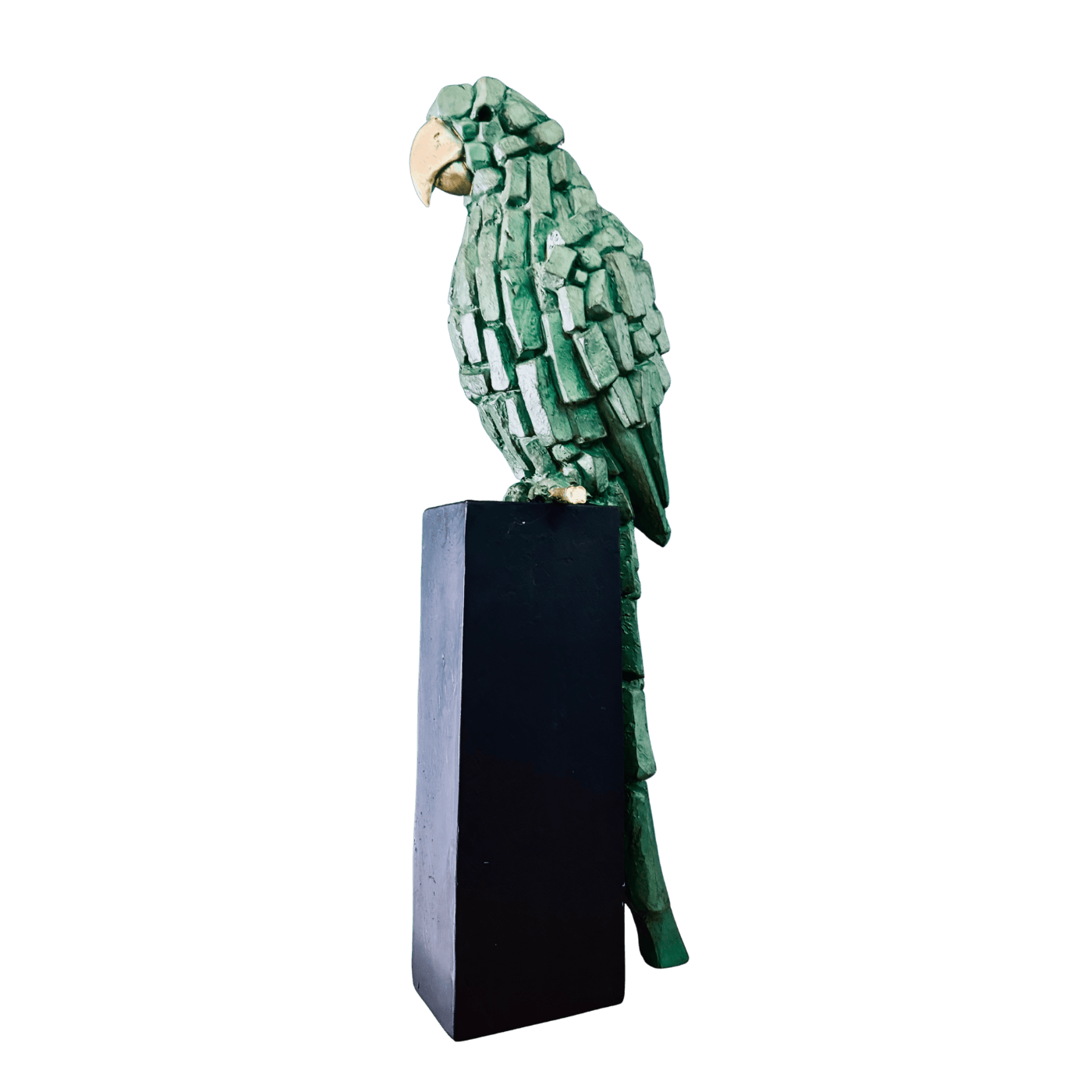 Pappagallo decorativo in legno dipinto verde, appollaiato su trespolo. Un oggetto d’arredo esotico e fuori dal comune, ideale per aggiungere un tocco jungle chic e originale a mensole, vetrine o angoli relax.