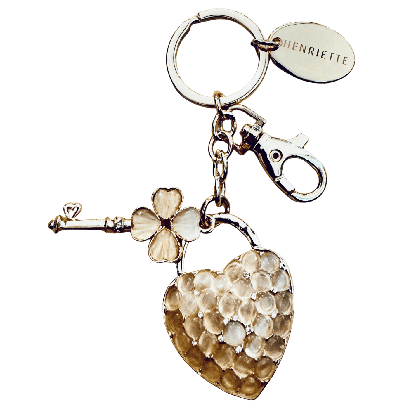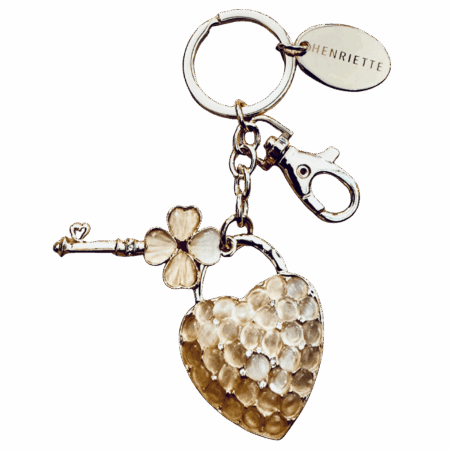 “Charm in metallo dorato per borsa o portachiavi, arricchito da scintillanti strass. Un accessorio raffinato e originale, perfetto come regalo speciale per sé o per una persona cara.”