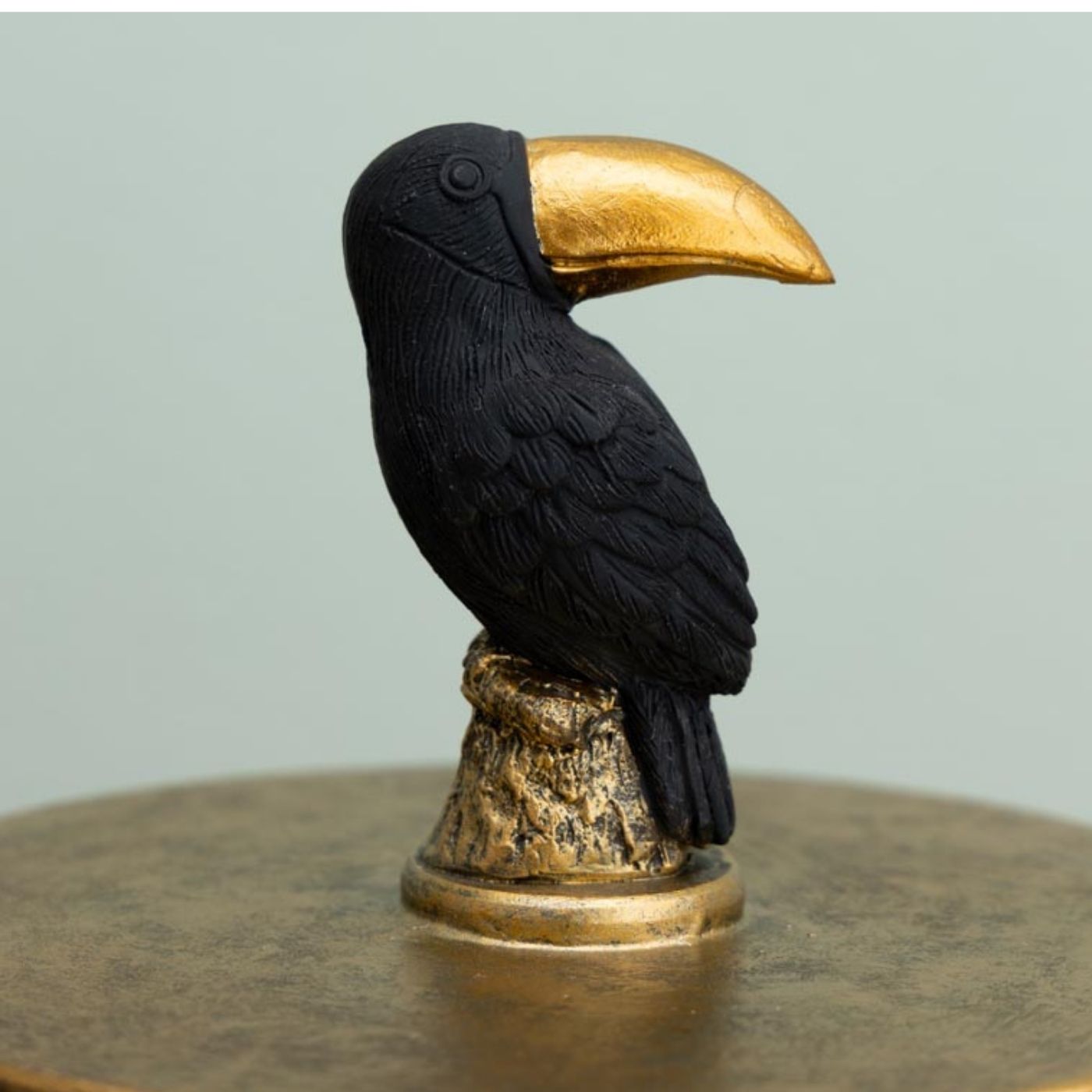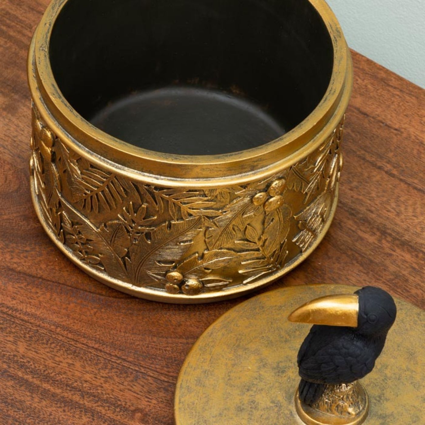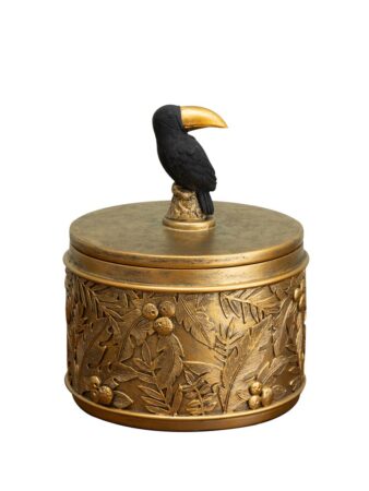 Scatola decorativa in metallo dorato con coperchio a forma di tucano. Un complemento ironico e fuori dal comune, ideale per custodire piccoli oggetti o decorare in modo eclettico librerie e mensole.