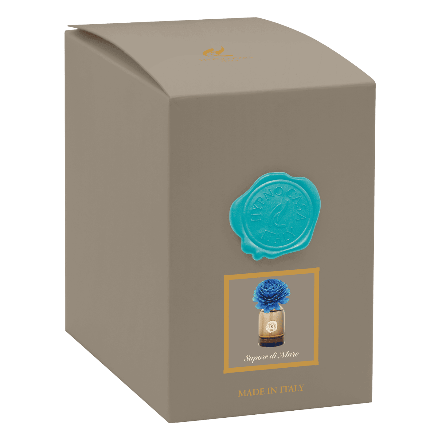 Diffusore con fiore decorativo da 250 ml – Colore blu. Sapore di Mare è una sinfonia fresca e salmastra con agrumi, salvia, coriandolo e note marine. Rinnova l’ambiente con la sua energia marina e pulita.