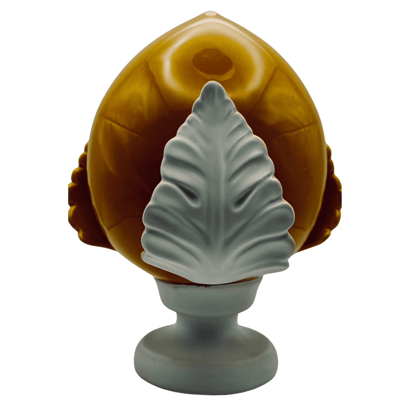 Pumo decorativo in ceramica con bocciolo color ambra e foglie bianche. Simbolo di buon auspicio, è perfetto come oggetto d’arredo su credenze, mensole o tavoli. Aggiunge calore e raffinatezza.