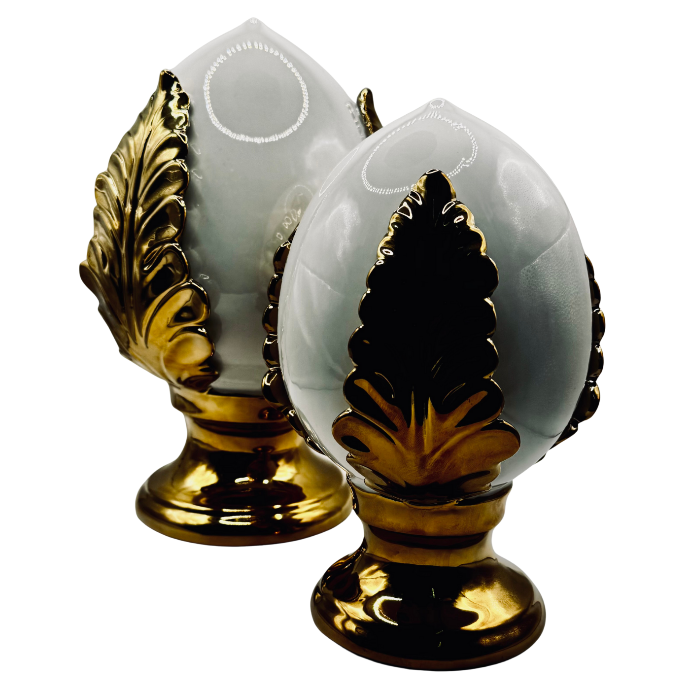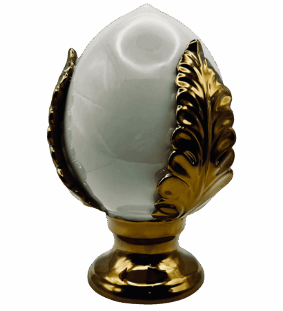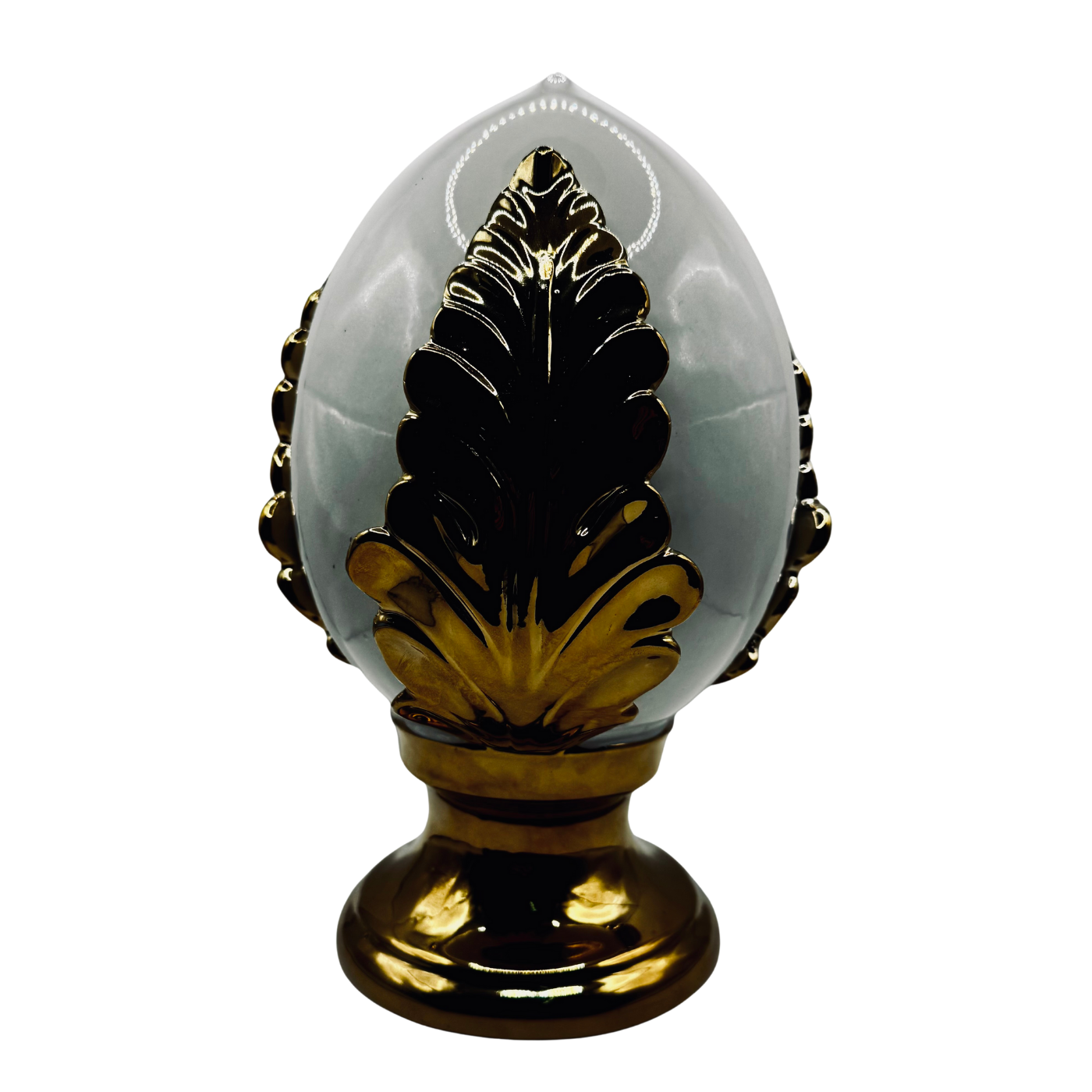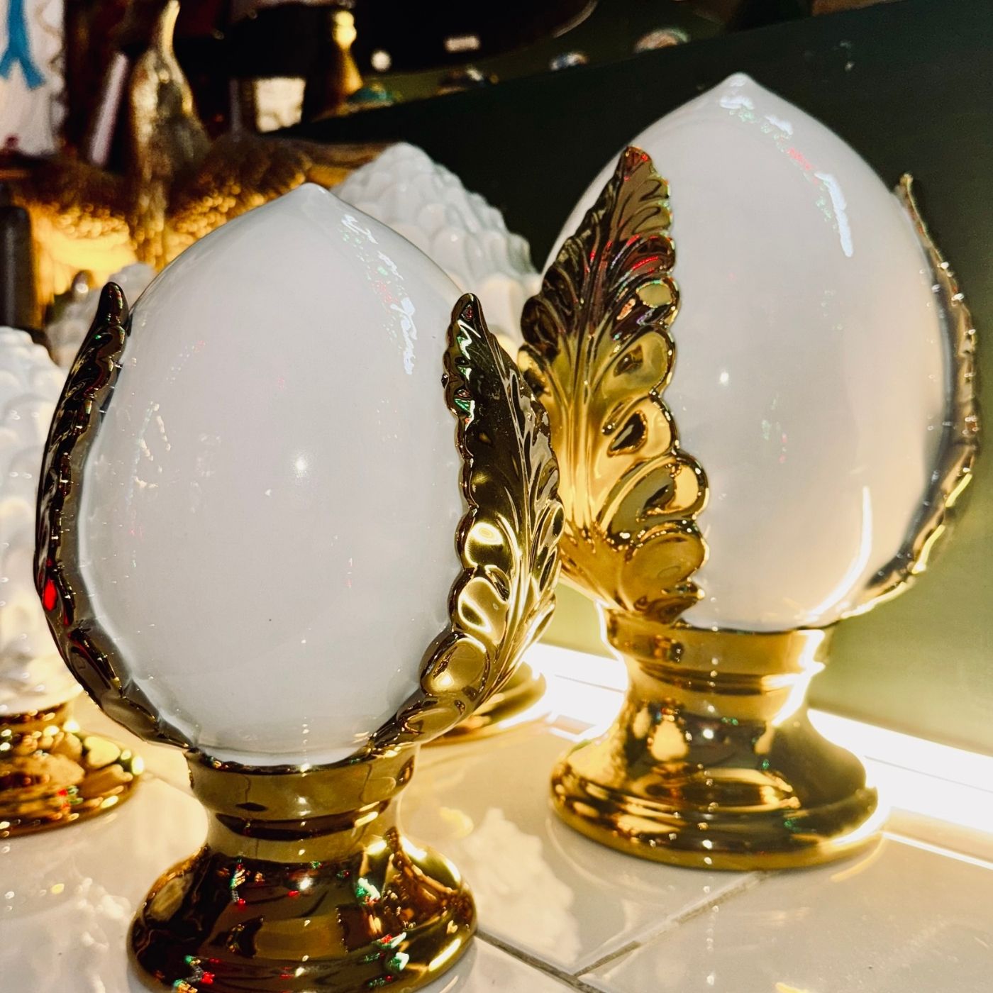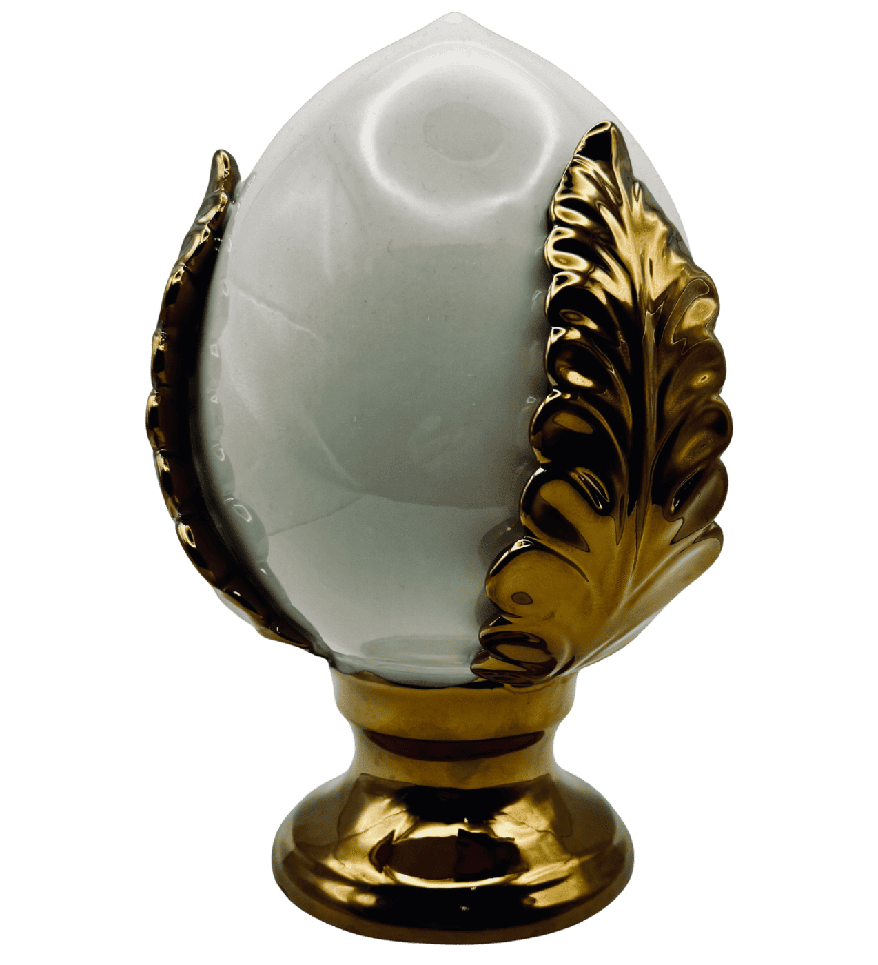 Pumo decorativo con foglie oro e bocciolo bianco alto 27 centimetri. Oggetto elegante e prestigioso che dona luce e raffinatezza agli ambienti interni. Perfetto per decorare tavolini, mensole e come preziosa idea regalo.
