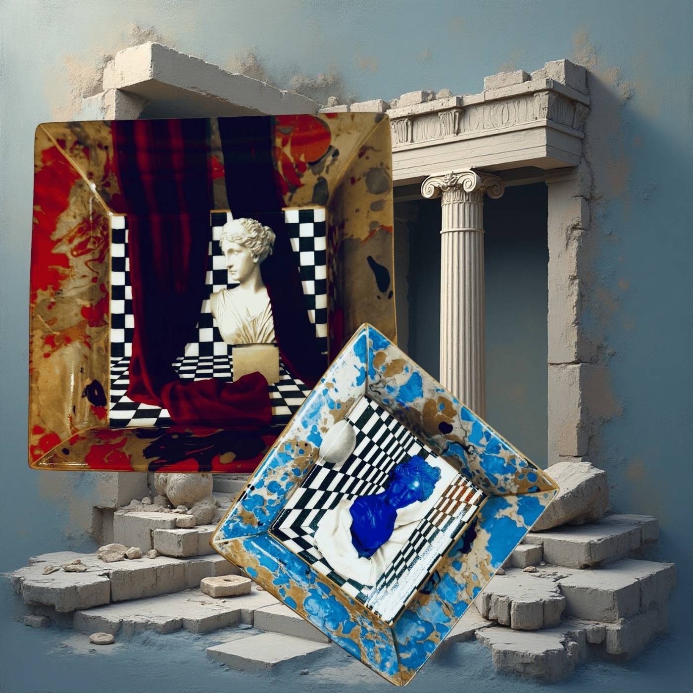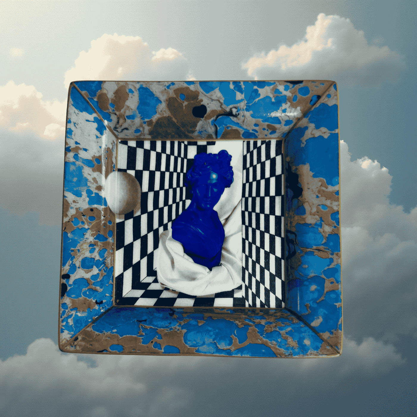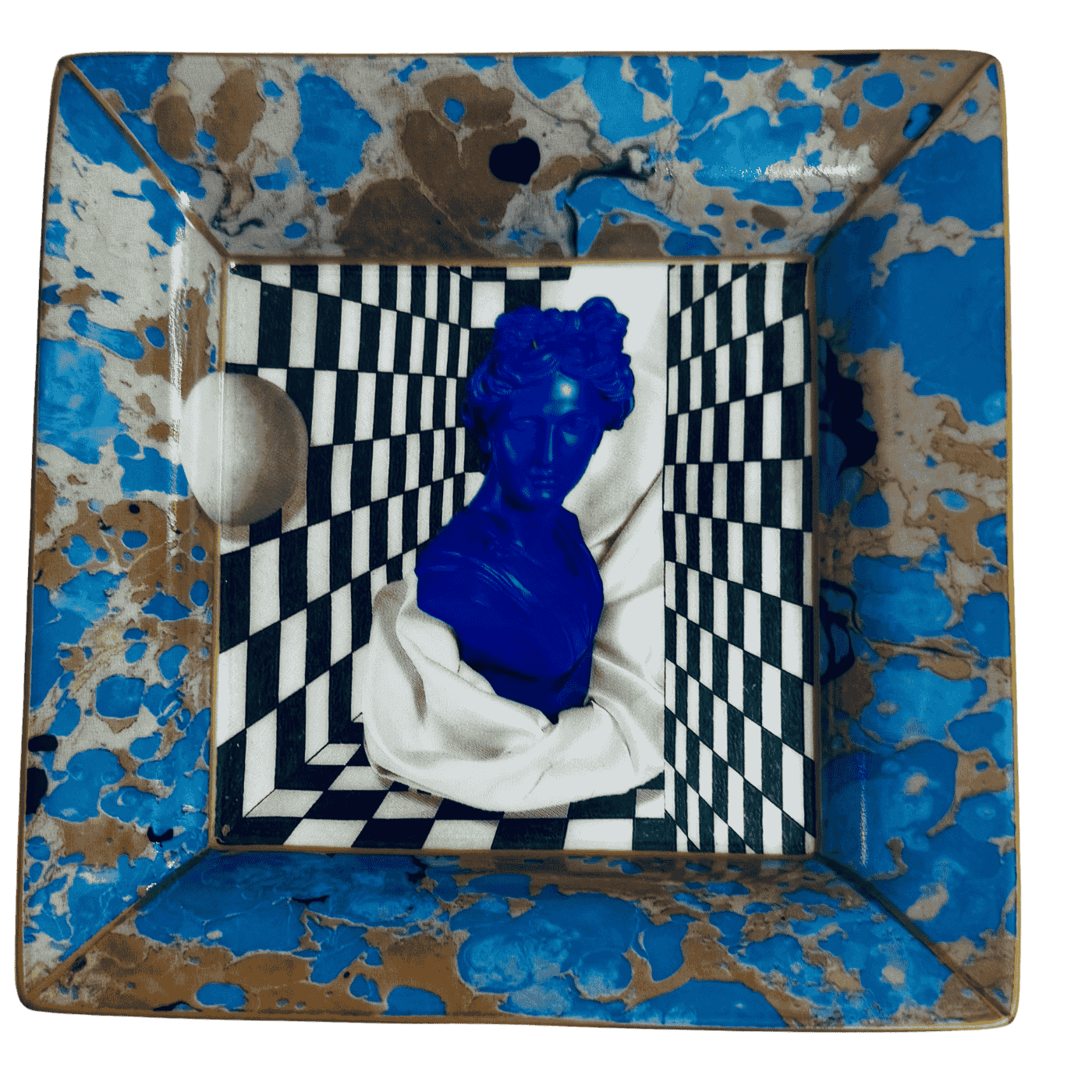 Svuotatasche quadrato 14×14 cm realizzato in porcellana finissima, impreziosito da una stampa multicolor che reinterpreta il mondo classico in tono pop. Un accessorio d’arredo originale e di forte impatto visivo, perfetto per dare carattere a ingressi, camere o zone living. Ideale per riporre piccoli oggetti quotidiani con stile.