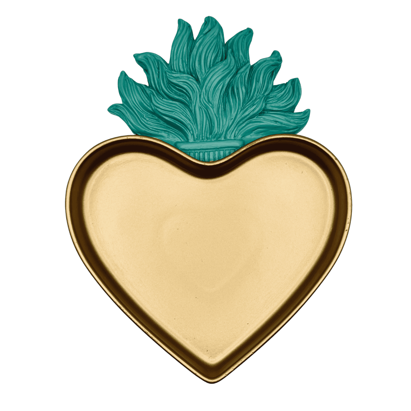Svuotatasche decorativo a forma di cuore sacro con fiamma, in resina color oro e celeste. Un mix tra sacro e contemporaneo, ideale per ambienti spiritual chic. Oggetto d’appoggio suggestivo per casa o studio.