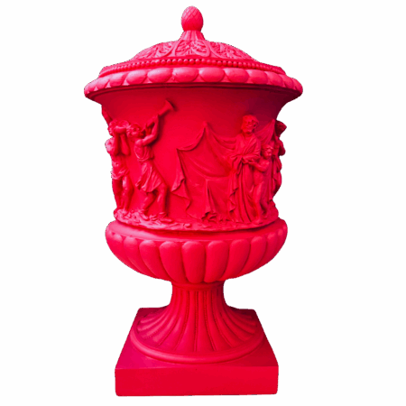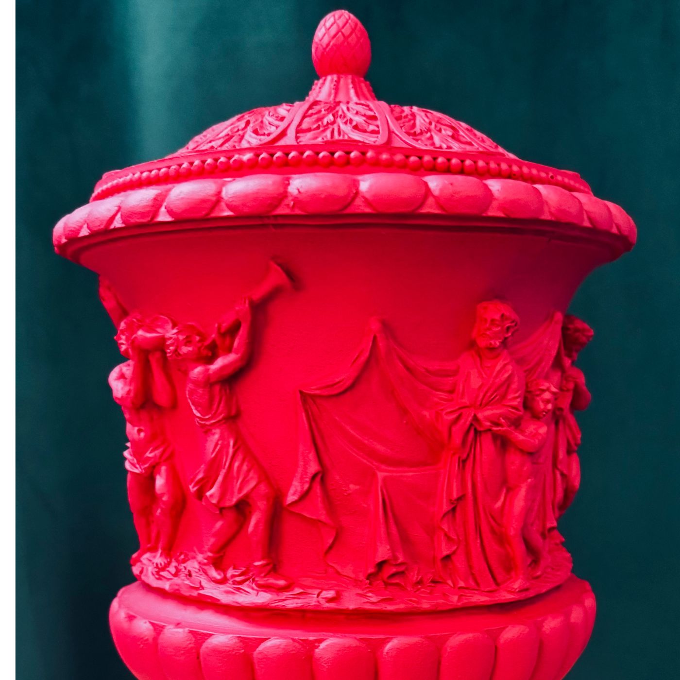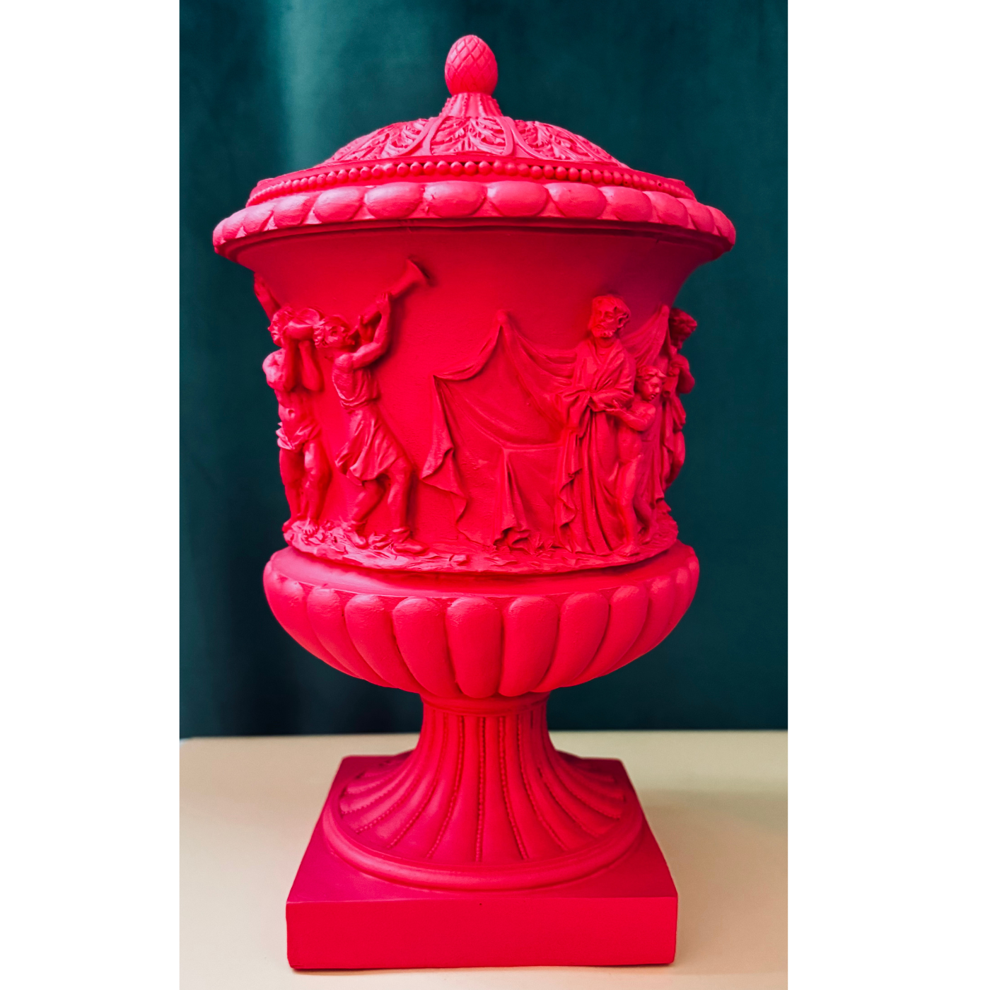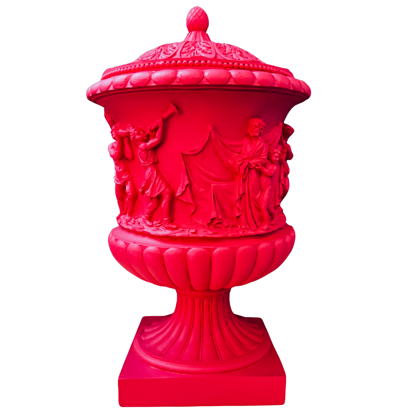 Giara in resina rossa, finitura opaca e forma piena. Elemento di design decorativo per spazi audaci o arredamenti monocromatici.