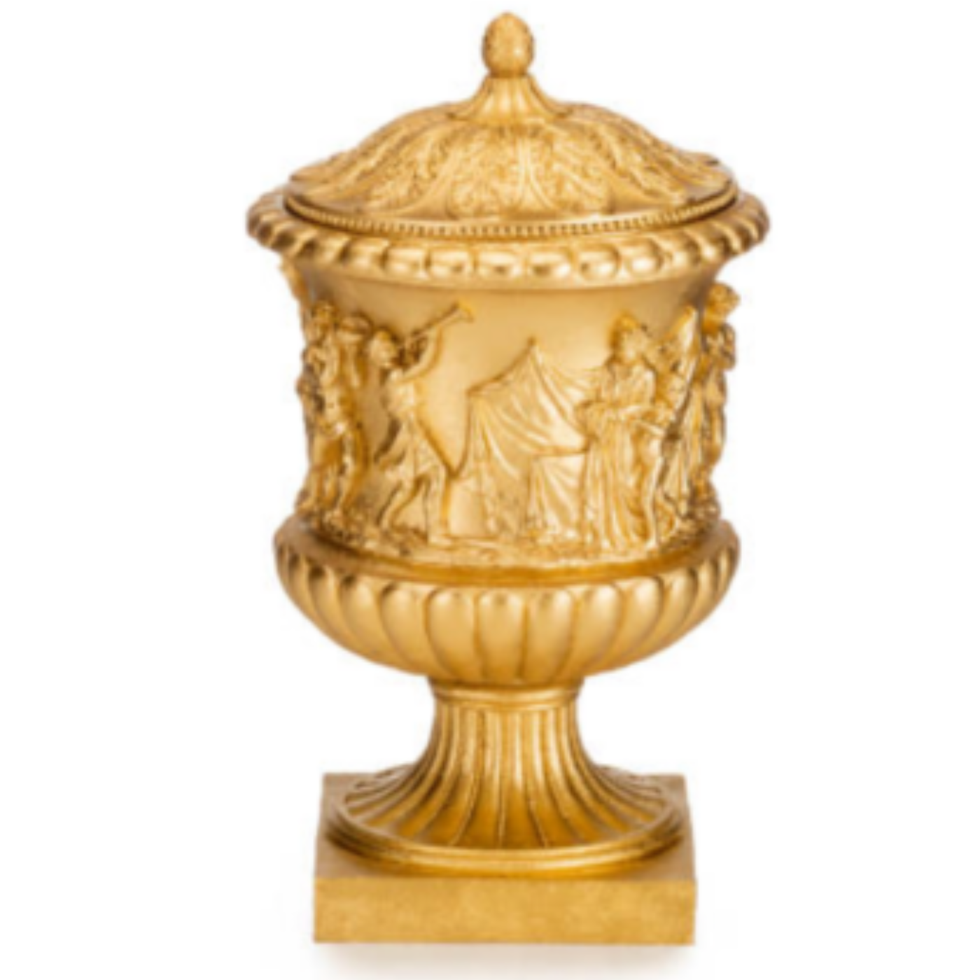 Potiche decorativa in resina color oro, altezza 32 cm. Linee eleganti e finitura brillante per aggiungere un tocco luxury a salotti, ingressi o tavoli importanti.