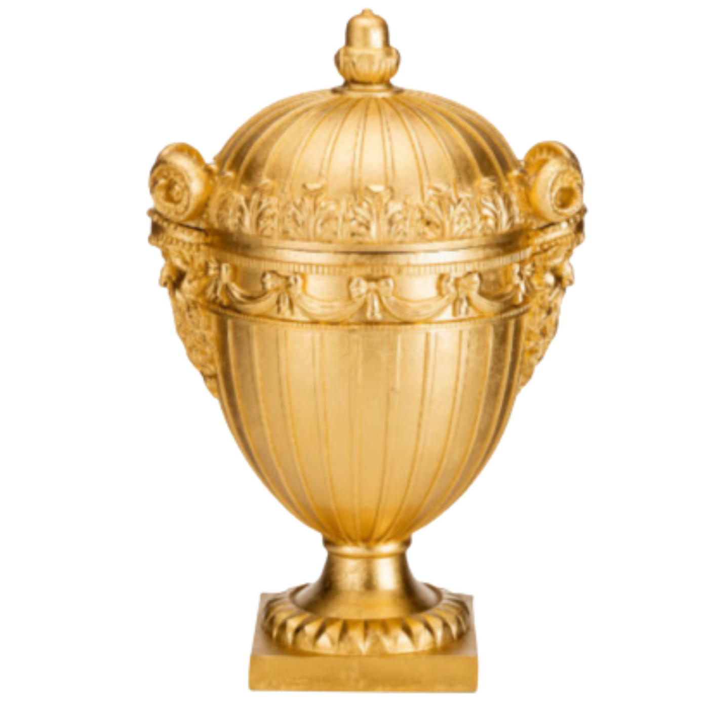 Potiche in resina stile neo pop oro, altezza 49 cm. Un oggetto d’arredo scenografico che unisce design moderno e gusto classico. Perfetta da sola o in coppia.