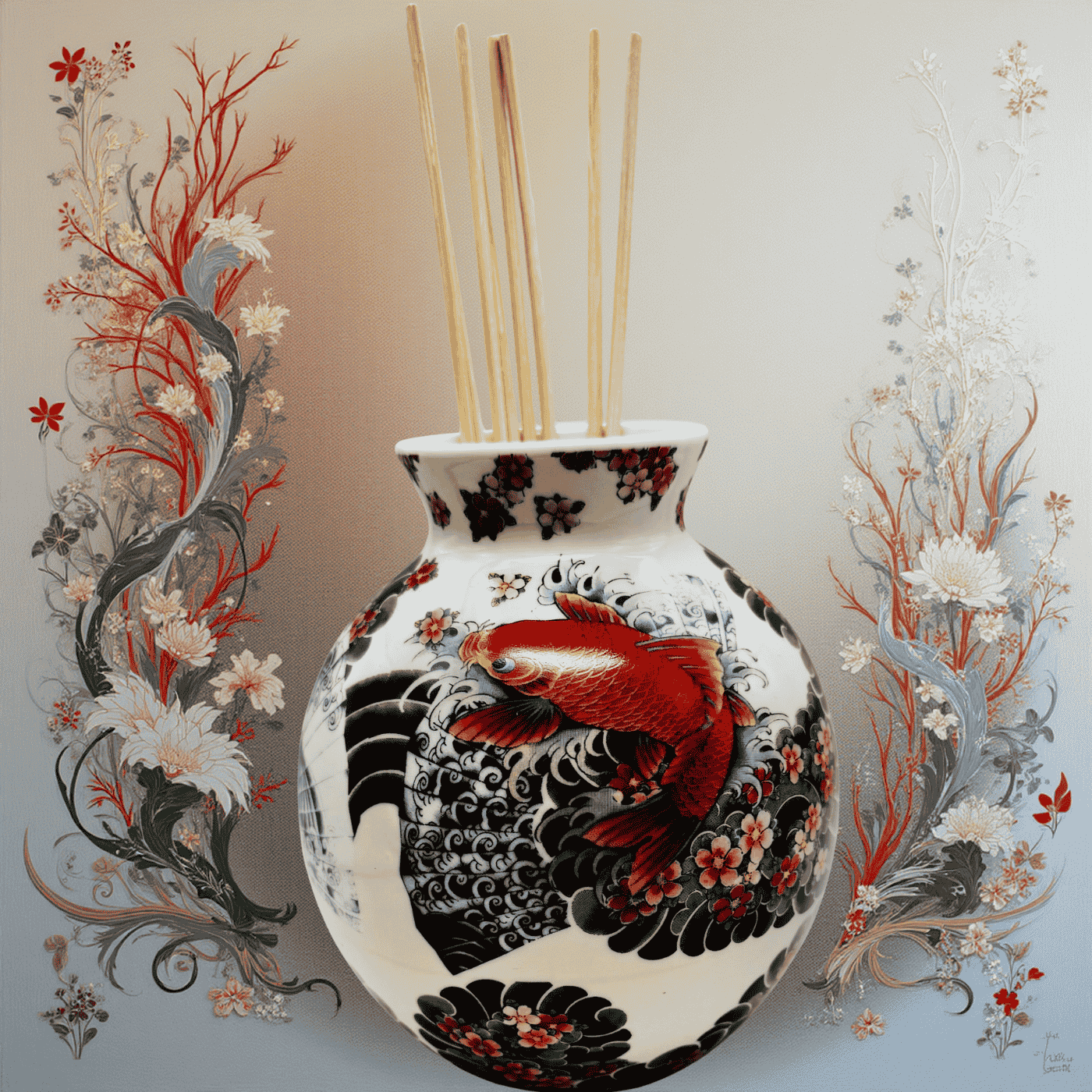 Questo diffusore tondo in porcellana unisce design contemporaneo e simbolismo tradizionale grazie al raffinato motivo “tattoo age” raffigurante carpe stilizzate. Le linee decise e l’estetica ispirata all’arte del tatuaggio donano al pezzo un carattere moderno e ricercato. Il contenitore, realizzato in porcellana liscia e di alta qualità, offre un aspetto elegante e una piacevole sensazione tattile. Perfetto come diffusore di fragranze per ambienti o come oggetto decorativo, aggiunge un tocco di stile distintivo a qualsiasi spazio della casa.(liquido a parte)