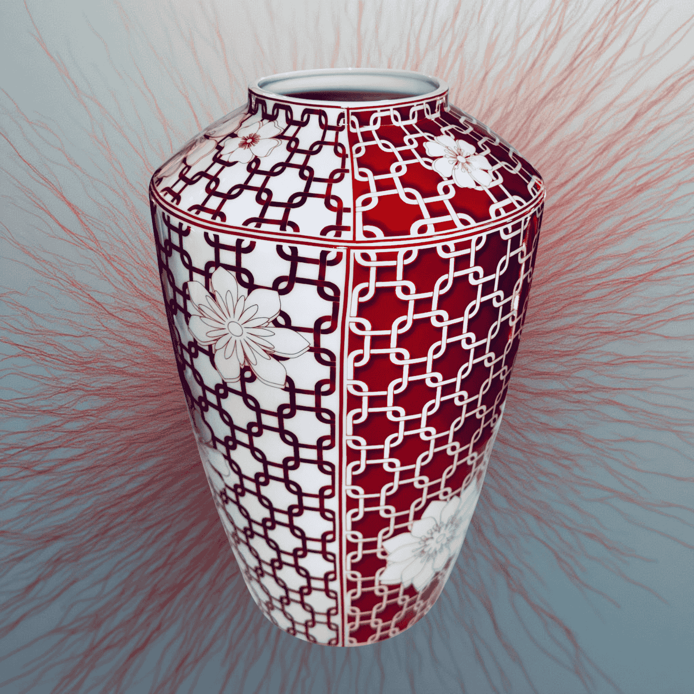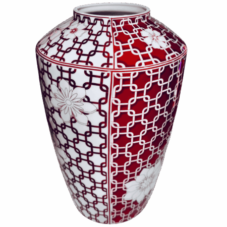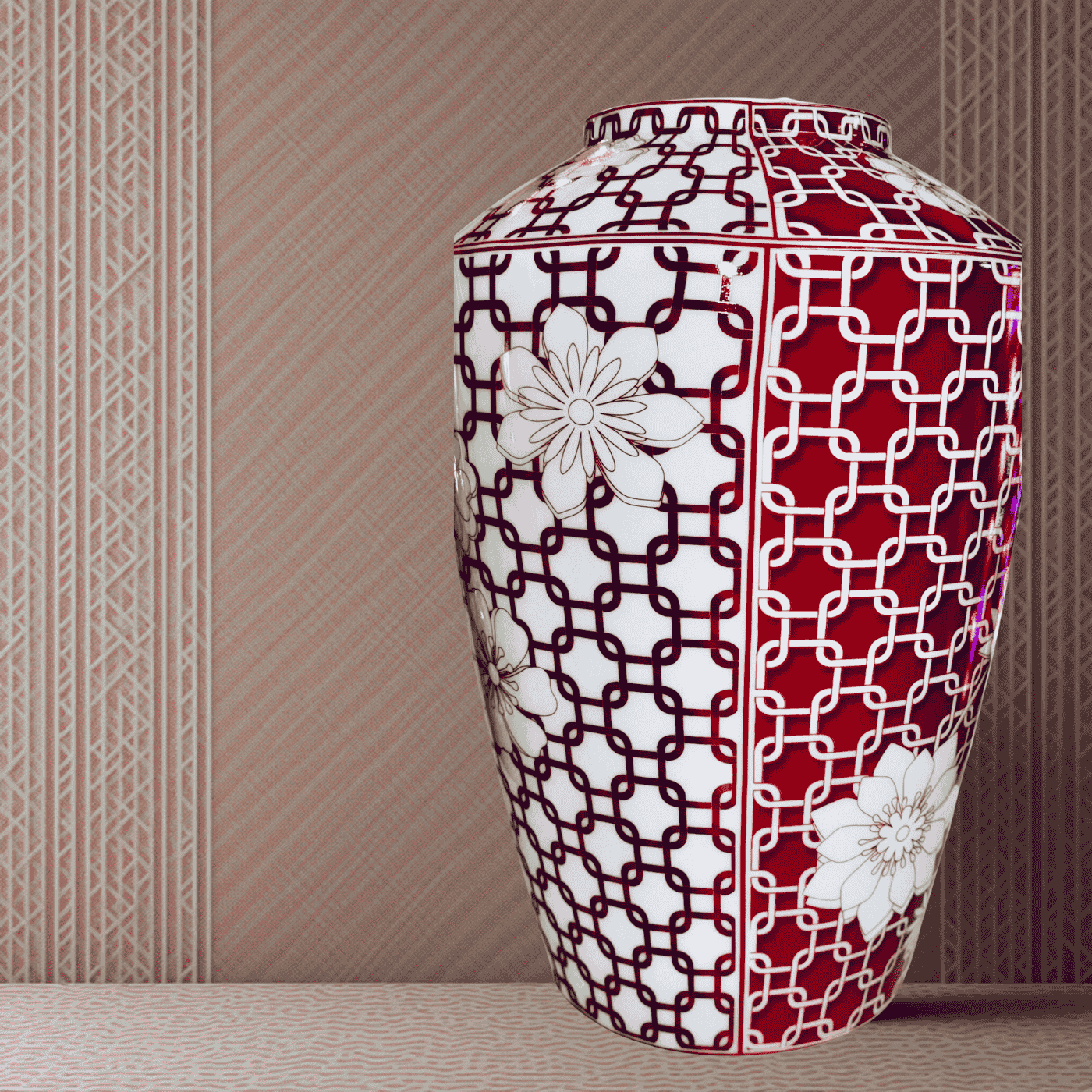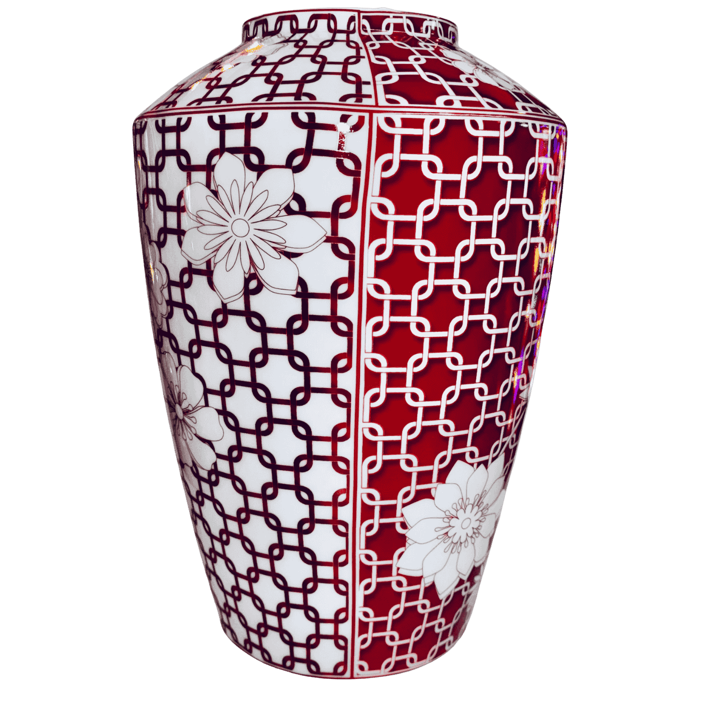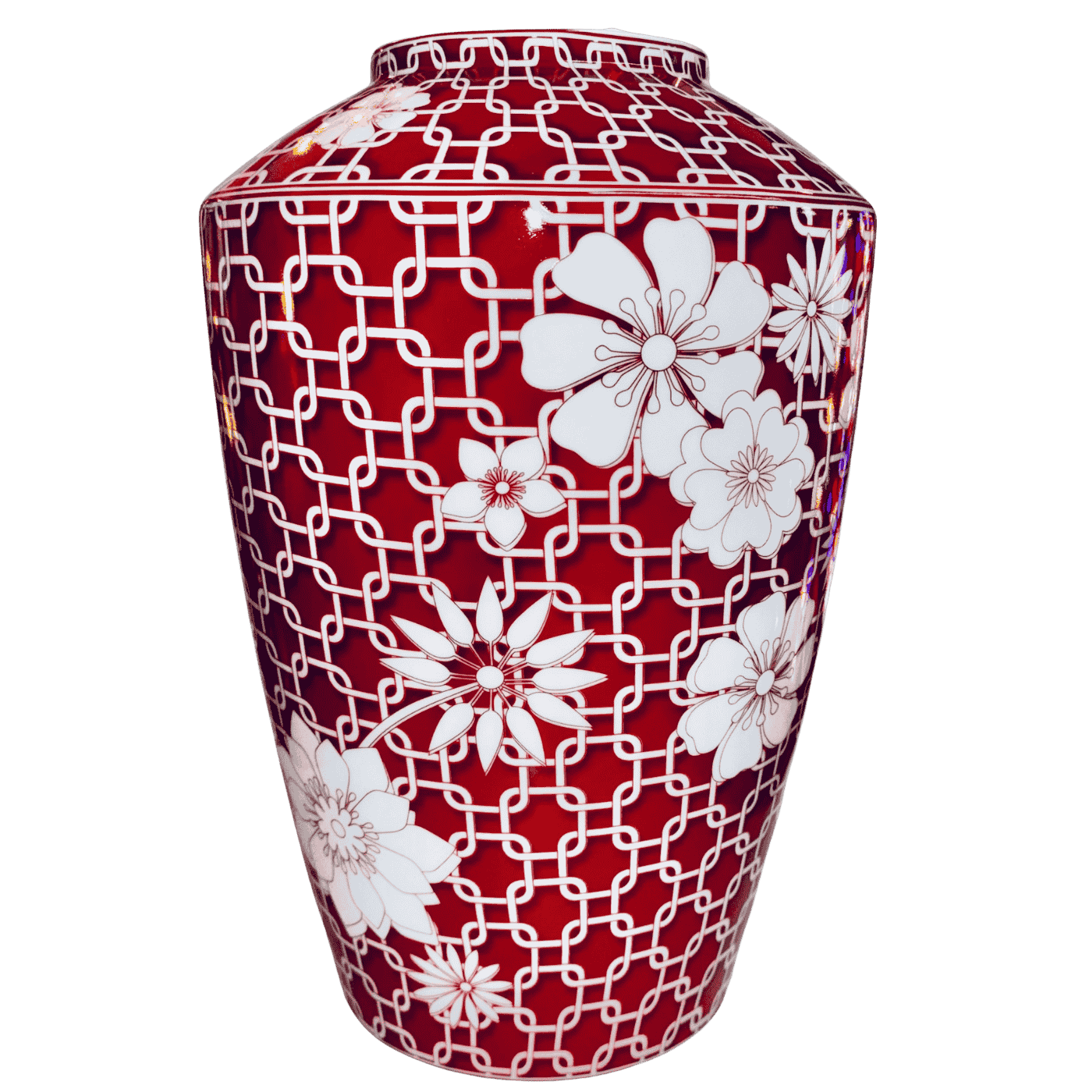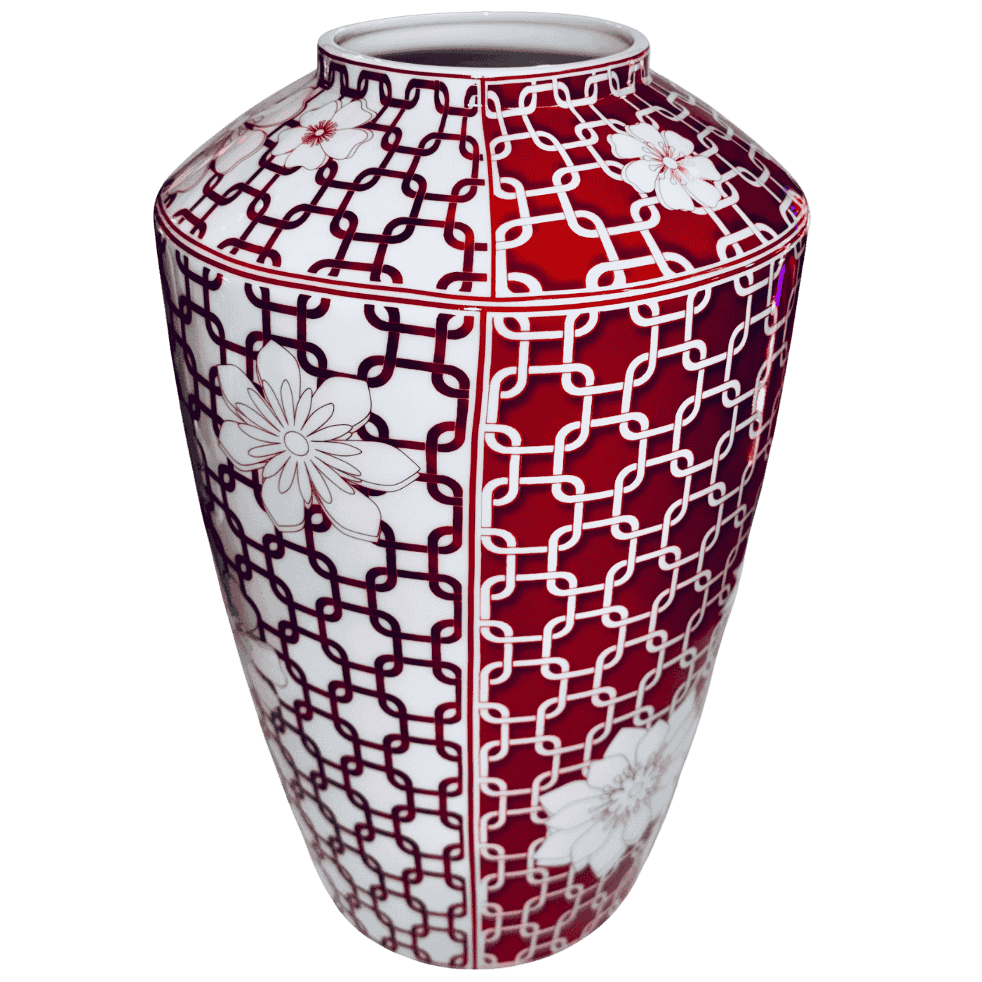 Raffinato vaso in porcellana caratterizzato da un elegante design Decò, con sfondo bianco e rosso impreziosito da delicati fiori bianchi. Perfetto come elemento decorativo per arricchire ambienti moderni o classici, dona un tocco di stile e luminosità agli spazi, valorizzando fiori freschi o composizioni secche.