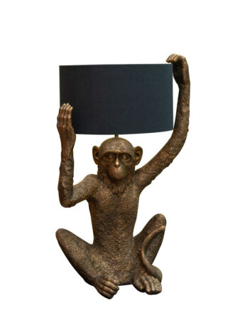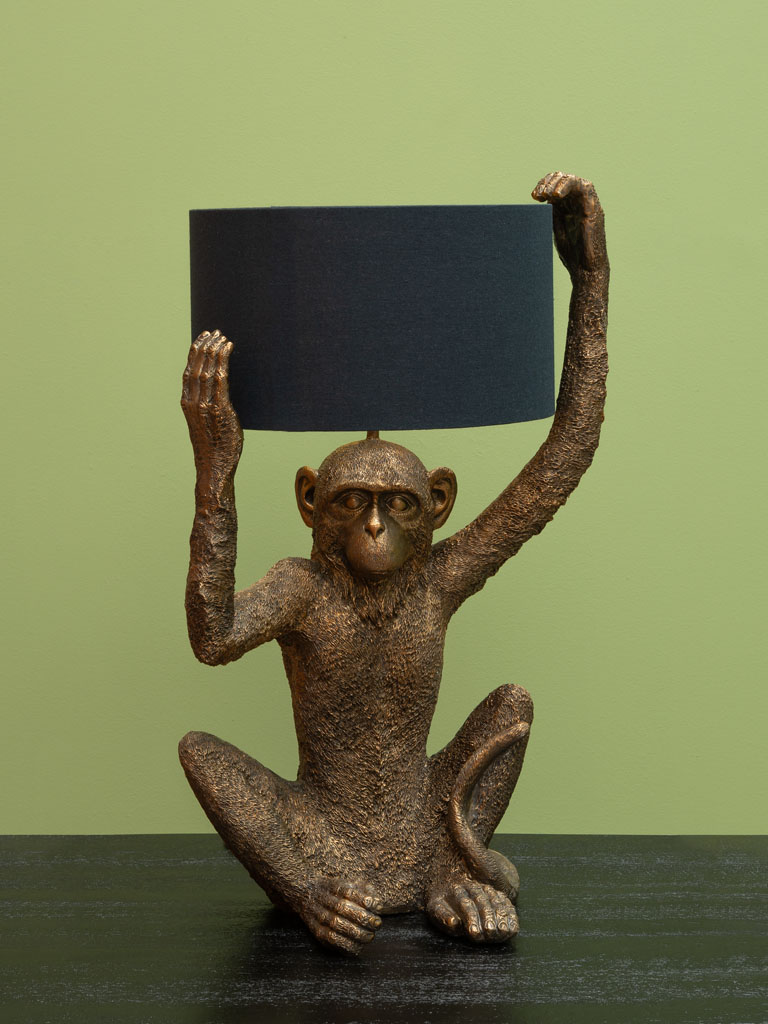 Lampada da tavolo con scimmia dorata in resina e paralume in lino. Una figura ironica e d’impatto, ideale per ambienti creativi e giocosi. Un oggetto decorativo che si fa notare.