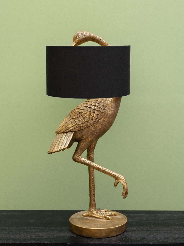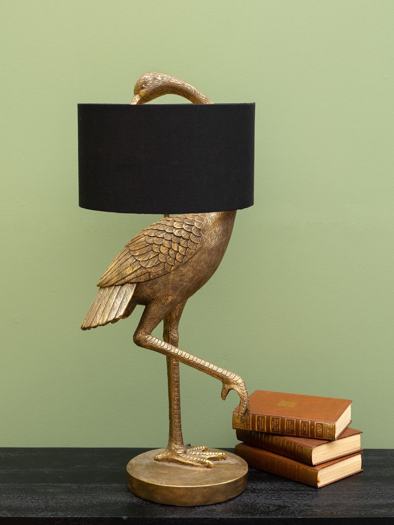 Lampada da tavolo con uccello dorato in resina e paralume in cotone nero. Un oggetto scenografico e raffinato, perfetto per aggiungere un tocco glamour e artistico a scrivanie o consolle.