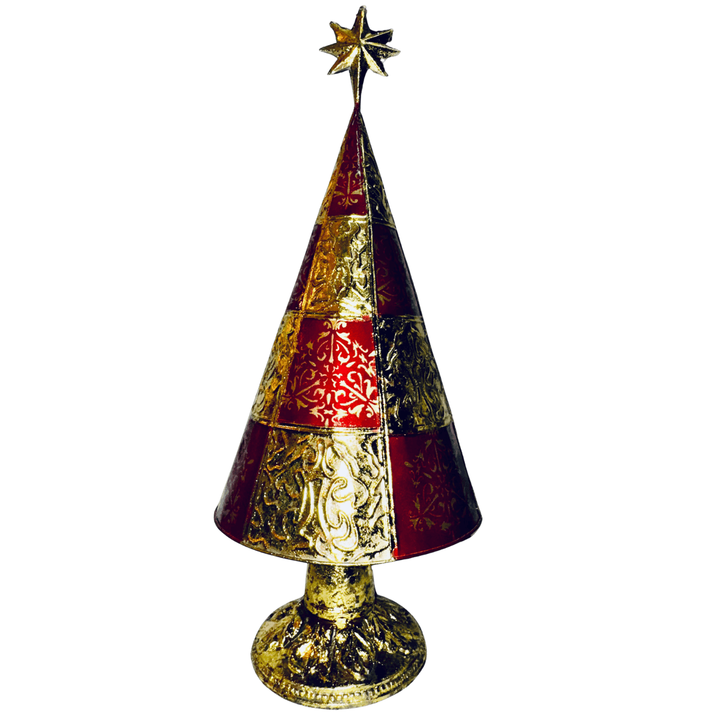 Raffinata decorazione natalizia in latta lavorata, finemente dipinta nei toni oro e bordeaux, simboli di eleganza e tradizione.